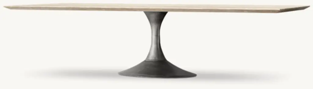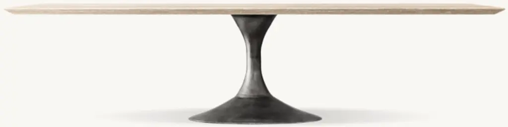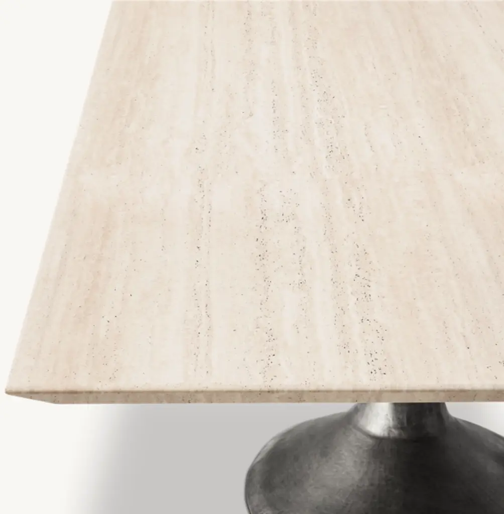 Paying homage to the sweeping lines of midcentury furnishings, our table is a study in simplicity. Defined by its balanced proportions and arching, sculptural curves, our interpretation pairs a cast steel pedestal base with a beveled-edge top, handcrafted of Italian travertine or marble. ALSO AVAILABLE IN WOODSHOP THE ENTIRE COLLECTION
