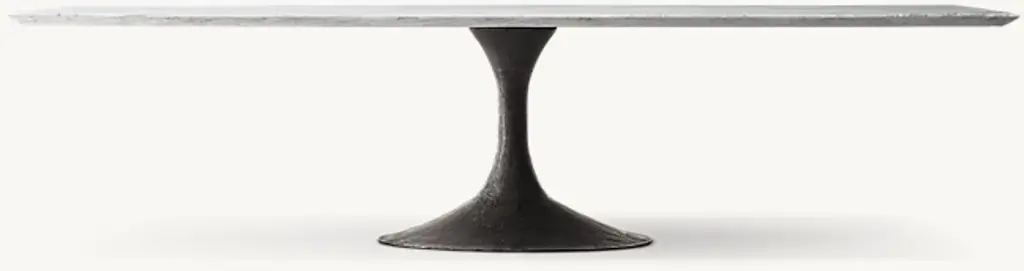 Paying homage to the sweeping lines of midcentury furnishings, our table is a study in simplicity. Defined by its balanced proportions and arching, sculptural curves, our interpretation pairs a cast steel pedestal base with a beveled-edge top, handcrafted of Italian travertine or marble. ALSO AVAILABLE IN WOODSHOP THE ENTIRE COLLECTION