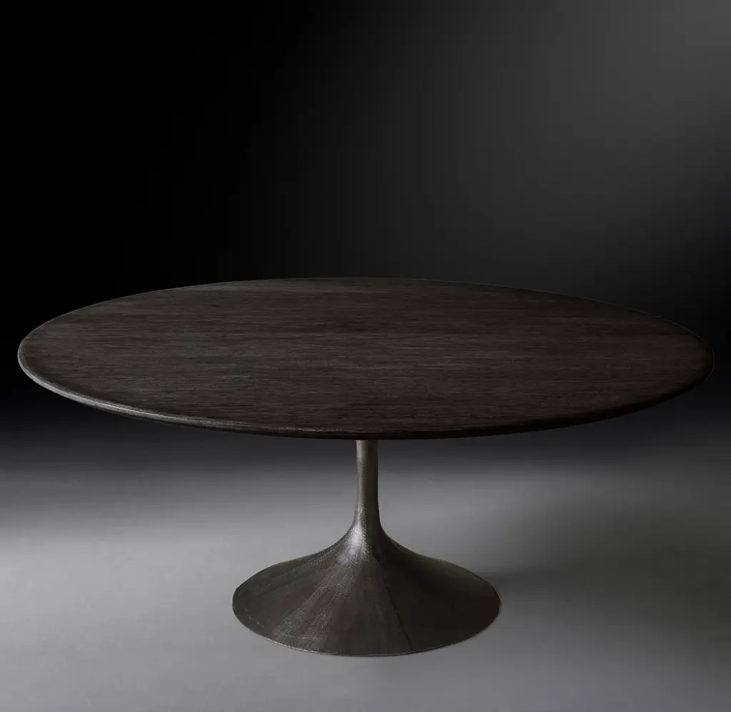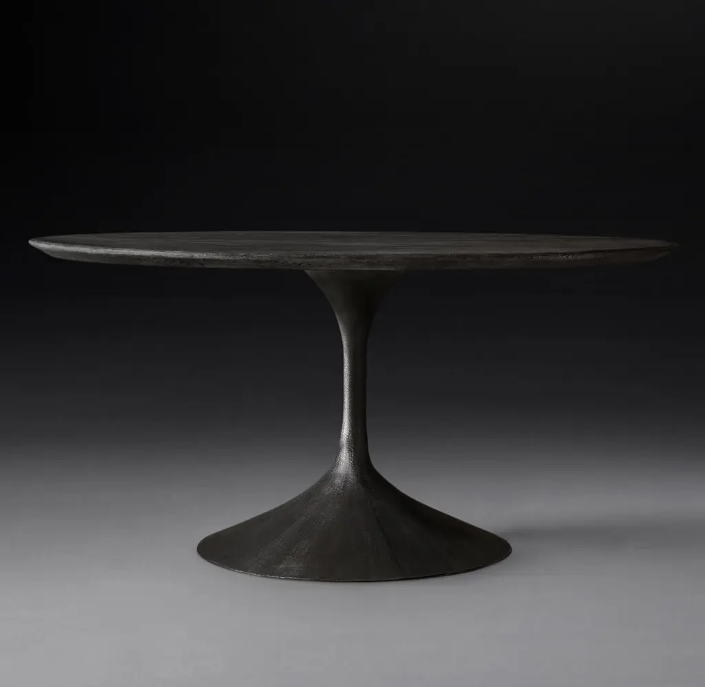 Paying homage to the sweeping lines of midcentury furnishings, our table is a study in simplicity. Defined by its balanced proportions and arching, sculptural curves, our interpretation pairs a cast metal pedestal base with a bullnose wood top. SHOP THE ENTIRE COLLECTION
