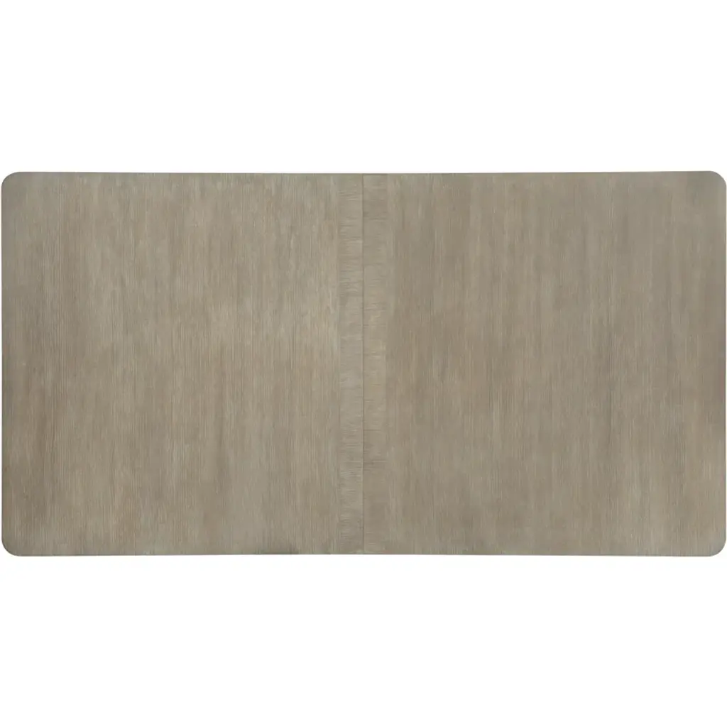 A neutral color palette and angular forms create a soft modern expression in the affinity rectangle pedestal dining table. Crafted of quartered oak veneers, the table has a tactile greige sand-blasted finish. With two 18-inch leaves, the table extends to 114 inches with both leaves in place and will accommodate six guests without leaves, eight with one leaf, and ten with both leaves. A three-piece geared wood table slide allows you to add or remove leaves. Soft, rounded forms combine with sand-blasted greige and antique white finishes to create an inviting transitional boutique collection in affinity. The main finish for the 20-piece collection of bedroom, dining room, occasional accents, and home entertainment is a wire-brushed greige (gray/beige) on quartered white oak. Pewter and antique white hardware and soft linen fabrics add intrigue.