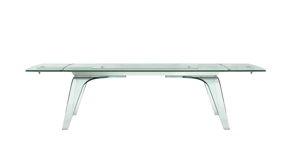 “The Disappearance" would be an apt name for this table... The transparent top sits on two magnificent legs of thick, curved glass that are also transparent. Two polished aluminum bars supporting the two extensions emerge from the unit, whose thick glass gives rise to beautiful sea-green reflections.
