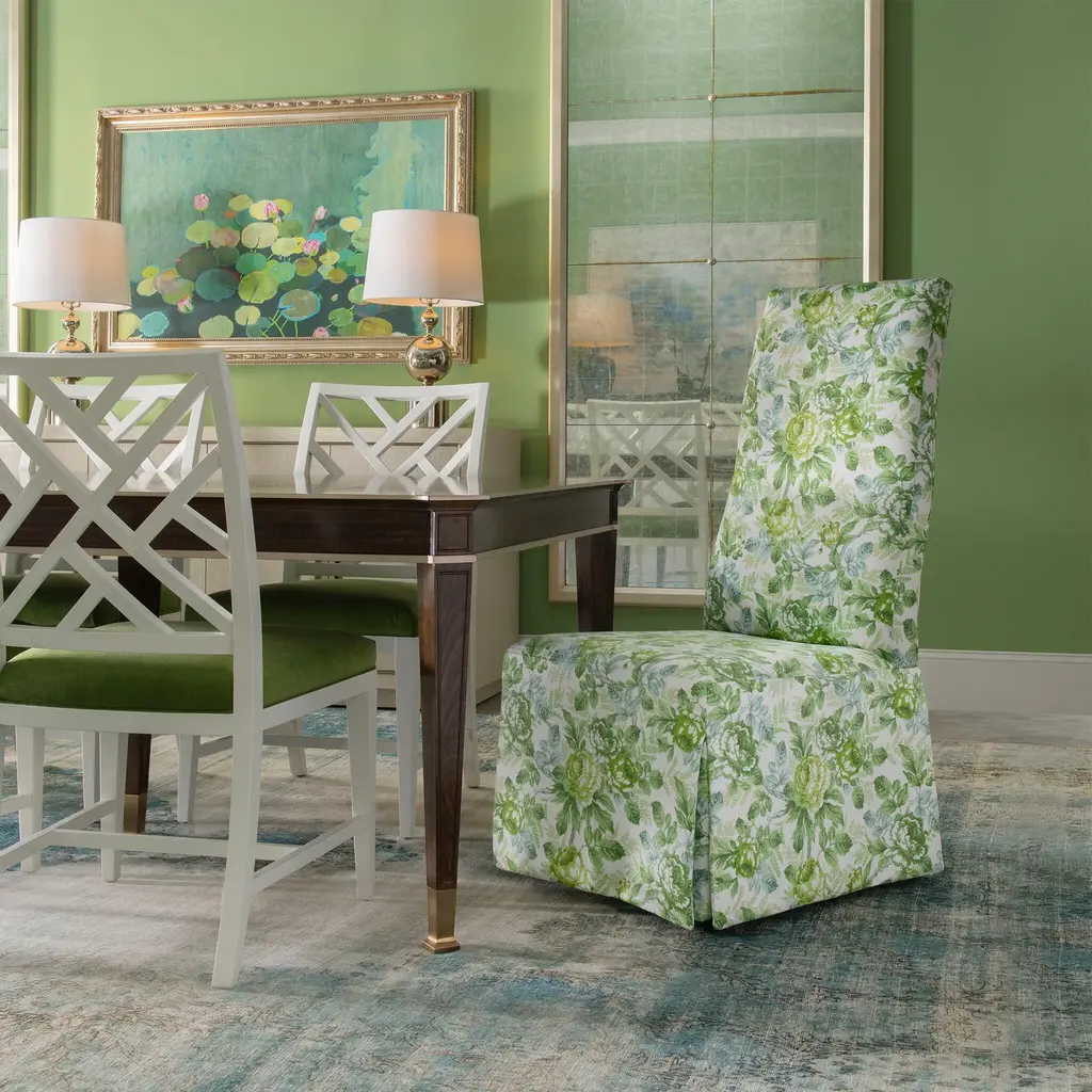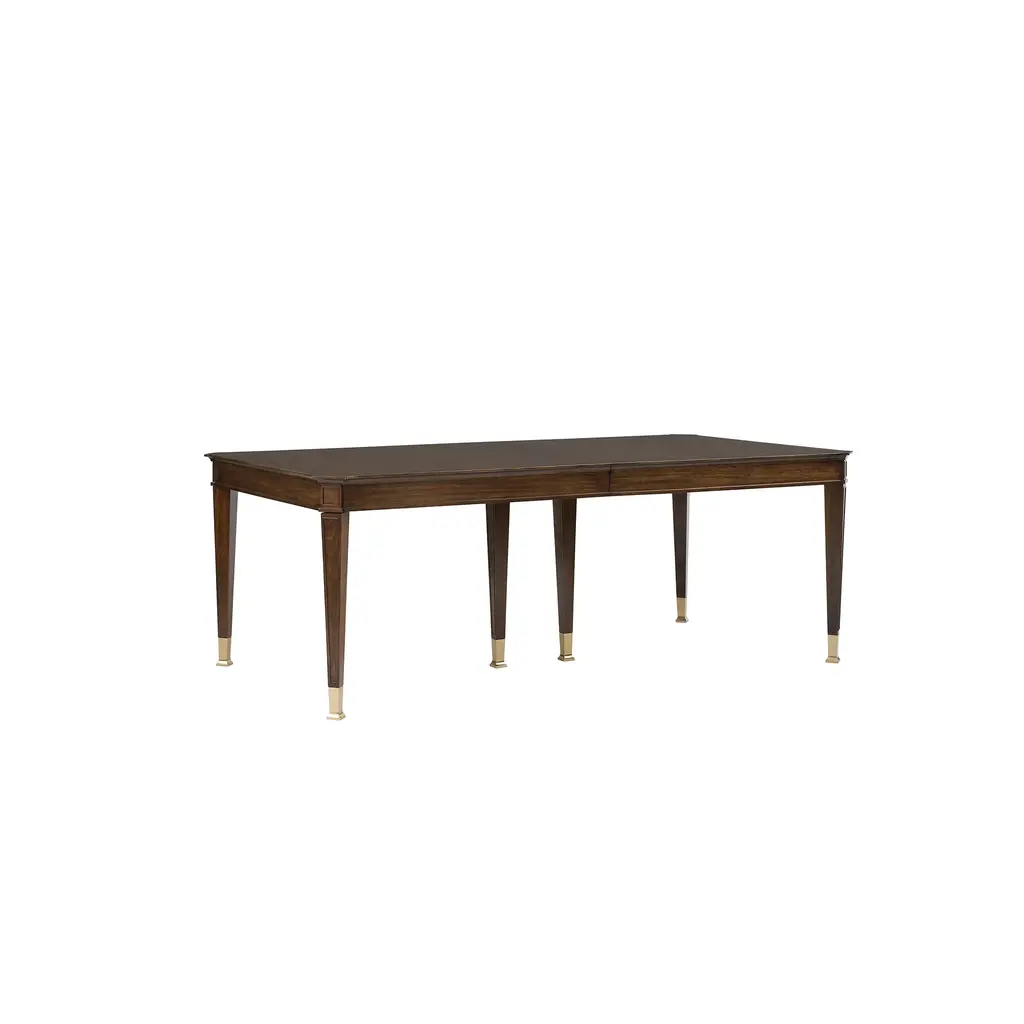 With elegantly tapered legs, brass ferrules, and carved corner accents the Aidan Dining Table sits six comfortably without the use of the included leaves. With both 24" leaves added, easily sit ten for a delicious feast. The classic style of this pieces ensures it's longevity in your collection; it seamlessly pairs with any design style you may choose. In Stock May 2026 Brass finish ferrules Includes two 24" removable leaves As Shown Finish: Belvedere This product can be special ordered in additional finishes. Click here to email us for for additional information about special ordering.This image is for illustrative purposes only. The colors shown are accurate within the constraints of lighting, photography, and the color accuracy of your screen.
