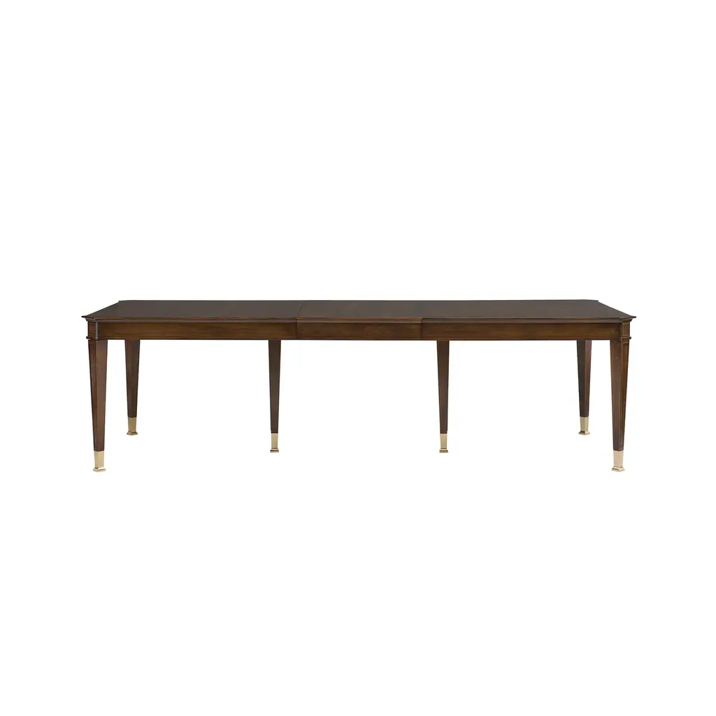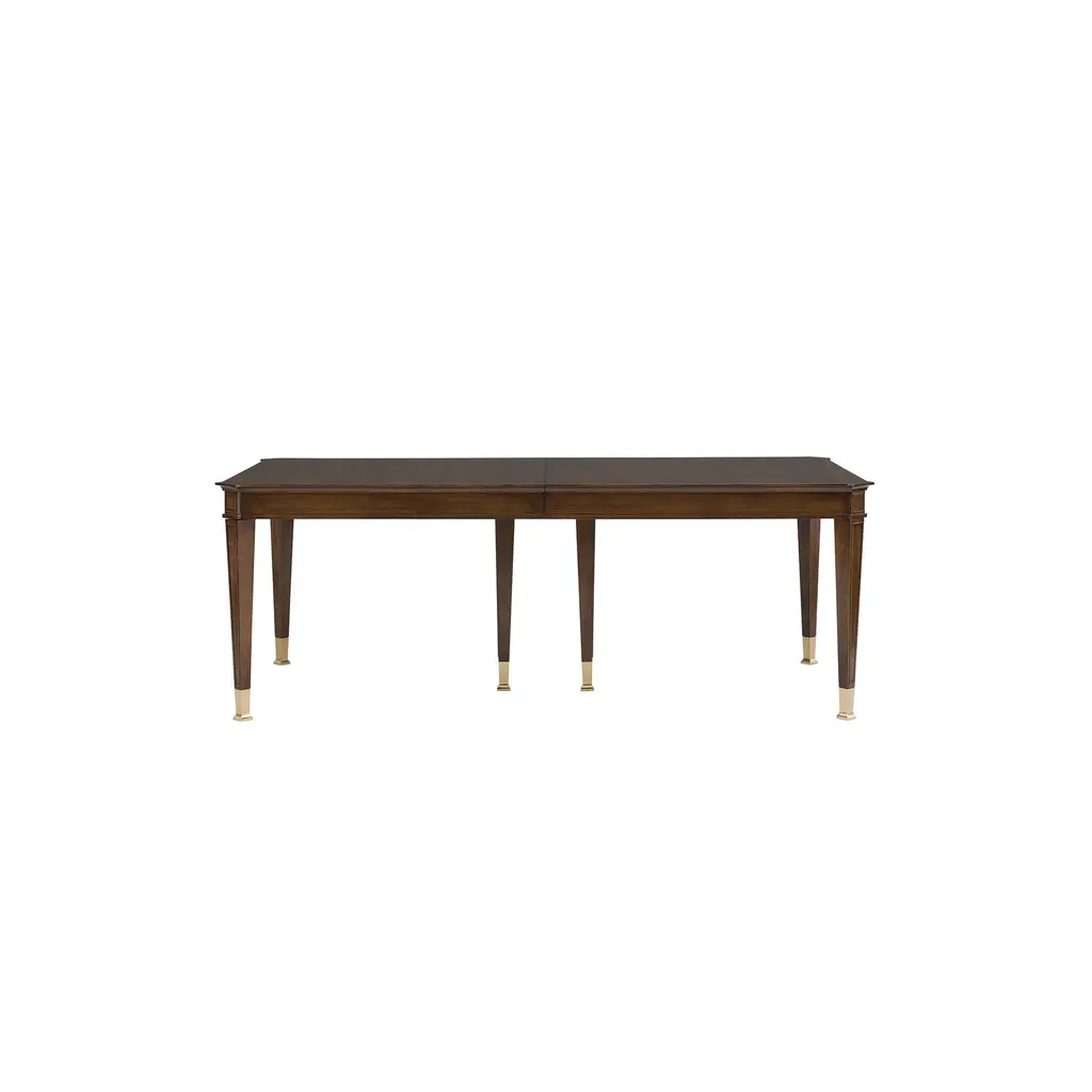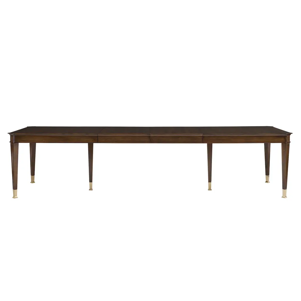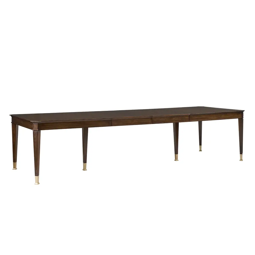With elegantly tapered legs, brass ferrules, and carved corner accents the Aidan Dining Table sits six comfortably without the use of the included leaves. With both 24" leaves added, easily sit ten for a delicious feast. The classic style of this pieces ensures it's longevity in your collection; it seamlessly pairs with any design style you may choose. In Stock May 2026 Brass finish ferrules Includes two 24" removable leaves As Shown Finish: Belvedere This product can be special ordered in additional finishes. Click here to email us for for additional information about special ordering.This image is for illustrative purposes only. The colors shown are accurate within the constraints of lighting, photography, and the color accuracy of your screen.