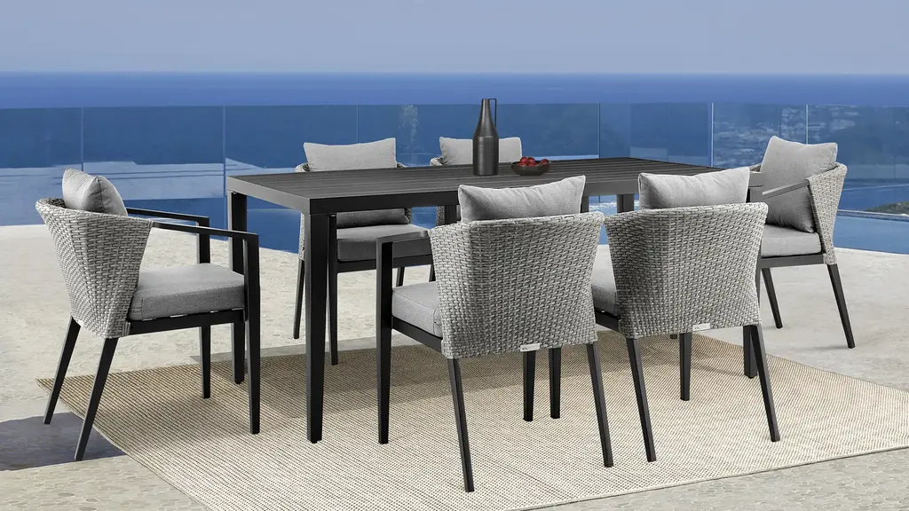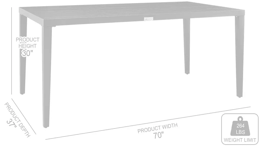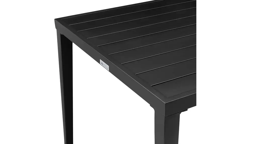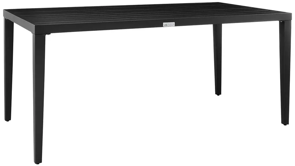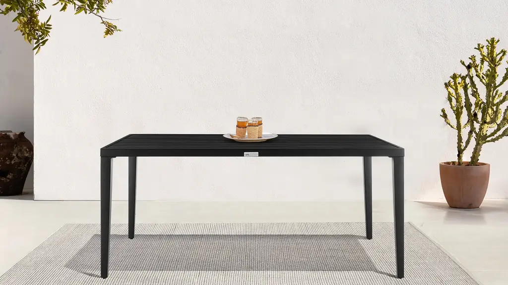 Enjoy your outdoor space to the fullest with the Aileen Outdoor Dining Table. Defined by clean lines and refined silhouette, this patio table befits any setting indoor or outdoor. The rectangular outdoor dining table makes a sleek statement with the smooth and sturdy finish of black powder-coated aluminum, and it can easily incorporate to your existing decor. The Aileen outdoor dining table is perfectly crafted from a light and rust proof material and can be moved from your backyard, to your screened in porch, to your garden with ease! The chic aluminum table and frame feature a multi-layer powder coating for effective protection from the weather, UV, everyday wear, and tear. The slat style tabletop of this outdoor furniture piece helps elements to easily pass through which adds to its durability, while the umbrella hole adds to its convenience. The surface of the patio dining table delivers timeless elegance, making it the ideal piece of outdoor patio furniture.