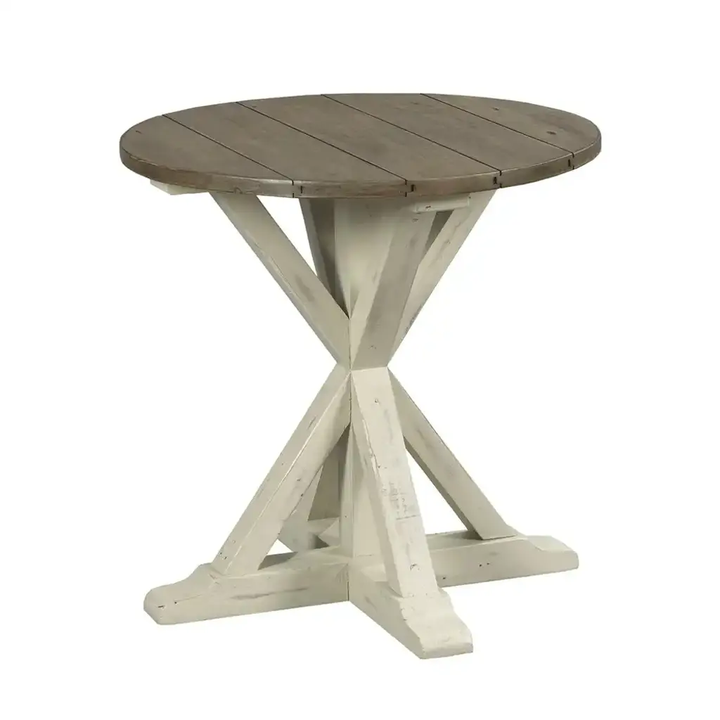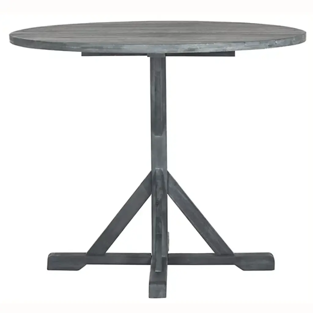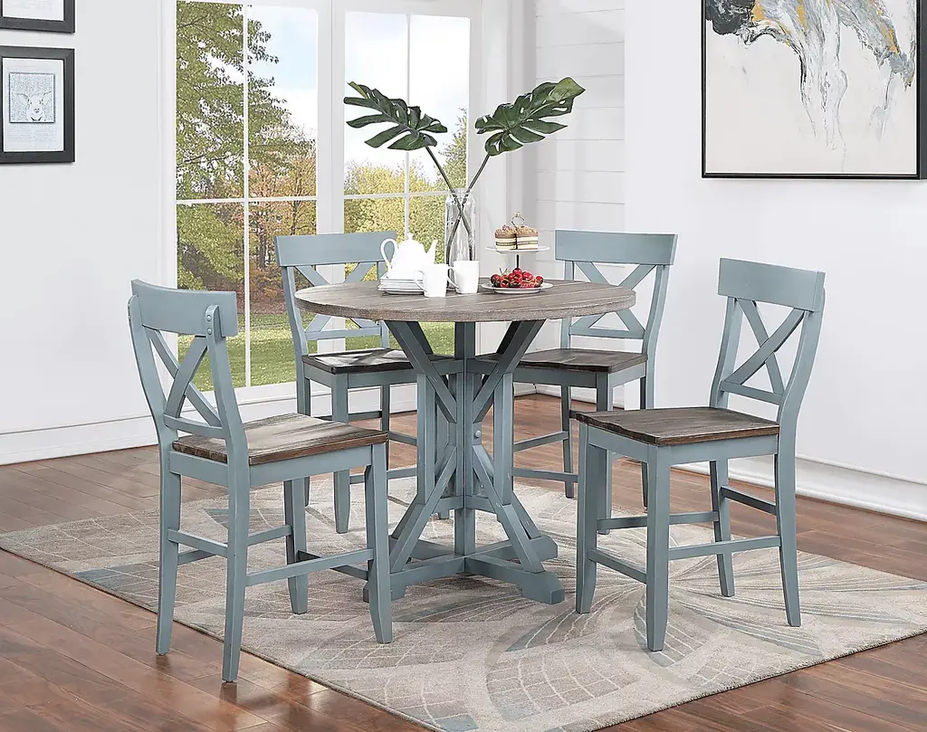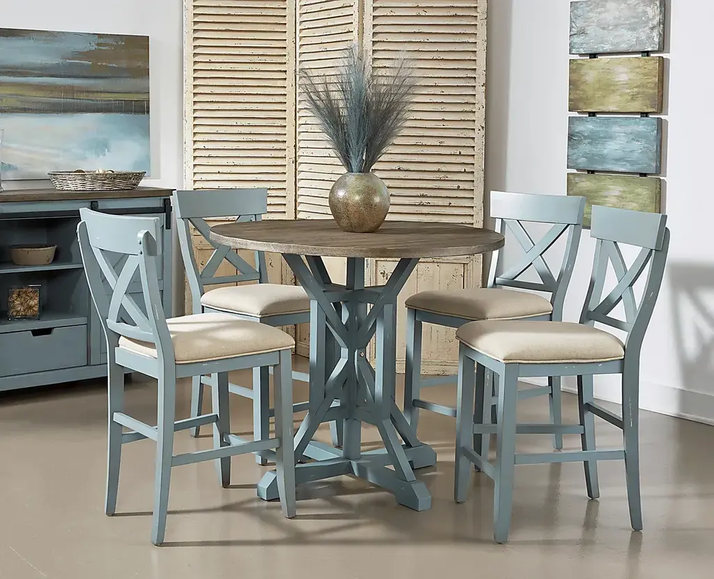 The intricately designed trestle column has been coated with blue for that pop of color and makes the perfect base for the rich, wood tone of the circular top on the Airymeadows blue counter height dining table. Stylish, fun, and an ideal choice for your kitchen nook, game room or studio. Customer assembly is required.