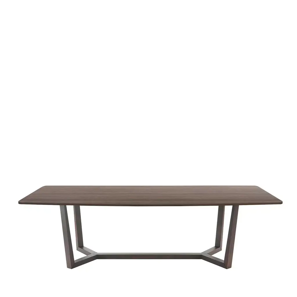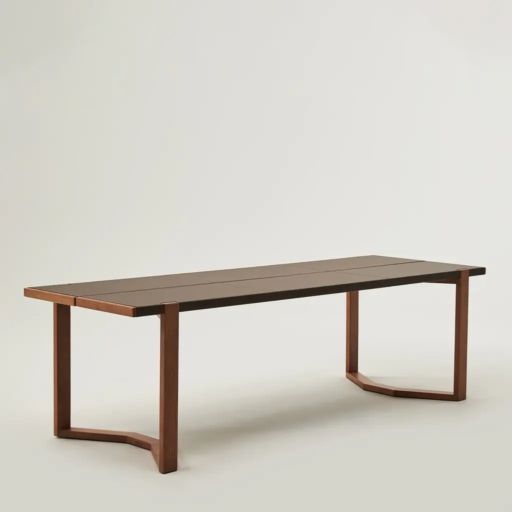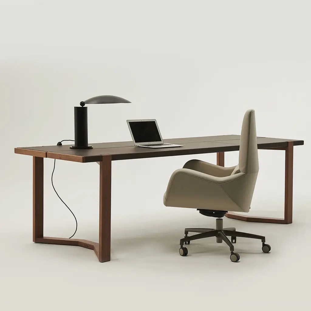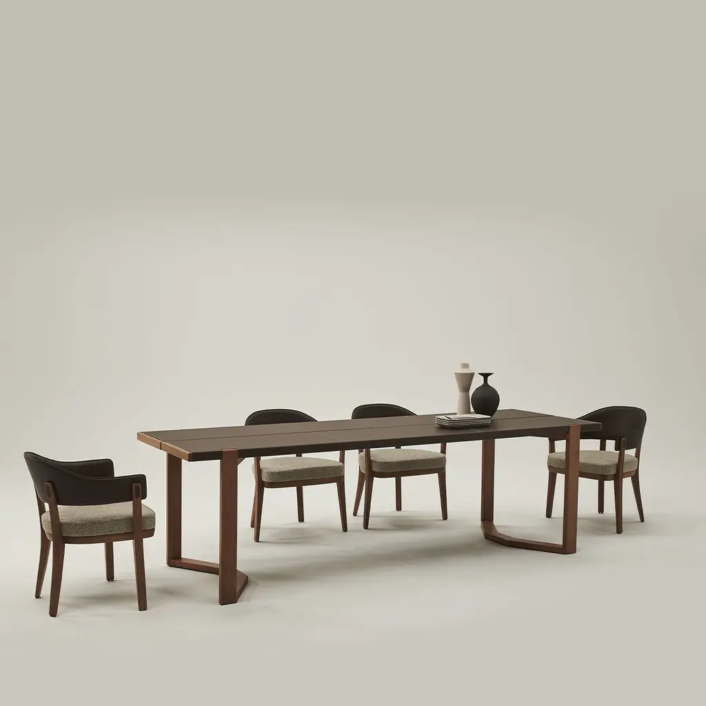 An artfully sculpted base anticipates the exclusive allure of this sartorial-inspired table, sure to infuse charm into dining rooms or private studies. Italian walnut is the warm finish selected for the solid ash frame, while precious curette leather envelops a couple of slats, composing the top for a statement of superb sartorial quality. Please contact the Concierge for available variants.