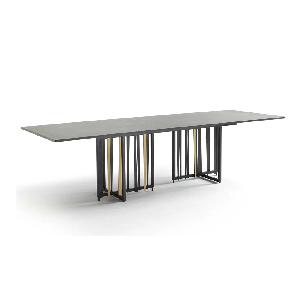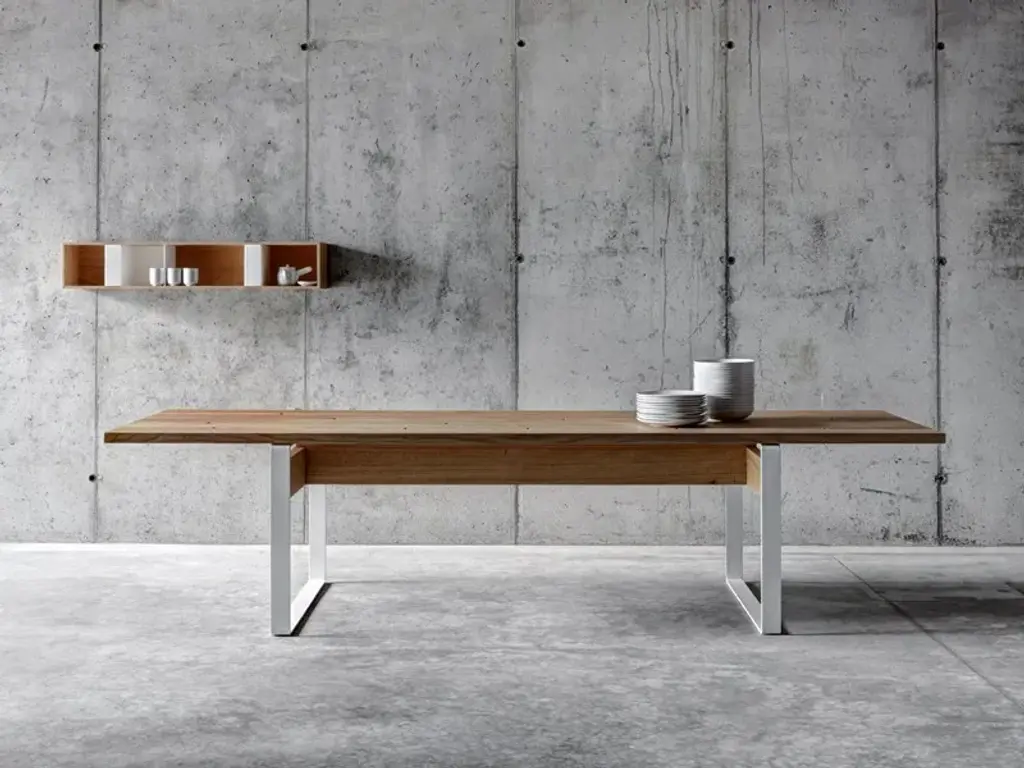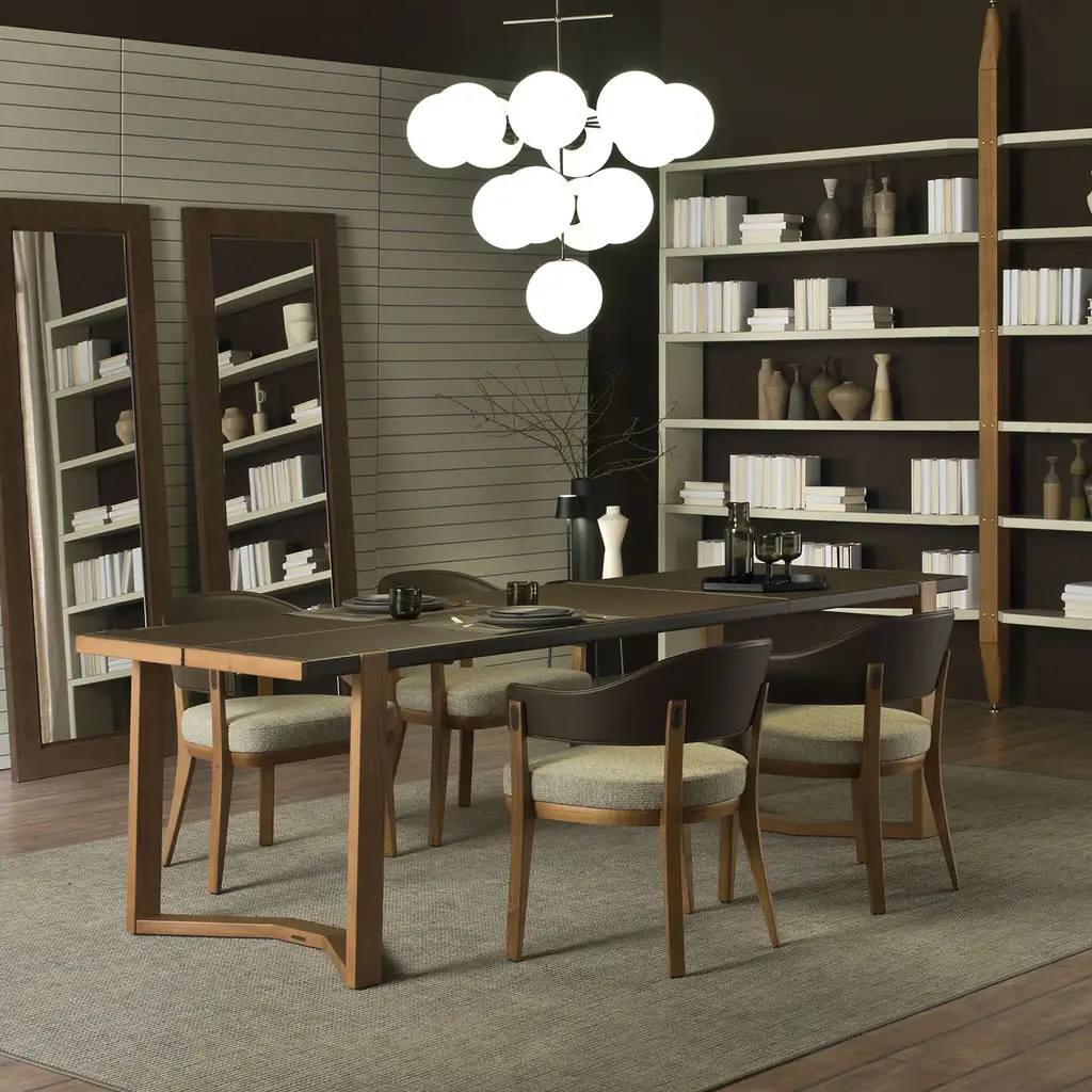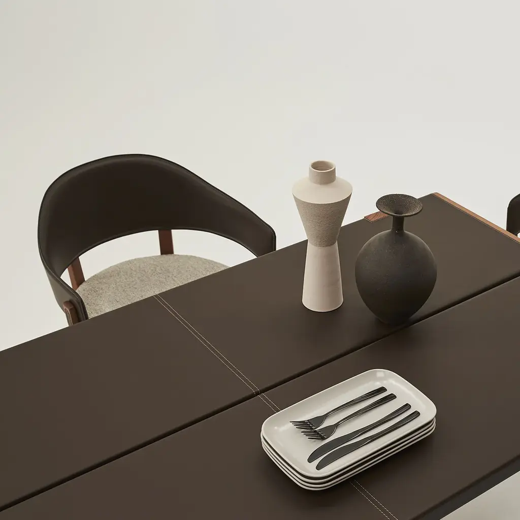 An artfully sculpted base anticipates the exclusive allure of this sartorial-inspired table, sure to infuse charm into dining rooms or private studies. Italian walnut is the warm finish selected for the solid ash frame, while precious curette leather envelops a couple of slats, composing the top for a statement of superb sartorial quality. Please contact the Concierge for available variants.