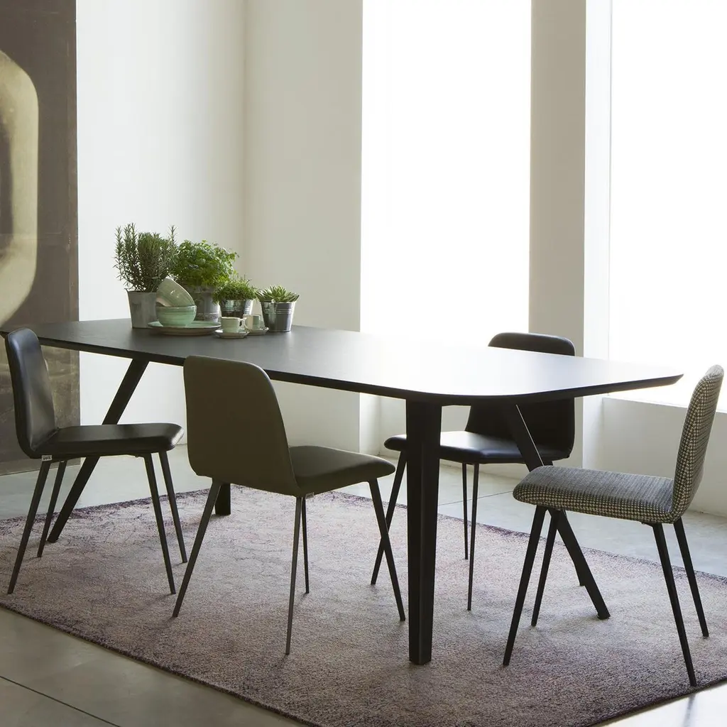 A testament to Minimalist design, this dining table is marked by a unique silhouette composed of four metal slanted legs reminiscent of the working stations of craftsmen’s studio, and a large top made of ashwood-veneer MDF with a black open-pore finish. Available also in natural tones of ash, bleached ash or cocoa-stained, the Aky Met collection offers versatile options with square, round and rectangular tops.
