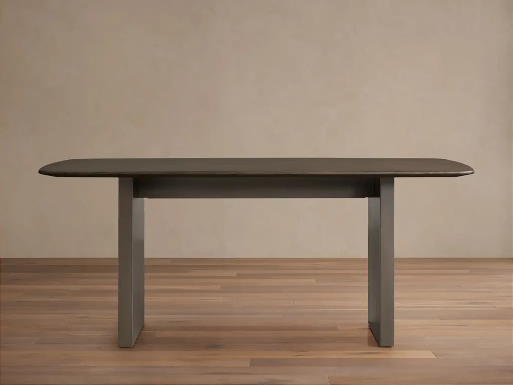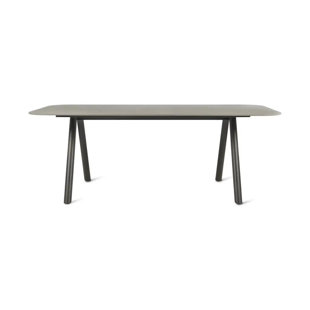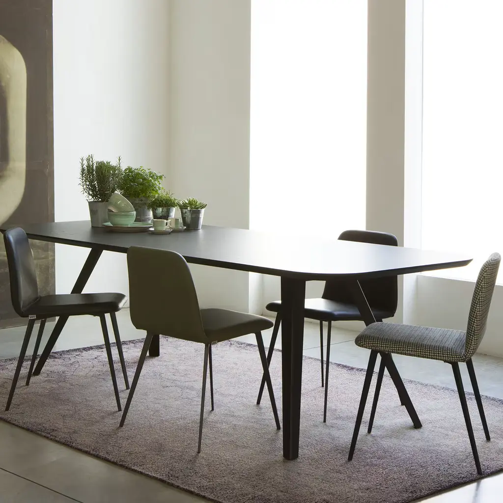 A testament to minimalist design, this dining table is marked by a unique silhouette composed of four metal slanted legs reminiscent of the working stations of craftsmen’s studio, and a large top made of ash wood-veneer MDF with a black open-pore finish. Available also in natural tones of ash, bleached ash or cocoa-stained, the Amy Met Collection offers versatile options with square, round and rectangular tops.