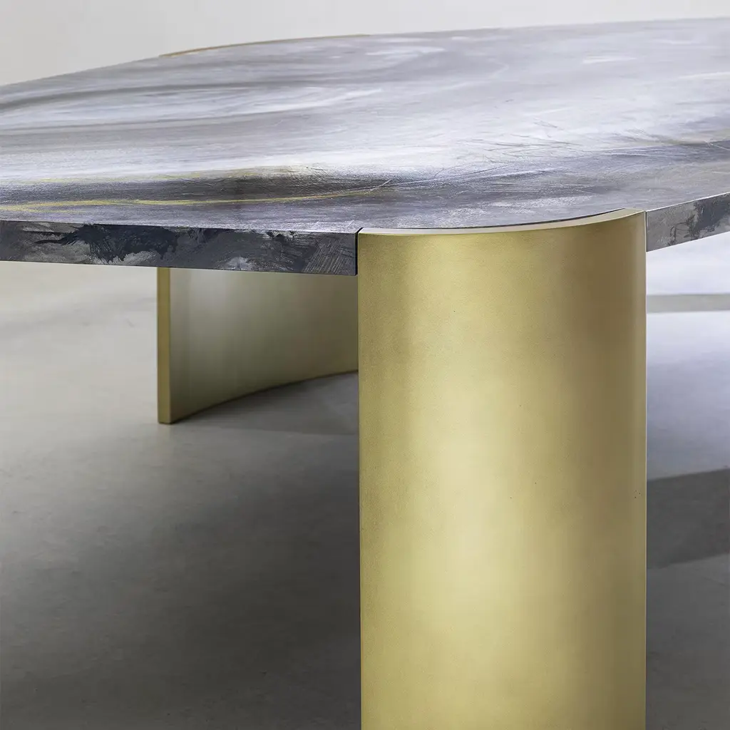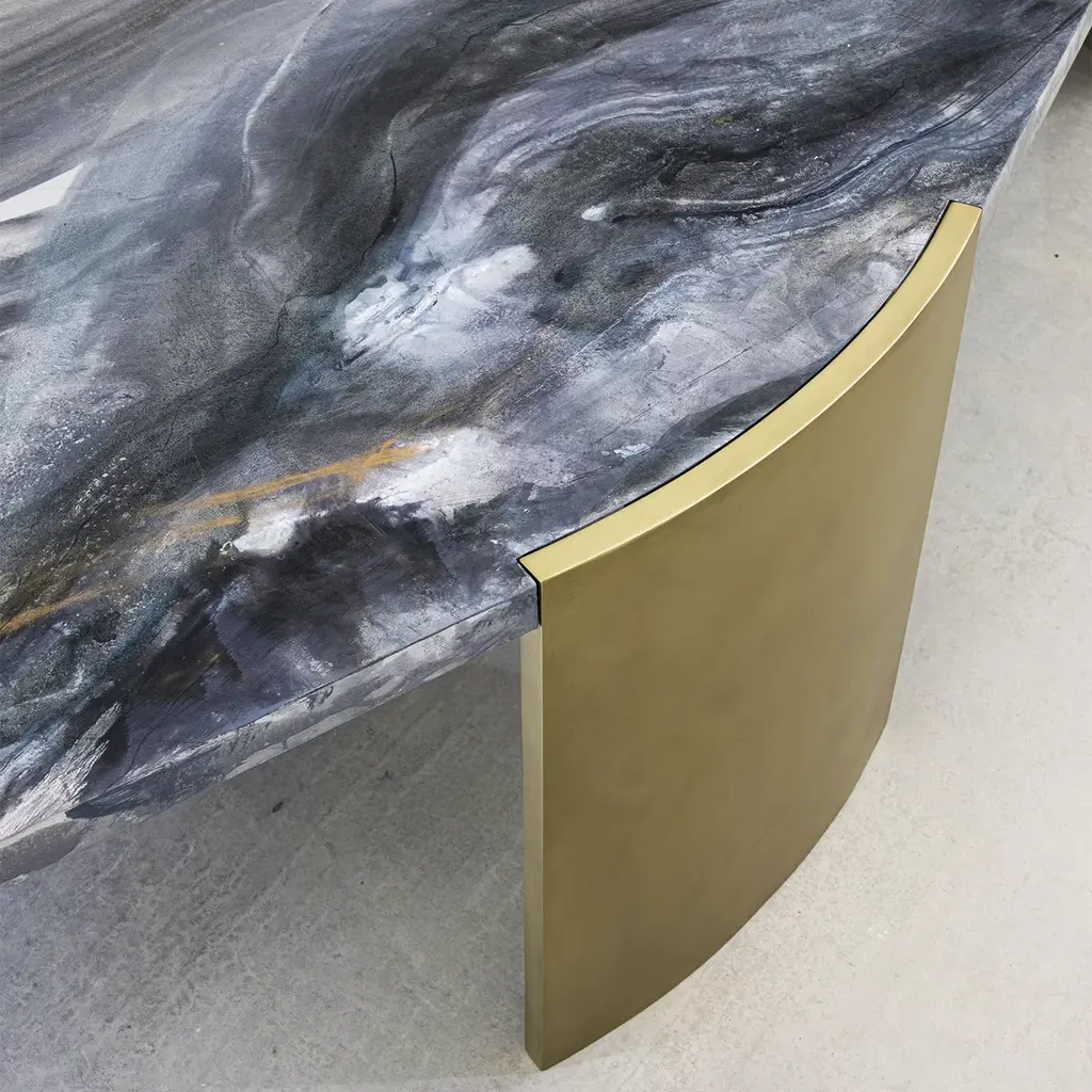 This striking table features a stunning hand-applied artistic resin top by Simone Brillarelli. The unique resin surface creates a visually captivating design, while the liquid gold metal legs add an opulent touch of elegance. Perfect for a modern dining or office space, this table combines artistry and craftsmanship, making it a bold statement piece that effortlessly blends luxury with contemporary style. This product is a one-of-a-kind piece.