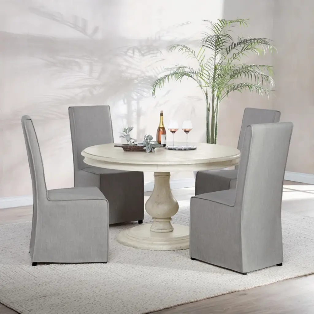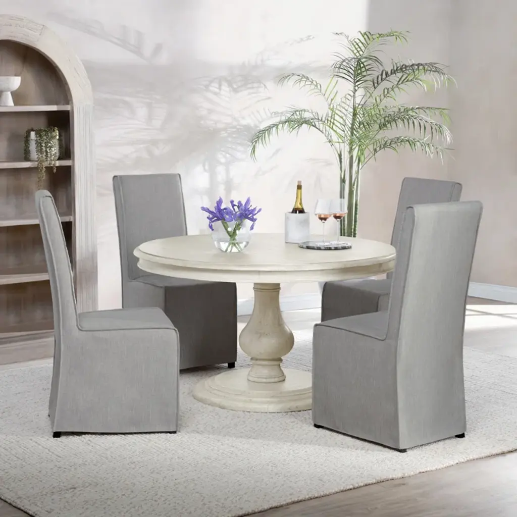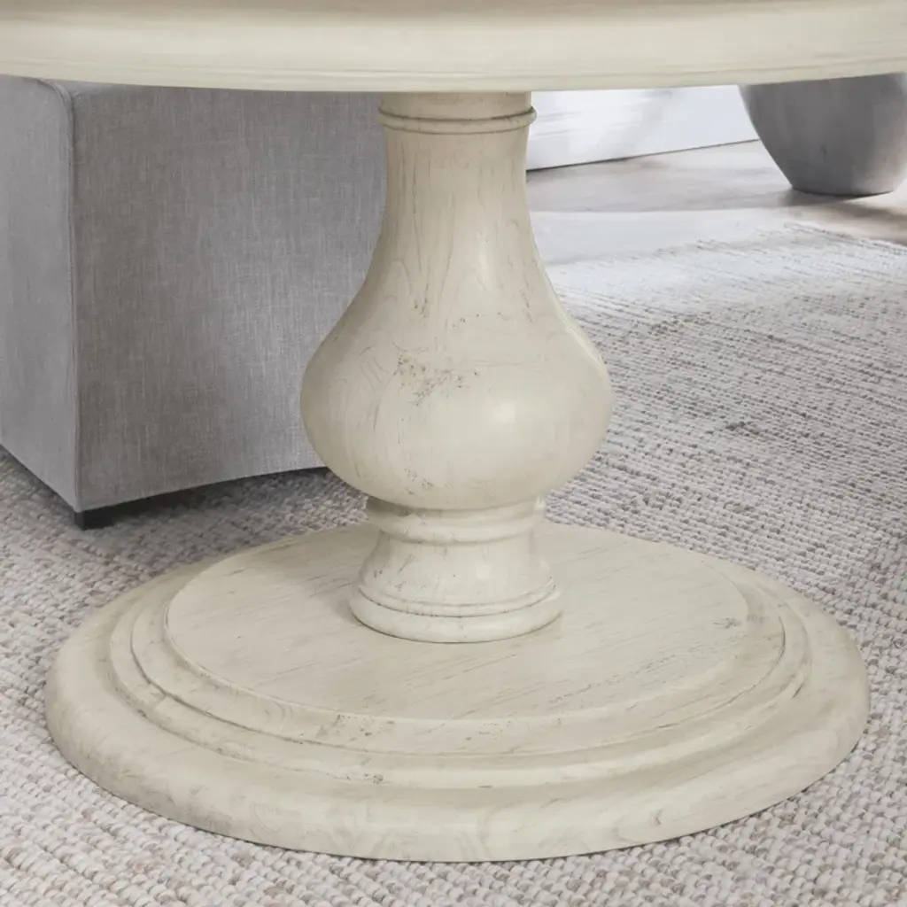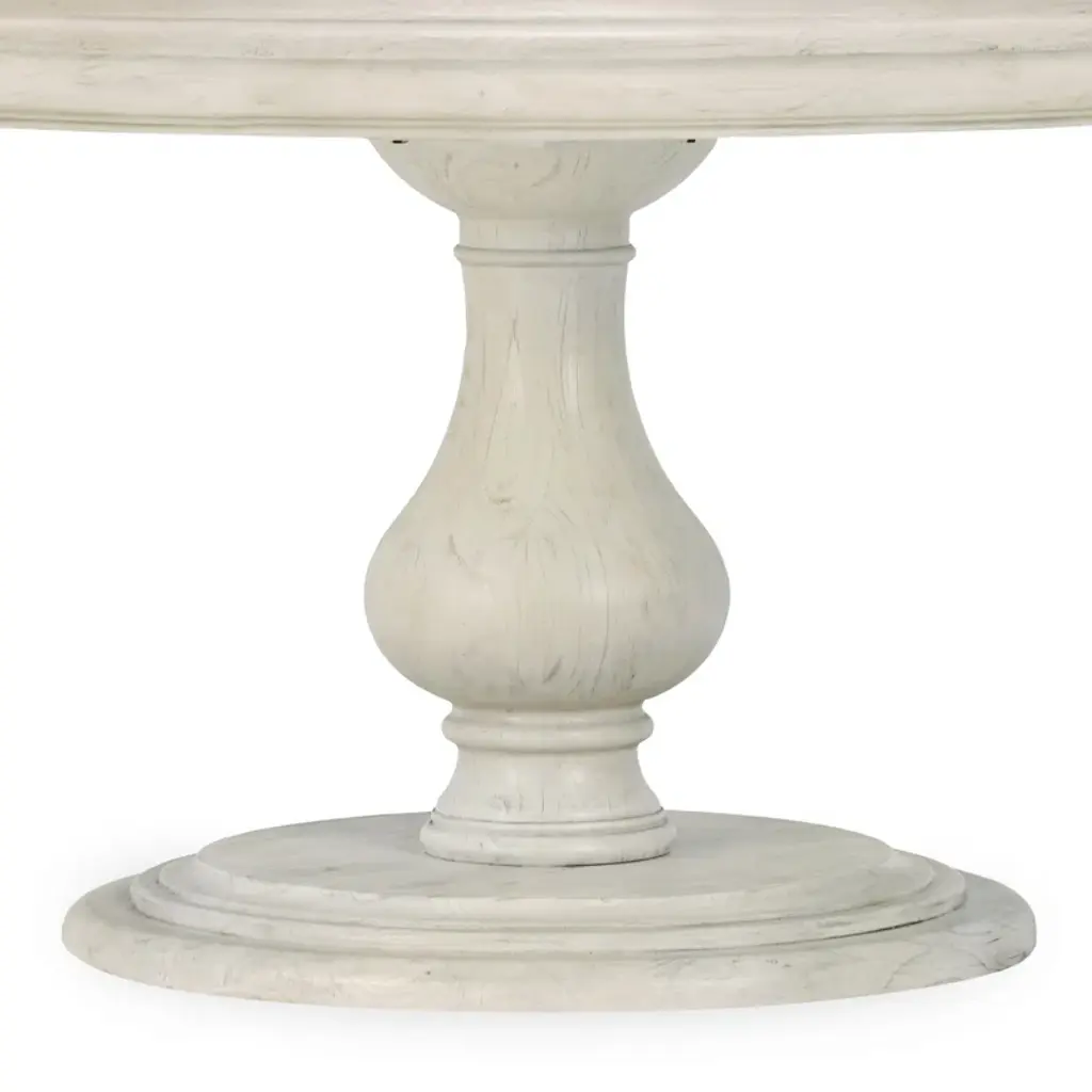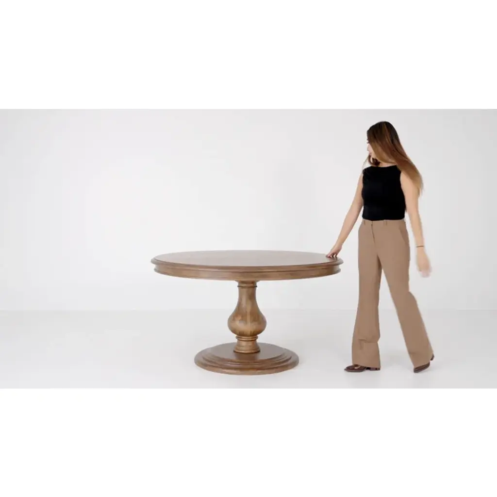 This round dining table is a key ingredient to any traditional dining room, especially if you love serving up homemade meals. It's thoughtfully crafted from solid kiln-dried wood in a weather-worn finish that reminds us of our favorite flea-market finds. A pedestal base and intricate carvings speak to its expertly crafted details. Something else to love: This round table seats up to four people, so there's plenty of room to spread out and enjoy some meals.