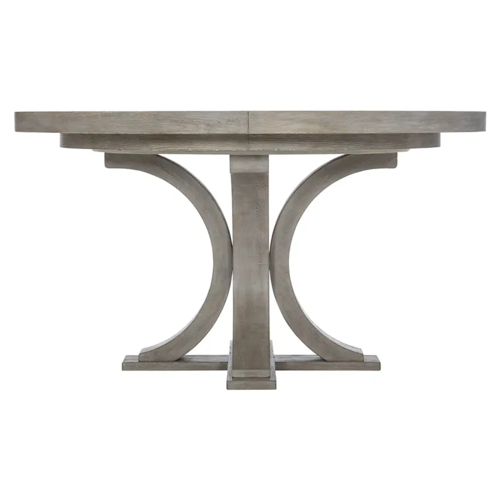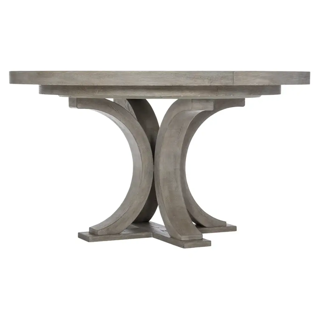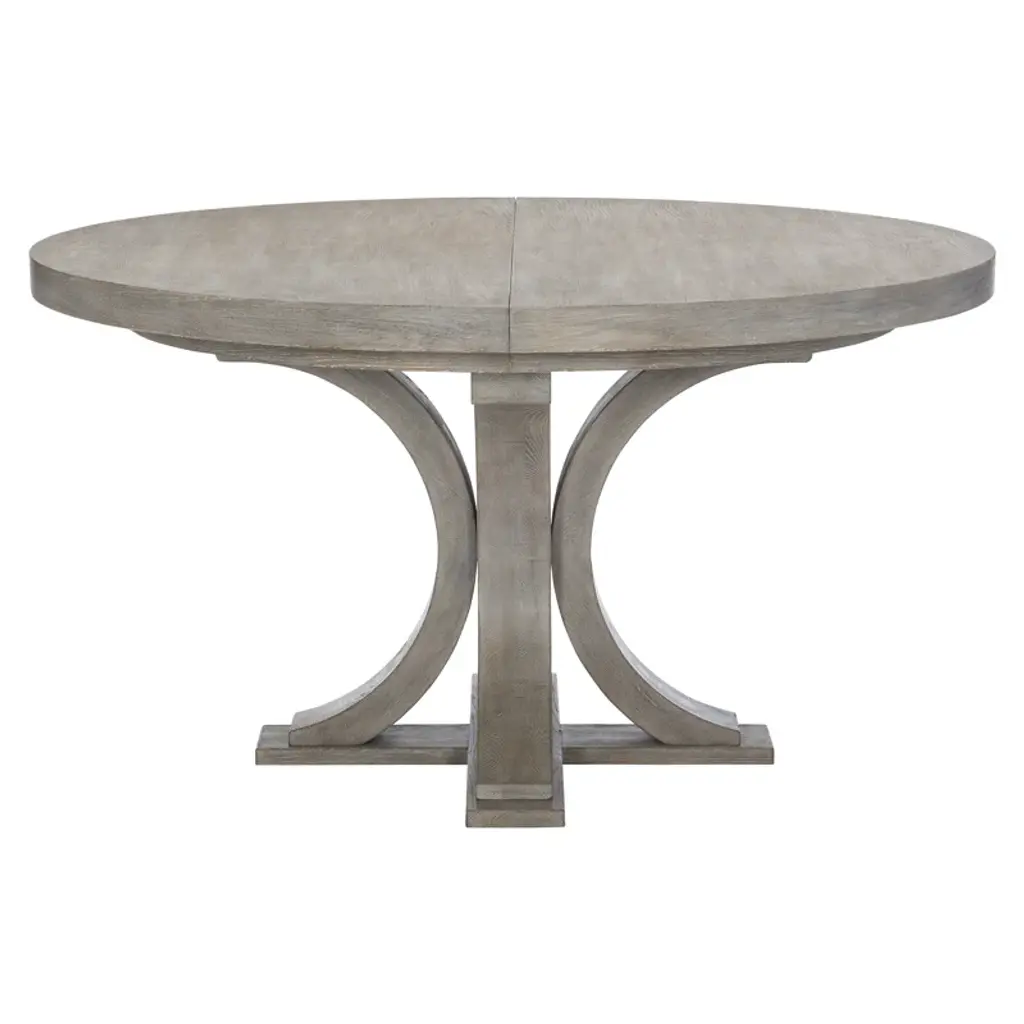 This white oak dining table with a pewter finish is a classic. Its round wood top rests on a wooden base crafted from four legs, each one designed as a half-circle, resting on a bottom wood base. An 18” leaf allows the table to expand, graciously seating even more friends and family members.