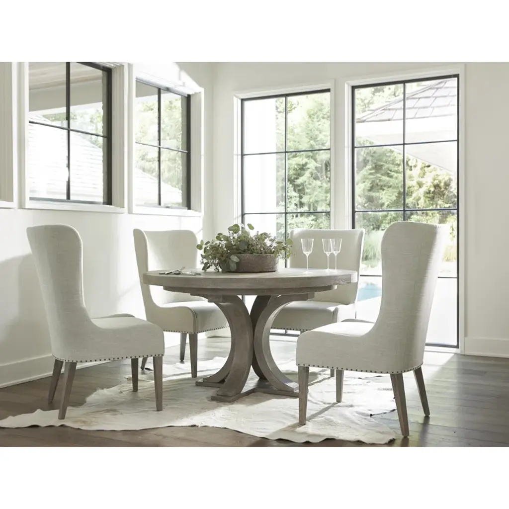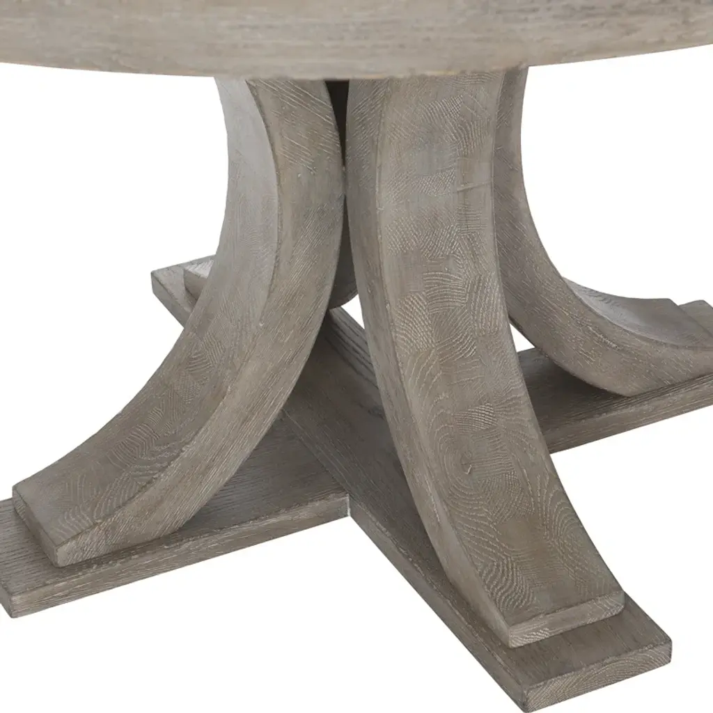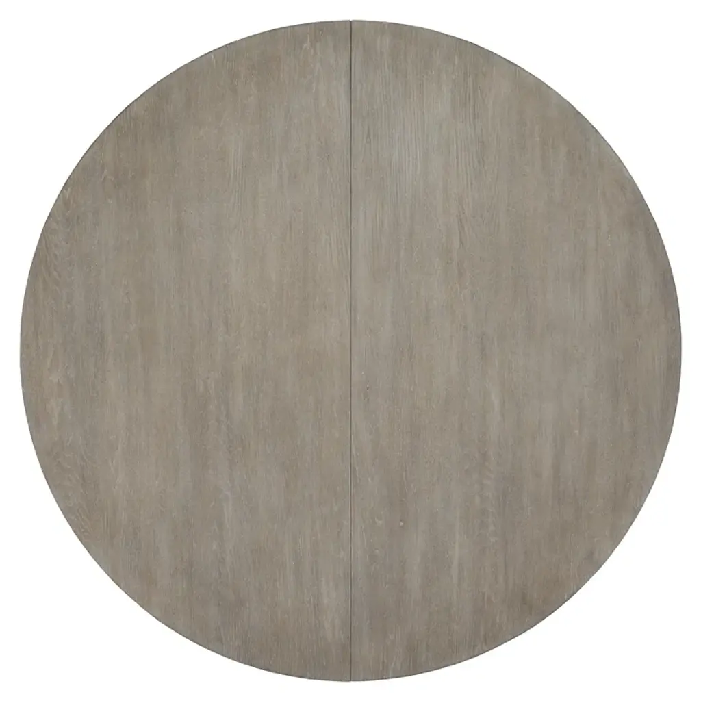 This white oak dining table with a pewter finish is a classic. Its round wood top rests on a wooden base crafted from four legs, each one designed as a half-circle, resting on a bottom wood base. An 18” leaf allows the table to expand, graciously seating even more friends and family members.
