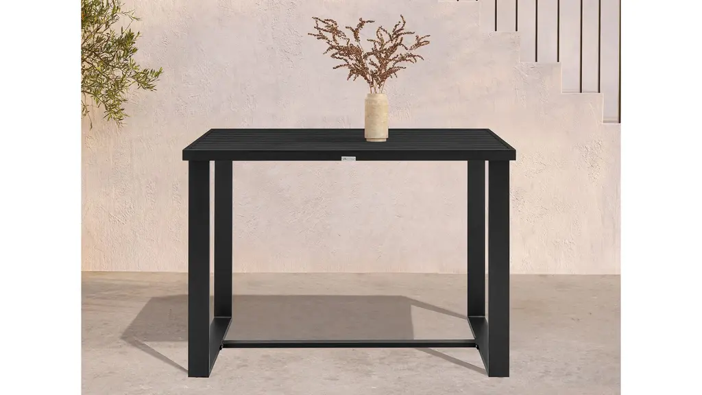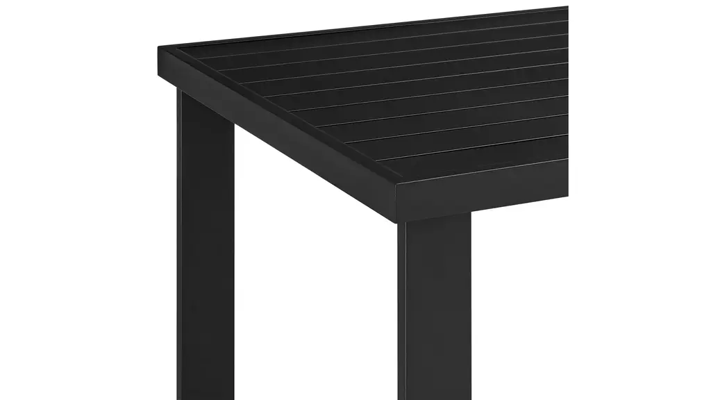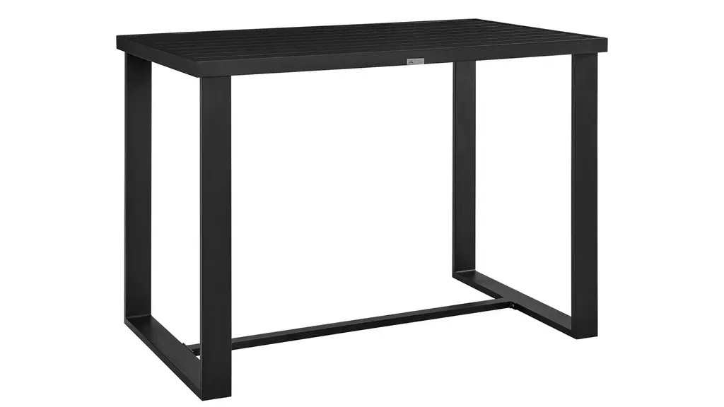 Transform your backyard space into the perfect entertainment destination with the Alegria Bar Height Dining Table from Armen Living. The chic aluminum frame features a multi-layer powder coating for effective protection from the weather, everyday wear, and tear which adds to the longevity of this piece of outdoor furniture. This patio table can be moved from your backyard to your screened-in porch, or to your garden with ease! The slat style tabletop helps elements to easily pass through which adds to its durability. Without having to worry about UV or weather damage, the Alegria pub table is ideal for your outdoor space, regardless of your location. The table's simplistic yet modern design makes this an easy piece of outdoor patio furniture to integrate into your existing design theme. The Alegria Outdoor Patio Bar Height Dining Table in Aluminum features a black finish and will comfortably accommodate up to 6 seats.
