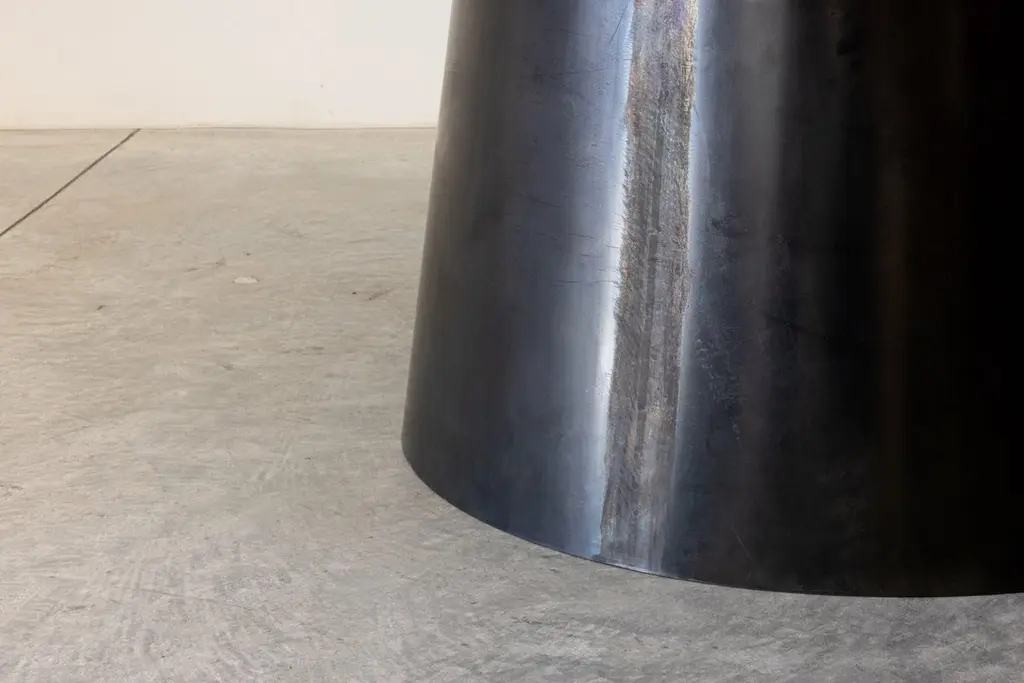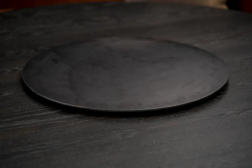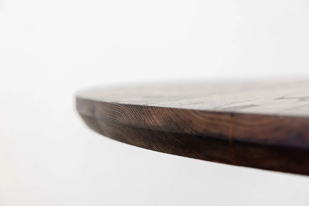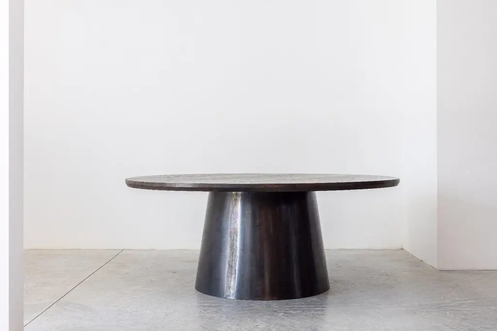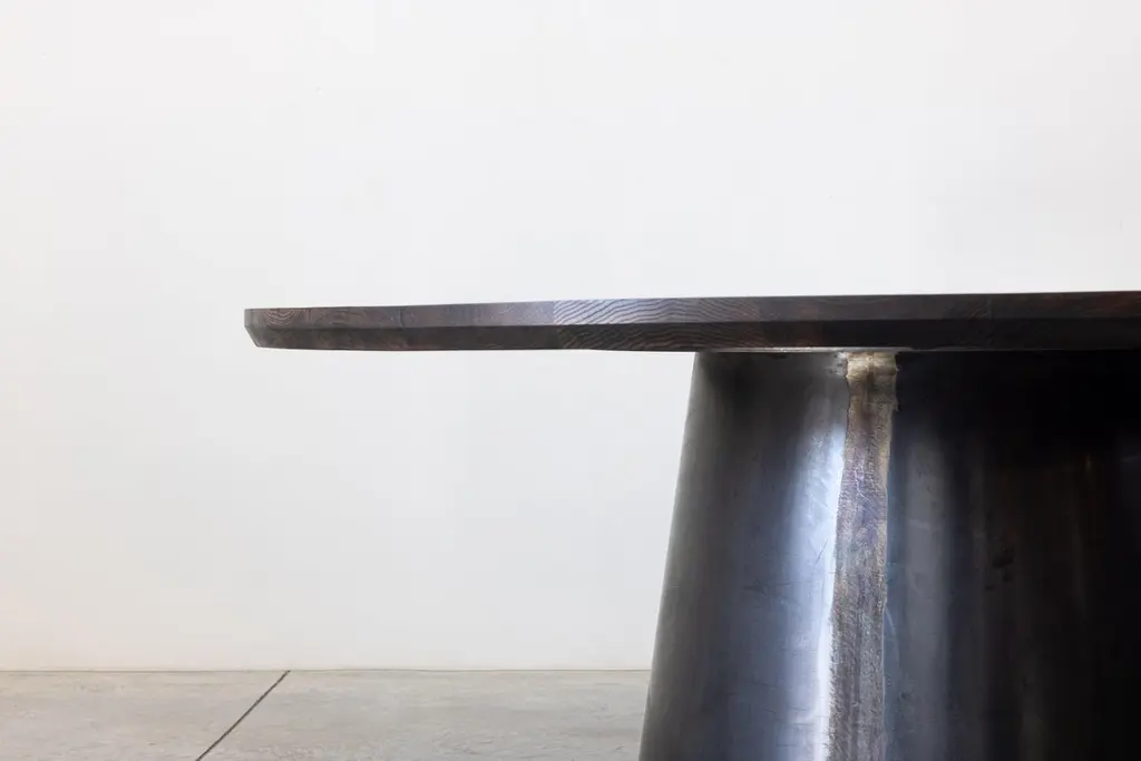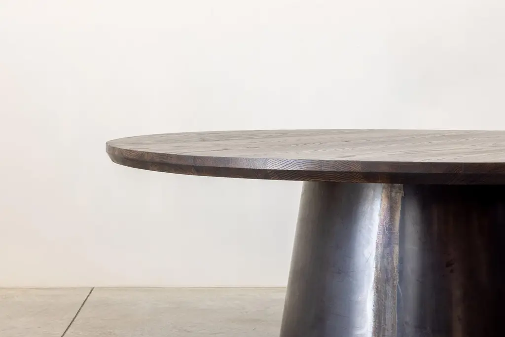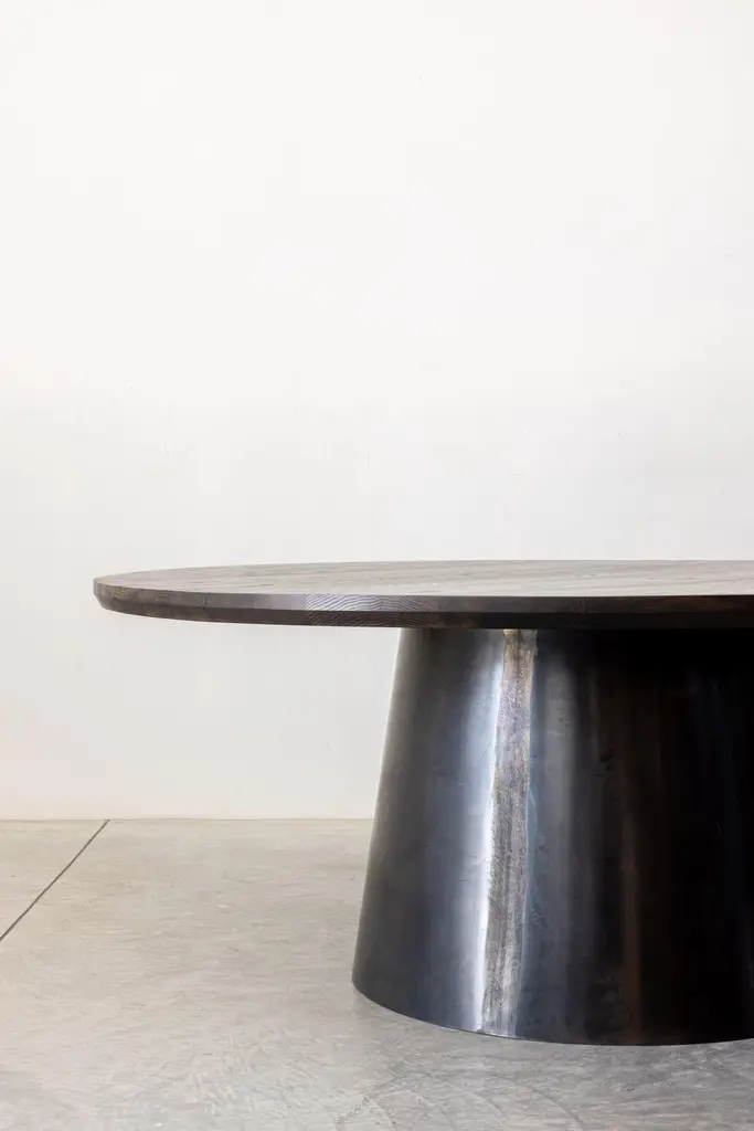 A dramatic round table featuring a solid wood tabletop, shown in Torched Oak, set on a thick blackened steel base. The curved conical base is meticulously curved and joined to create a virtual seamless connection, acting as a sculptural form. The 8-degree taper helps form depth and an intrinsic value to the piece. Designer Kirk Van Ludwig wanted the table balanced allowing for a person to sit on the end of the table without any movement, this was achieved through the use of 3/8” thickness and a large steel flange.The Alexandra table is shown in Torched Oak with a slight silver onyx oil and wax finish and features our tapered B6 edge and signature brass coins, to complete the artful dining table. Available in other wood species such as Black Walnut and White Oak.Optional blackened steel lazy susan can be added to this table for a dining table (see photos). Alternatively, for a co-working meeting table for an office environment, AV and power outlets can be adapted to the underside of the table for a functional workspace.Features:- Contemporary design of a round dining table contrasting the raw steel base with natural solid wood top.- Torched Oak tabletop with a slight silver onyx oil and wax finish and placement of our signature brass coins.- Designed by Kirk Van Ludwig, nine-time Designer of the Year finalist for Western Living magazine. A modern furniture aficionado.