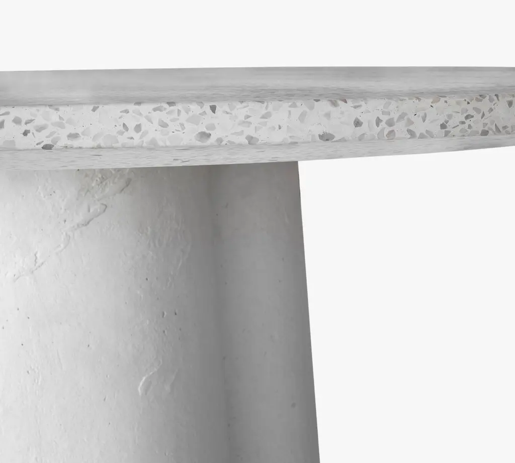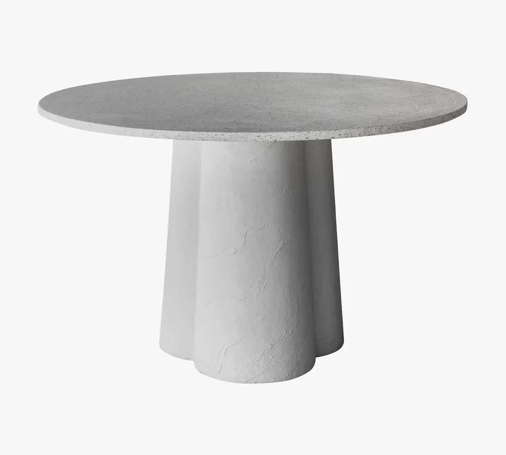 This table’s soft modernism is expressed in a clover-like pedestal. Curvaceous but clean of line, simple but bold, it is crafted in a durable combination of concrete and terrazzo that will resist the elements all year long.