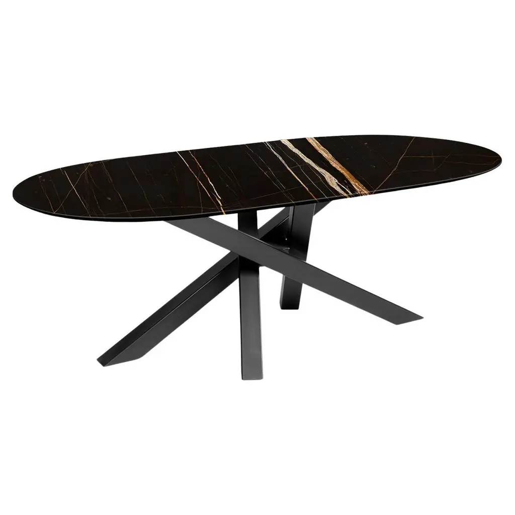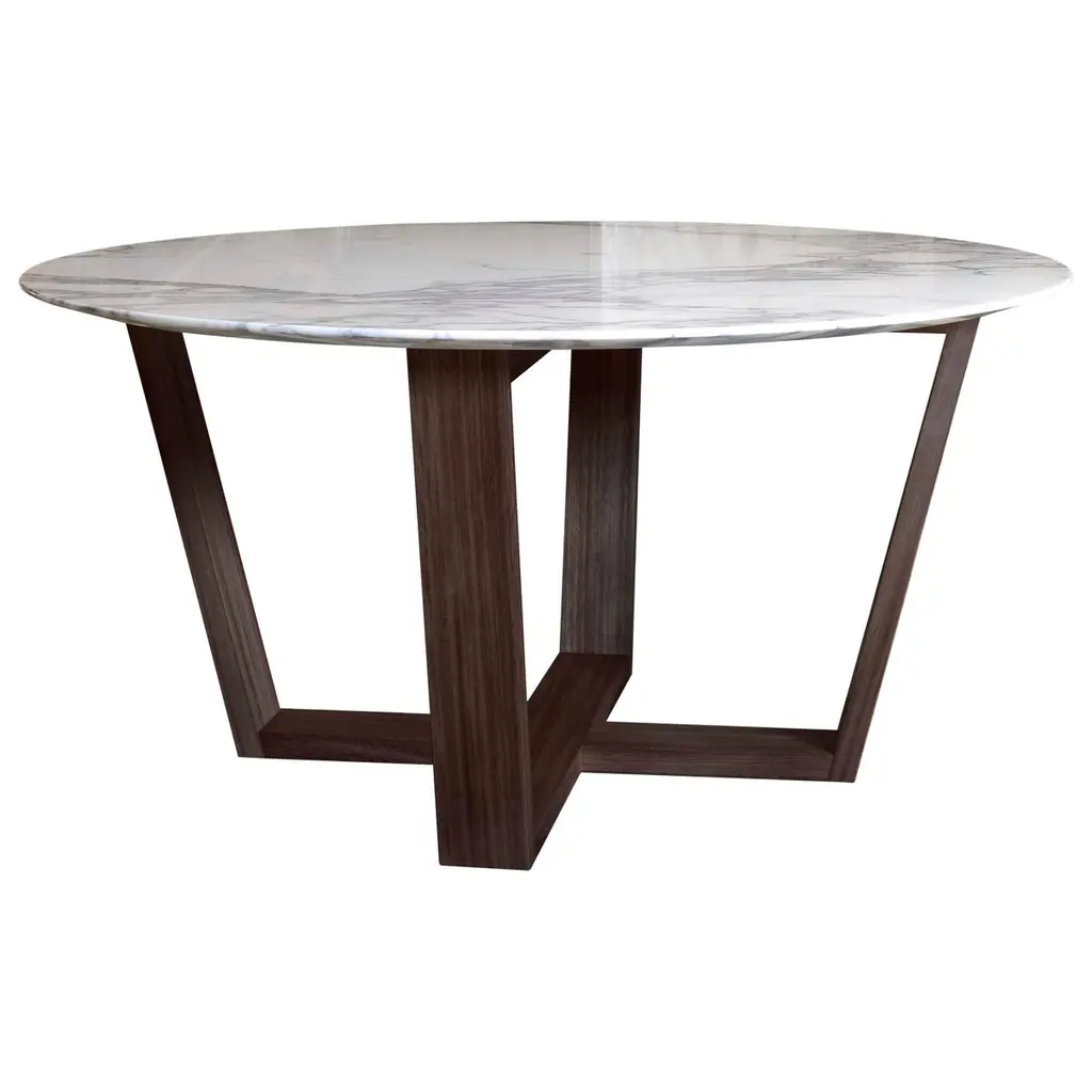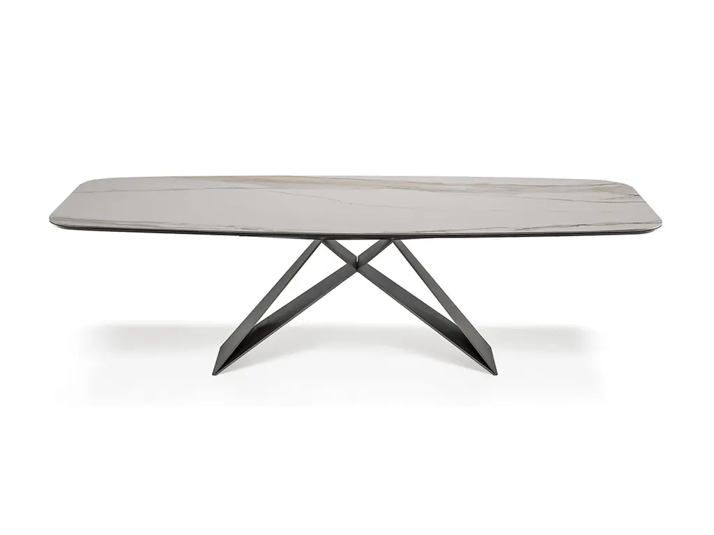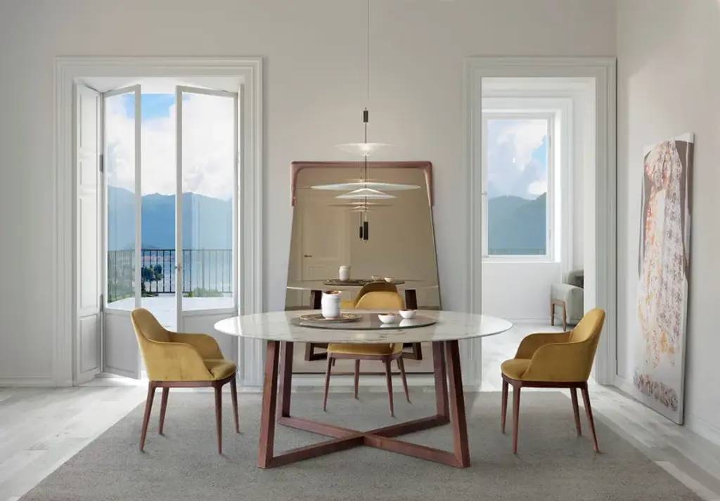 ALIANTE is a round designer dining table.It showcases purity in design and refined construction details typical of Italian craftsmanship: the sophisticated shaping of the legs, which converge at the base in a dynamic play of geometries, enhances the natural grain of the wood and creates a well-balanced contrast with the tabletop.Clean, timeless lines and light forms are interpreted with essential elegance.With its solid ash wood frame as a constant, the Aliante family includes a wide range of options—varying in materials, dimensions, and shapes—including a practical extendable version.Fixed or extendable dining table with a solid ash wood structure.Top in polished natural marble.