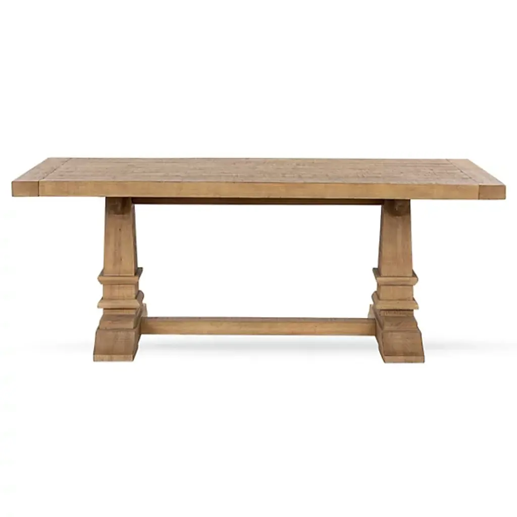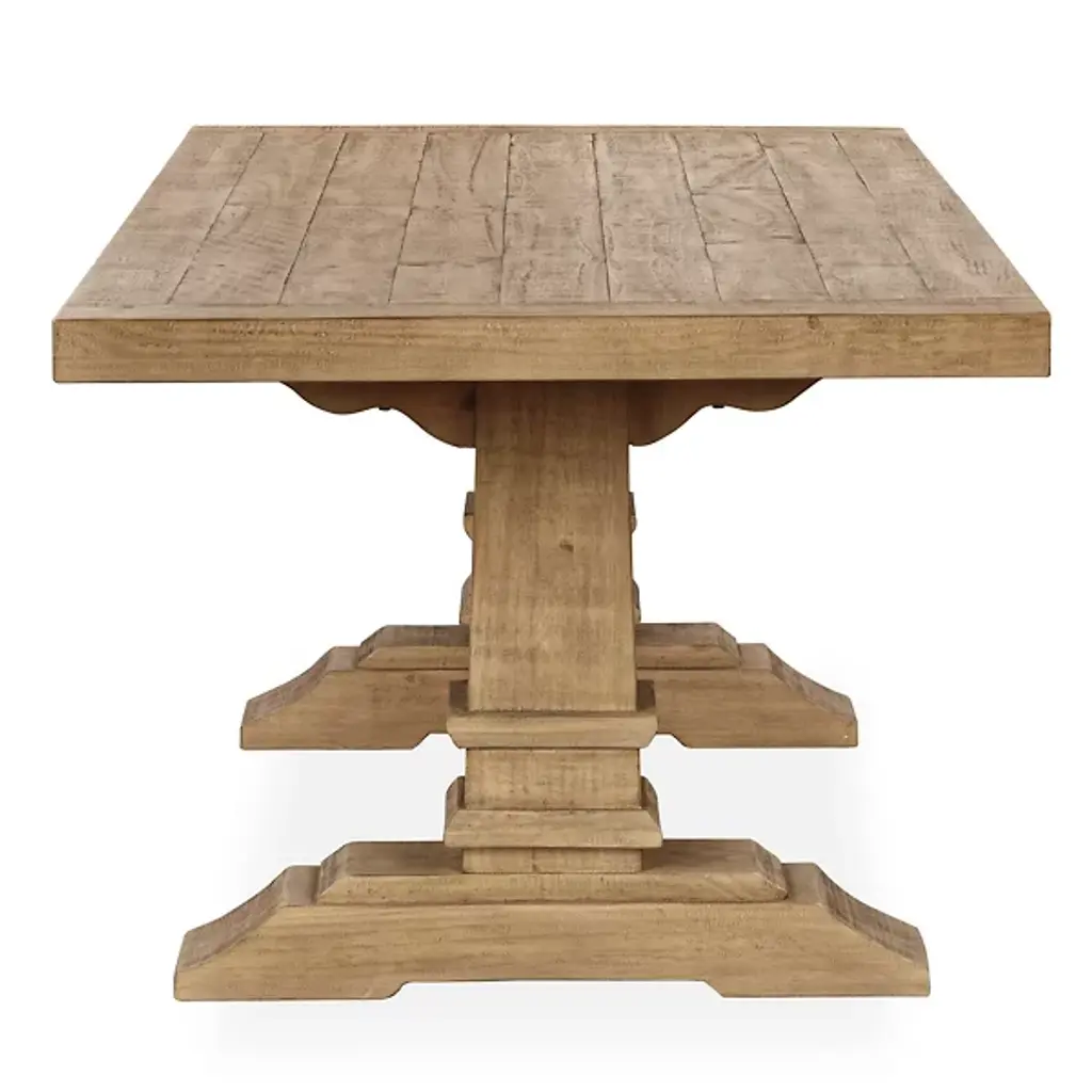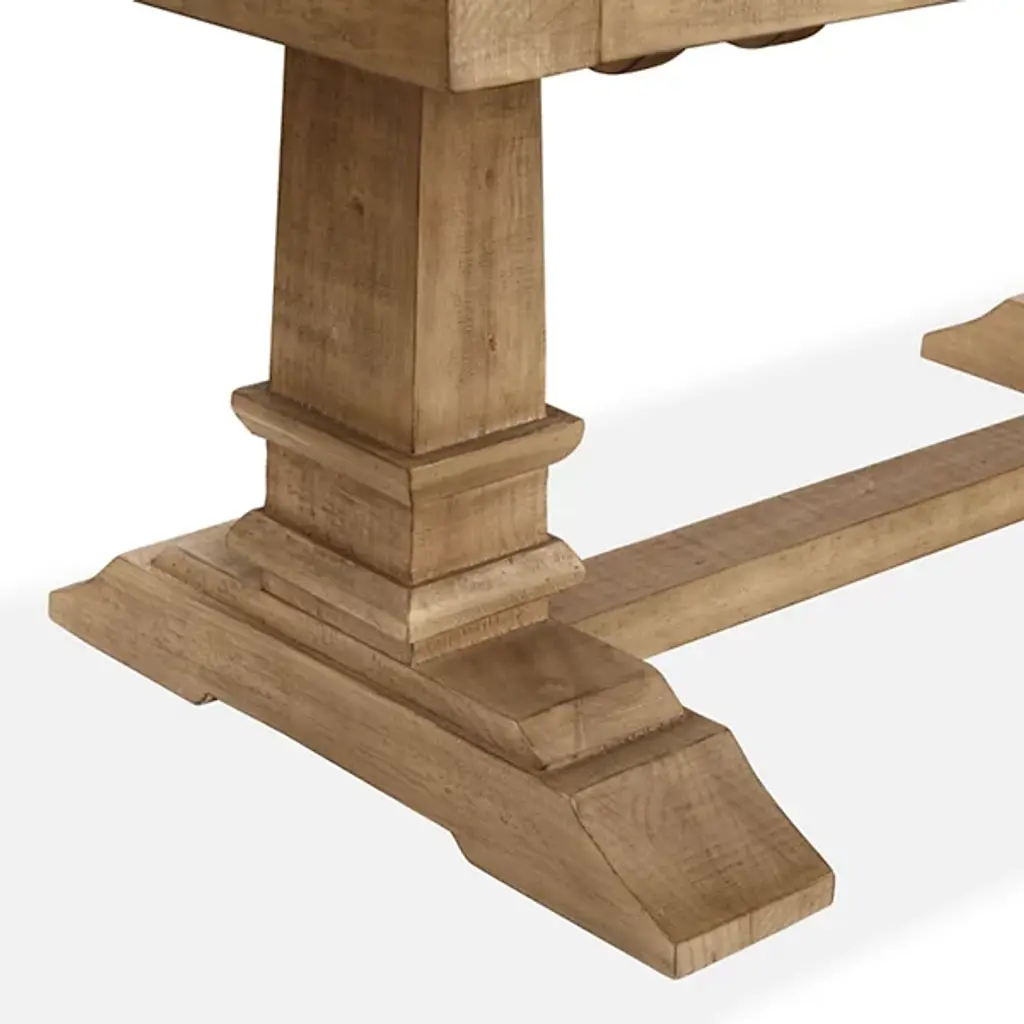 The Allegra Dining Table from Classic Home showcases its reclaimed pine construction through a hand-finished plank top that highlights the natural wood grain and weathered textures. Each board carries distinct markings from its previous use, and the water-based semi-gloss finish provides protection without masking the wood's character. The trestle base features embossed colonial-style carvings on twin pedestals, providing stable support. Its reclaimed materials offer environmental benefits alongside authentic rustic appeal that enhances homes that value both sustainability and traditional craftsmanship.