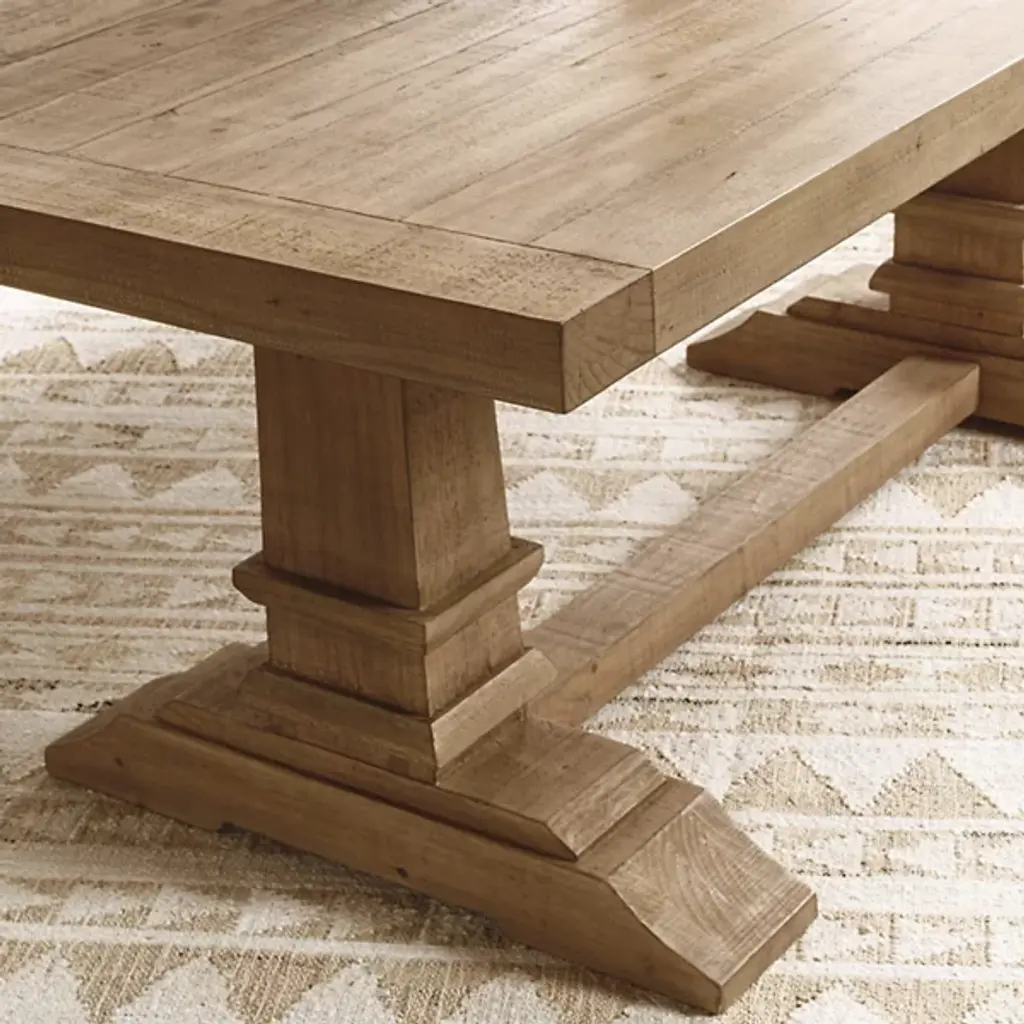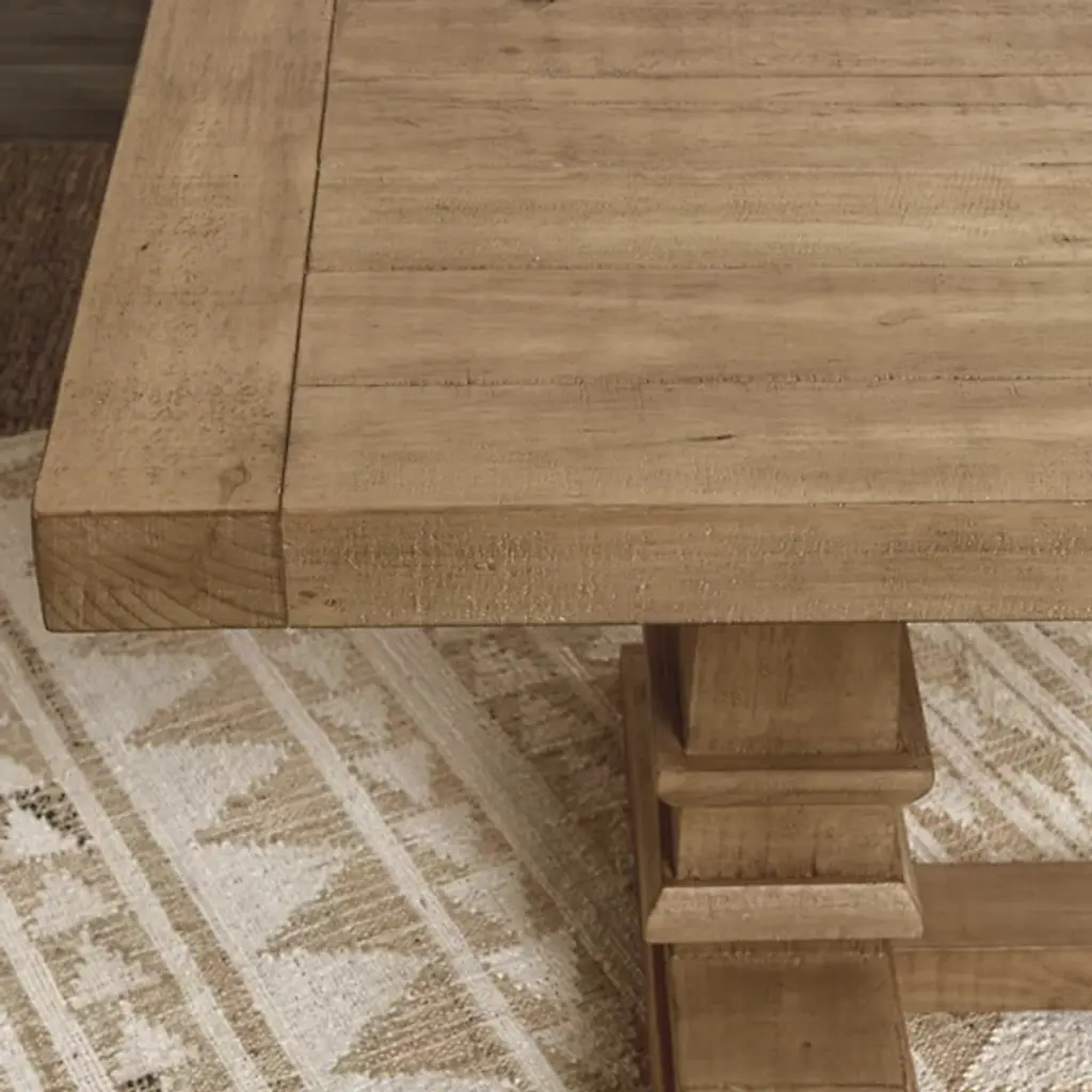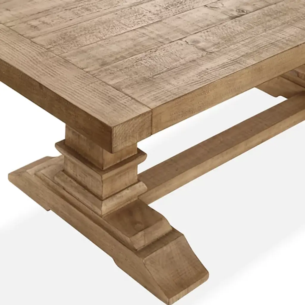 The Allegra Dining Table from Classic Home showcases its reclaimed pine construction through a hand-finished plank top that highlights the natural wood grain and weathered textures. Each board carries distinct markings from its previous use, and the water-based semi-gloss finish provides protection without masking the wood's character. The trestle base features embossed colonial-style carvings on twin pedestals, providing stable support. Its reclaimed materials offer environmental benefits alongside authentic rustic appeal that enhances homes that value both sustainability and traditional craftsmanship.