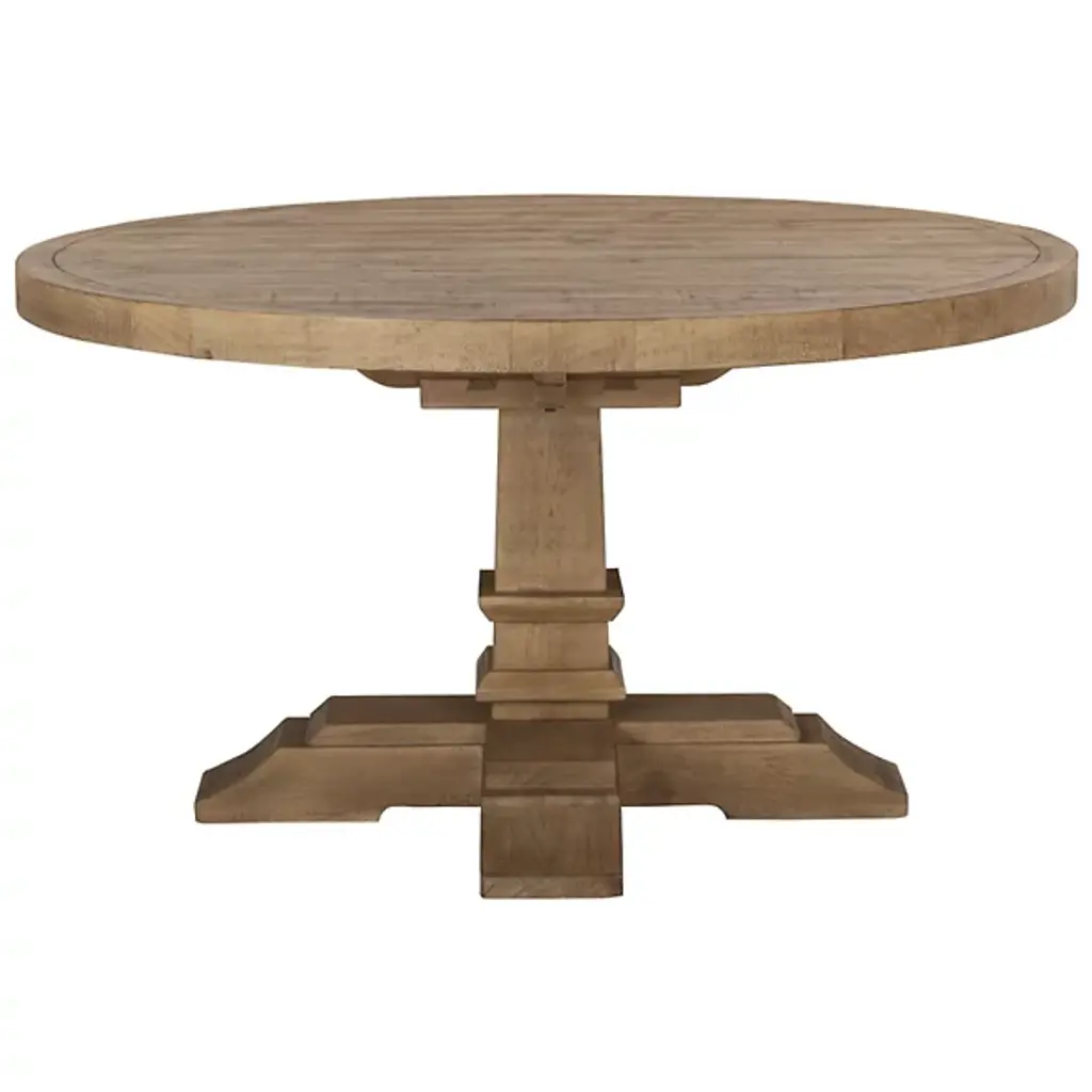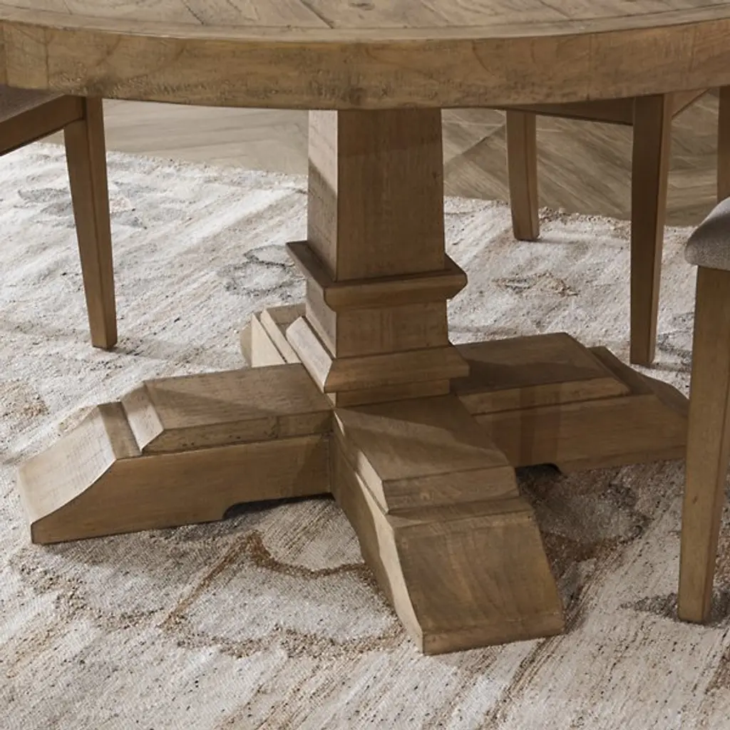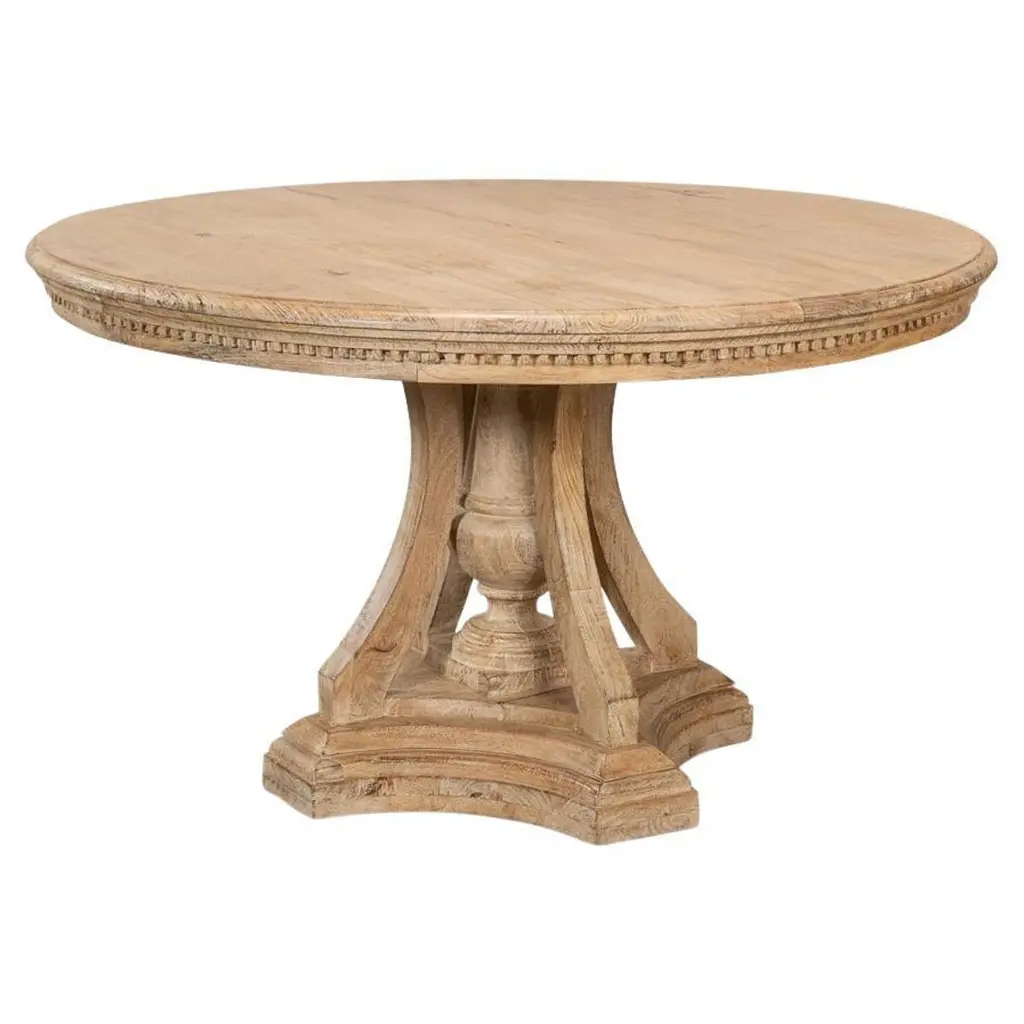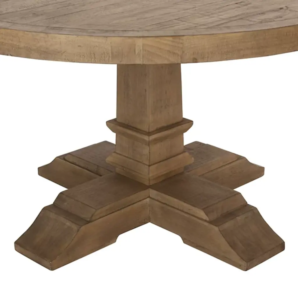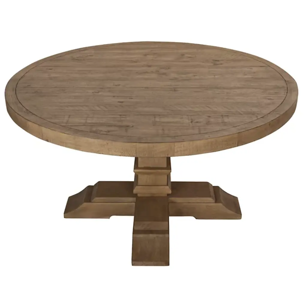 The Allegra Round Dining Table from Classic Home updates reclaimed pine planks into a circular centerpiece that seats four people comfortably around its hand-finished surface. Each board displays distinct, weathered markings from its previous use, creating visual interest across the tabletop, while the single pedestal base features embossed, colonial-style carving for structural support. Reclaimed materials develop deeper patina through daily use, making this table ideal for homes where sustainable choices and social dining experiences take priority over conventional rectangular arrangements.