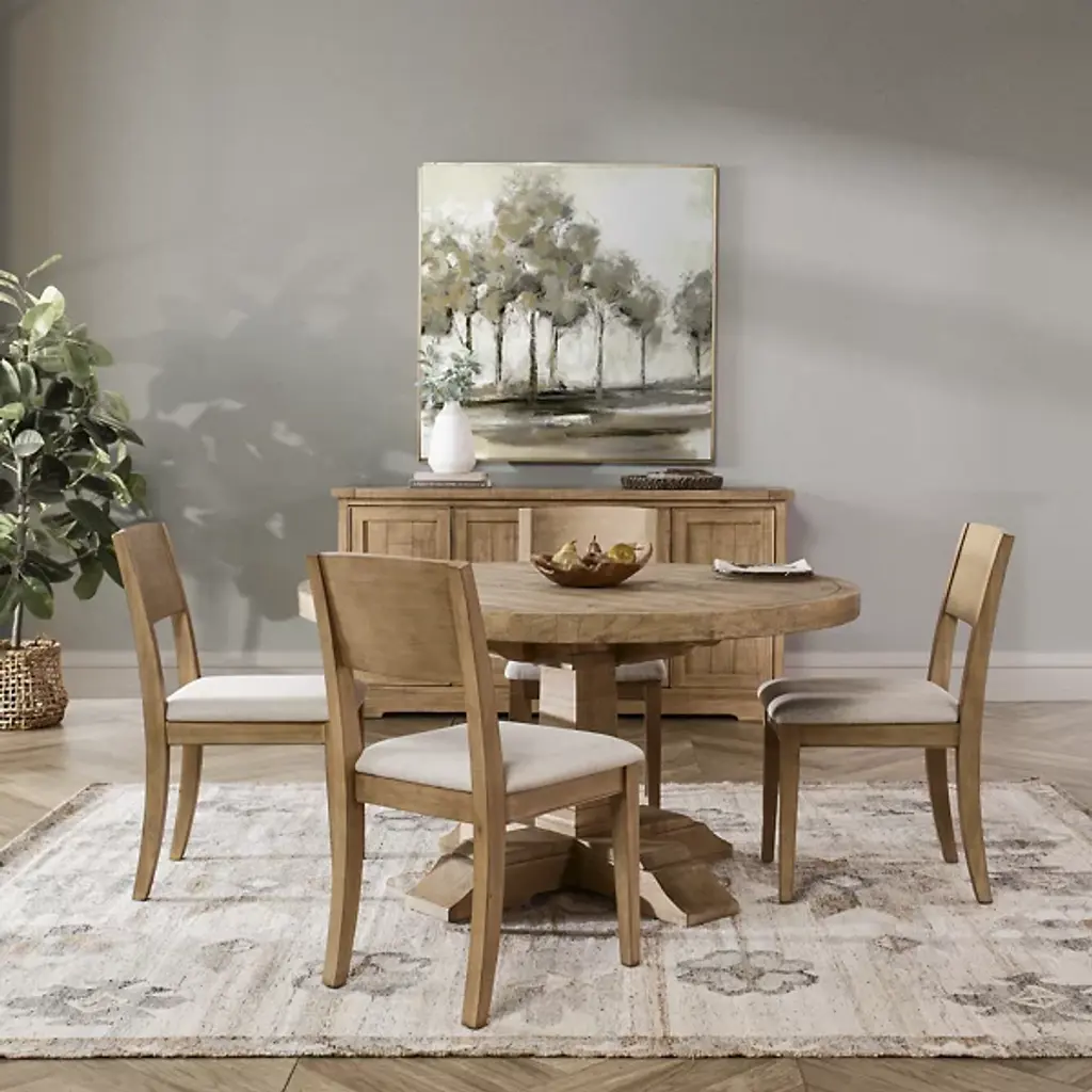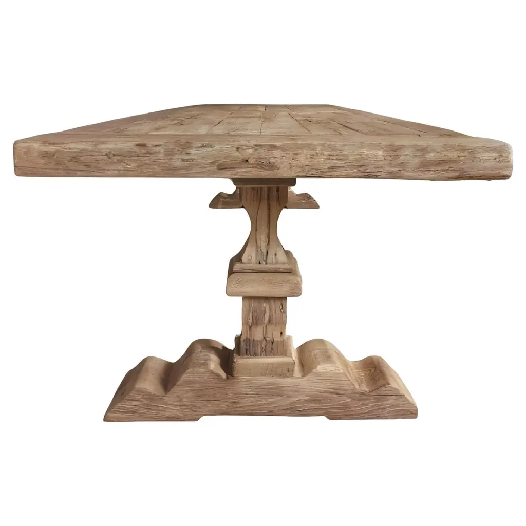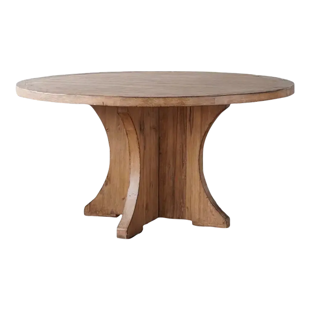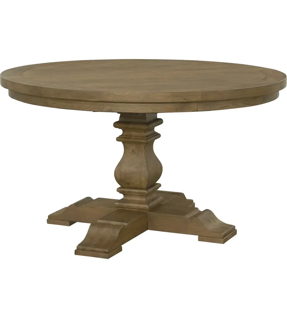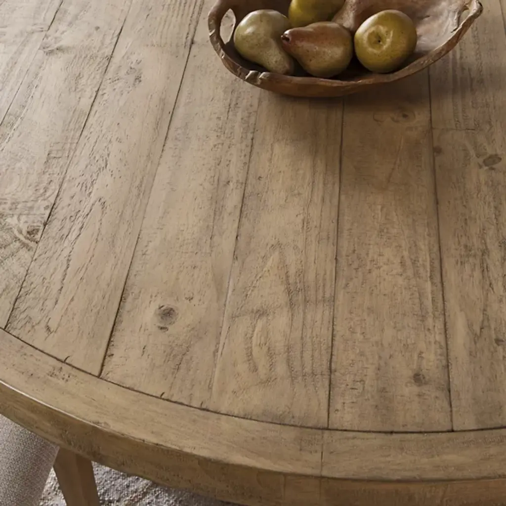 The Allegra Round Dining Table from Classic Home updates reclaimed pine planks into a circular centerpiece that seats four people comfortably around its hand-finished surface. Each board displays distinct, weathered markings from its previous use, creating visual interest across the tabletop, while the single pedestal base features embossed, colonial-style carving for structural support. Reclaimed materials develop deeper patina through daily use, making this table ideal for homes where sustainable choices and social dining experiences take priority over conventional rectangular arrangements.