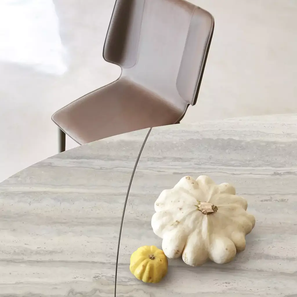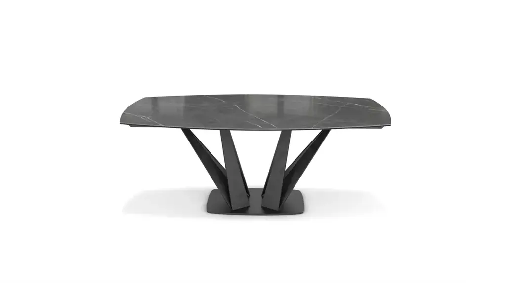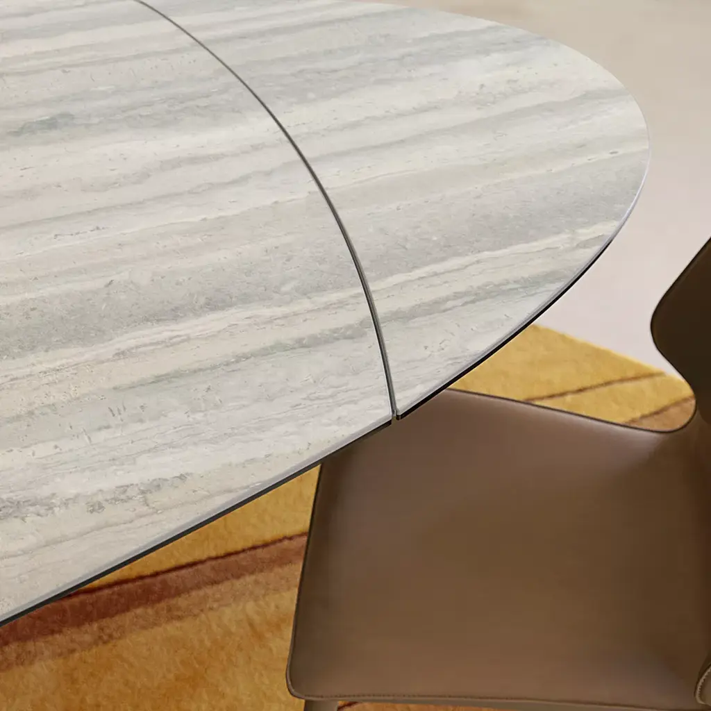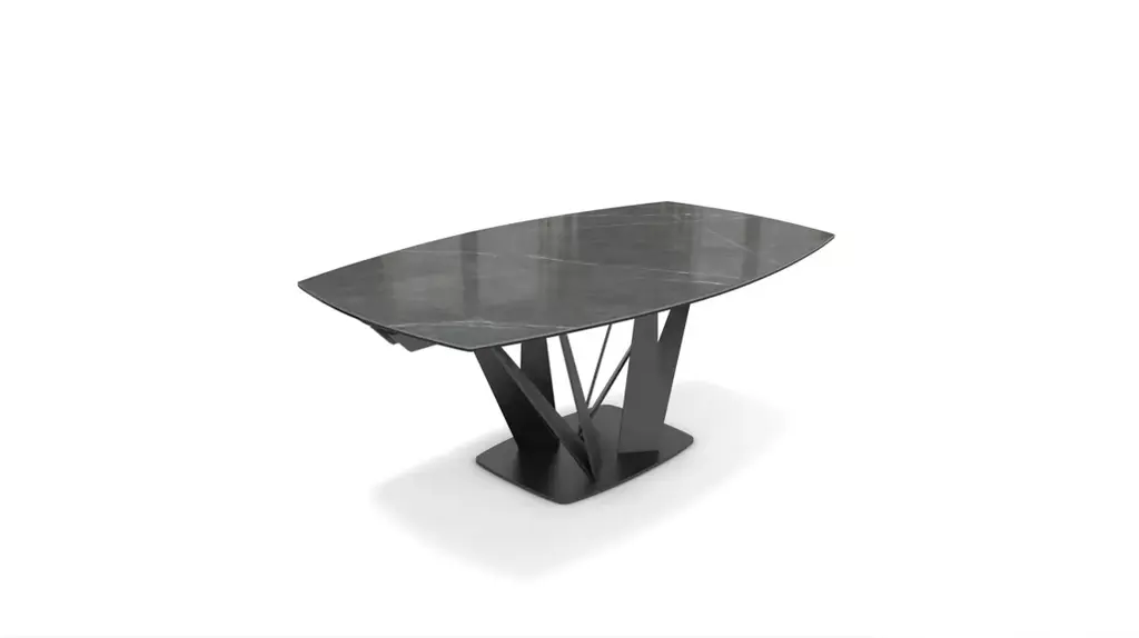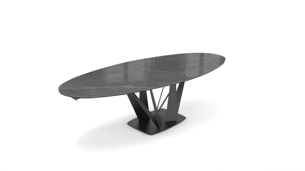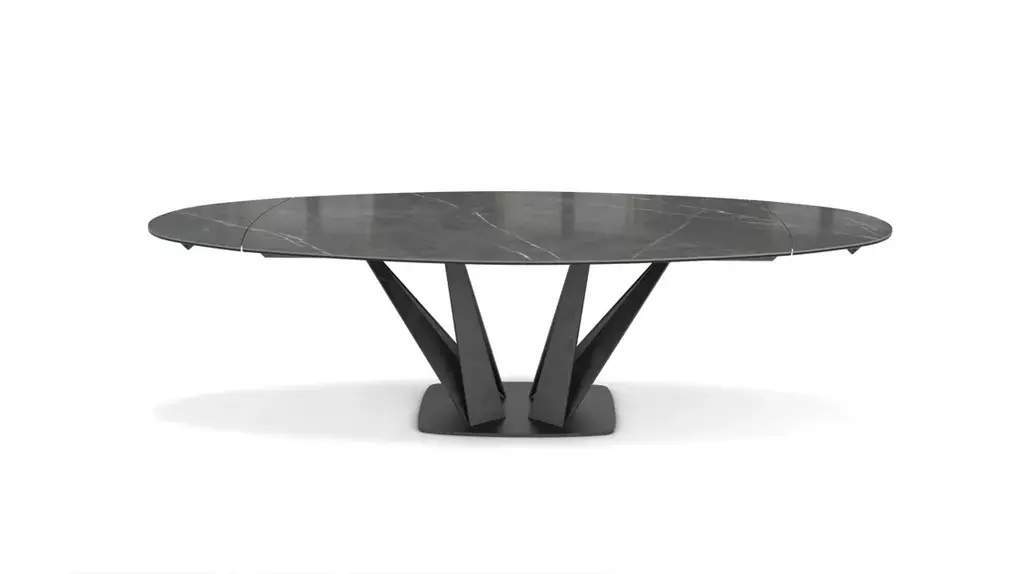 The central base of this model is made up of a bundle of steel trapezoids that come together at the bottom and flare out toward the top to create constantly renewed perspectives. The composite top is made of ceramic/glass (many finishes available). This barrel-shaped version becomes a beautiful oval when the two extension leafs unfold. A fixed oval version with the same dimensions as the opened extension leaves is also available.