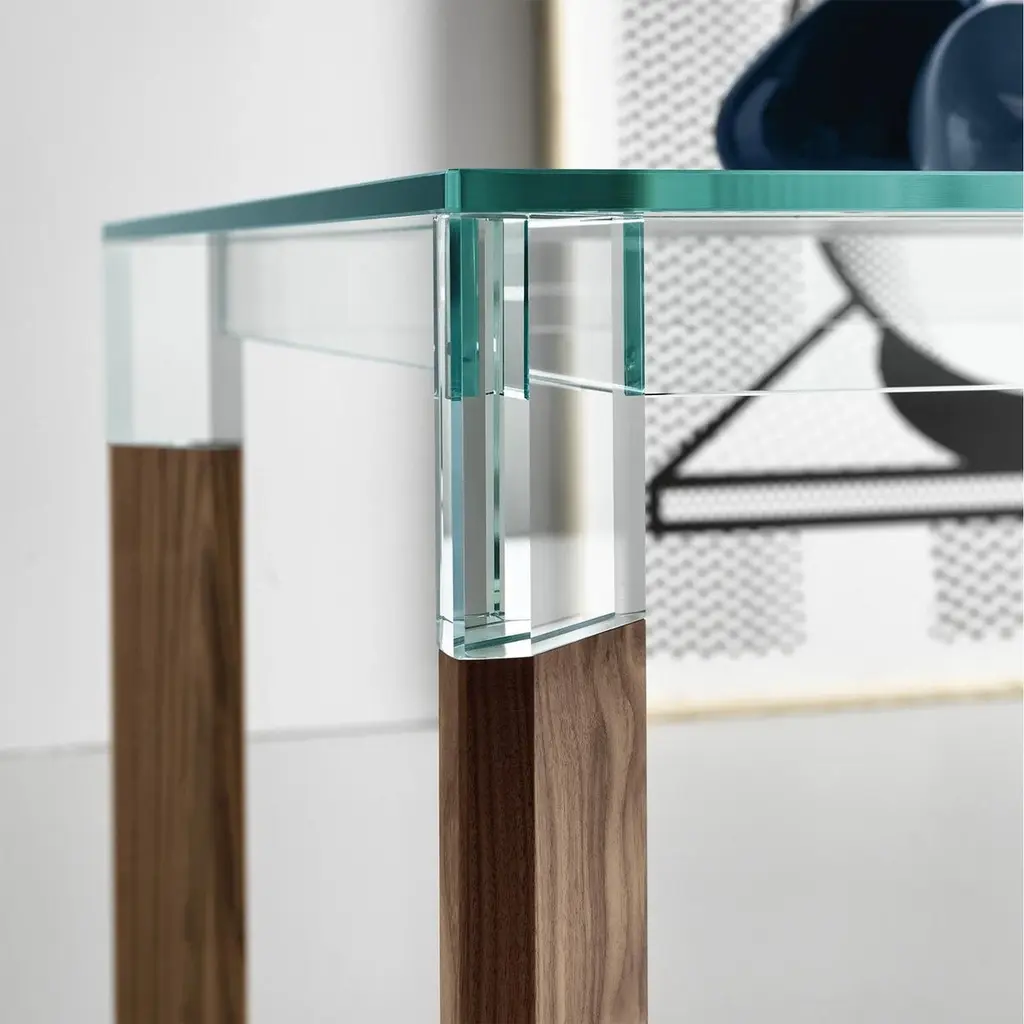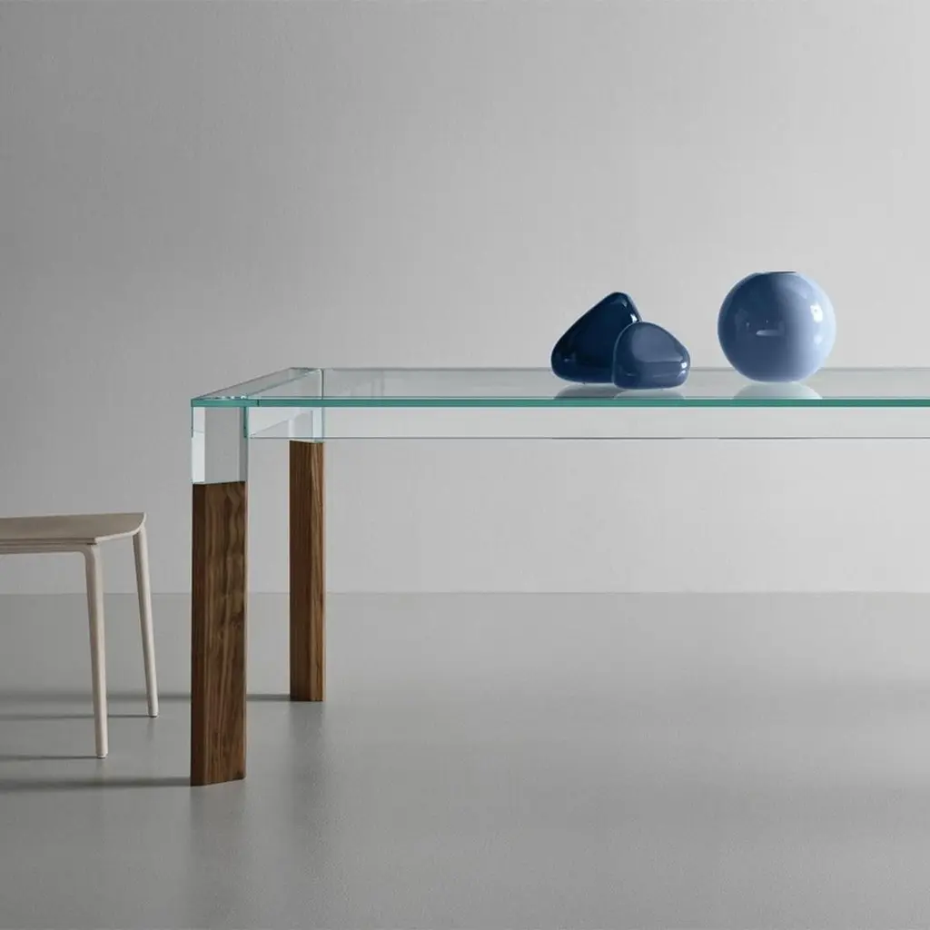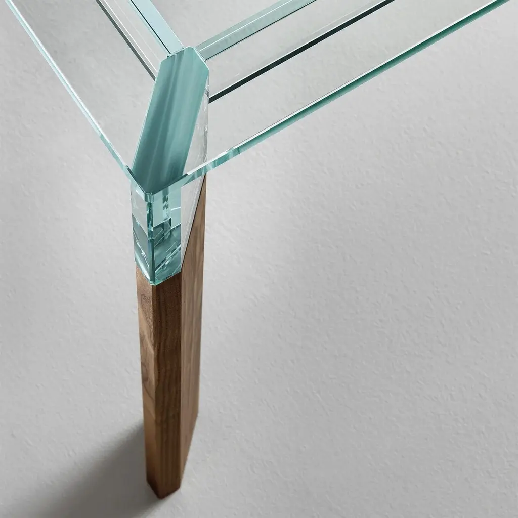 Dining Table Alliage Walnut with clear glass topand with 4 solid walnut wood feet.Also available on request with solid oak feet in natural finish.