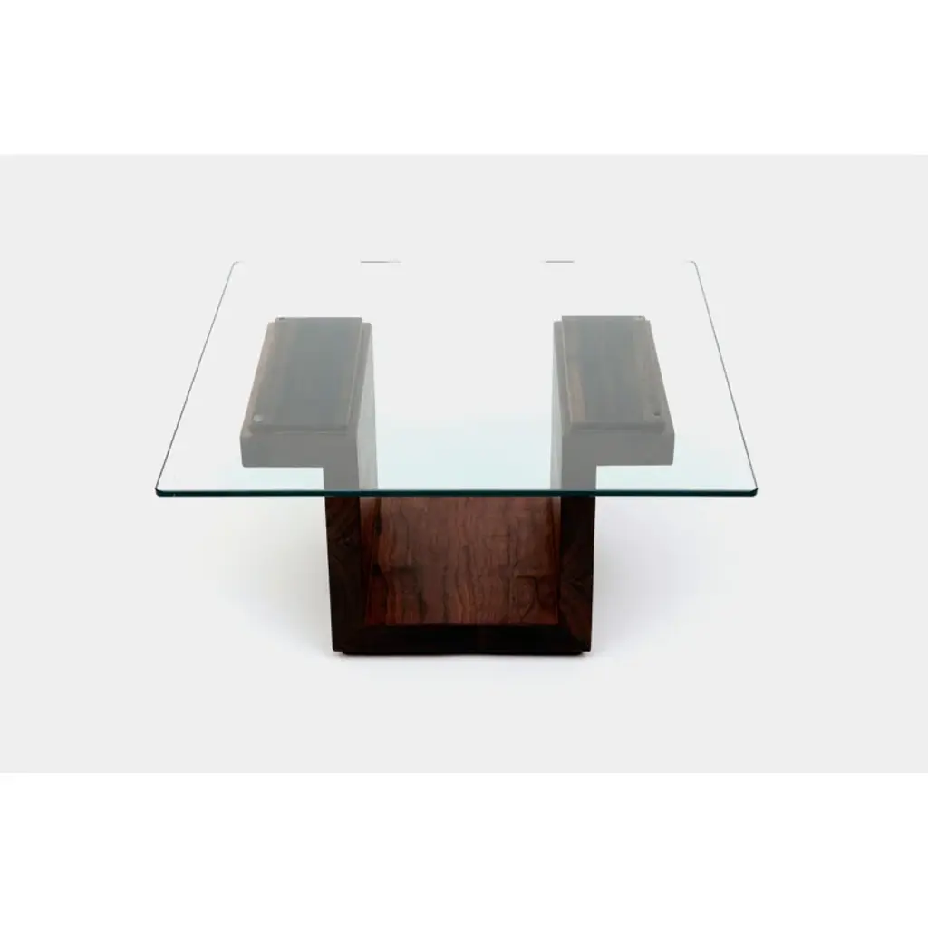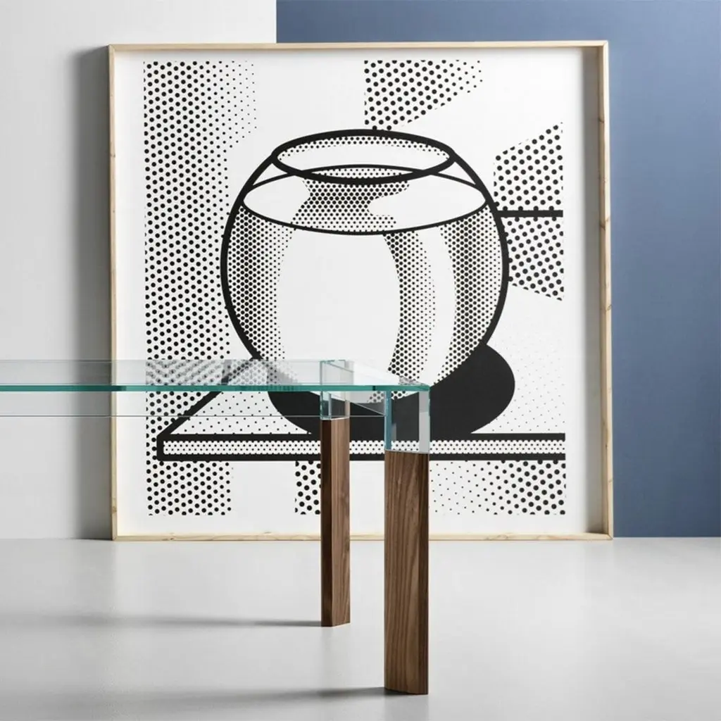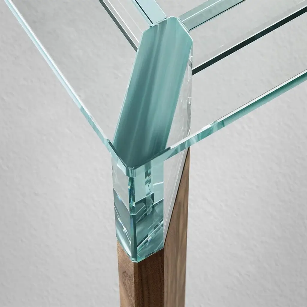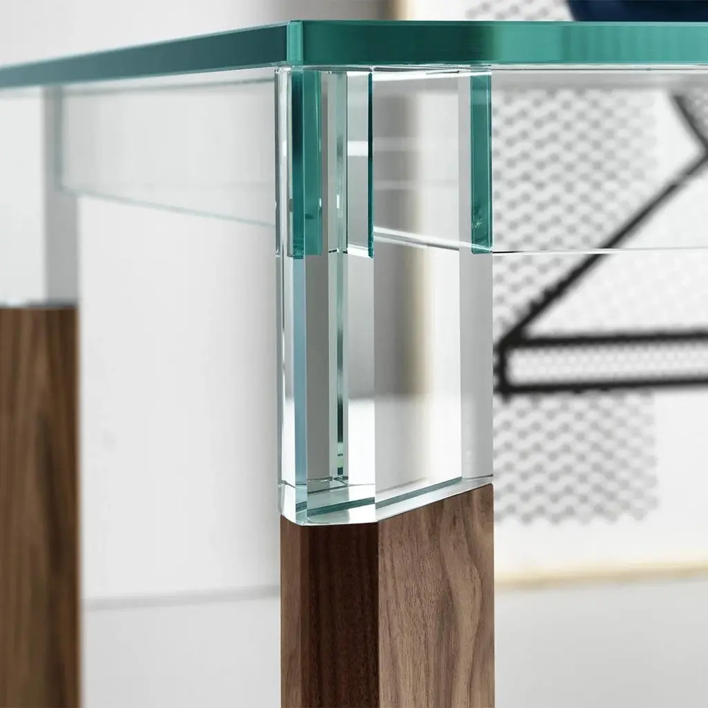Dining Table Alliage Walnut with clear glass topand with 4 solid walnut wood feet.Also available on request with solid oak feet in natural finish.