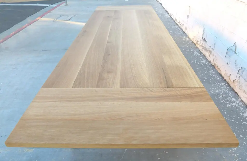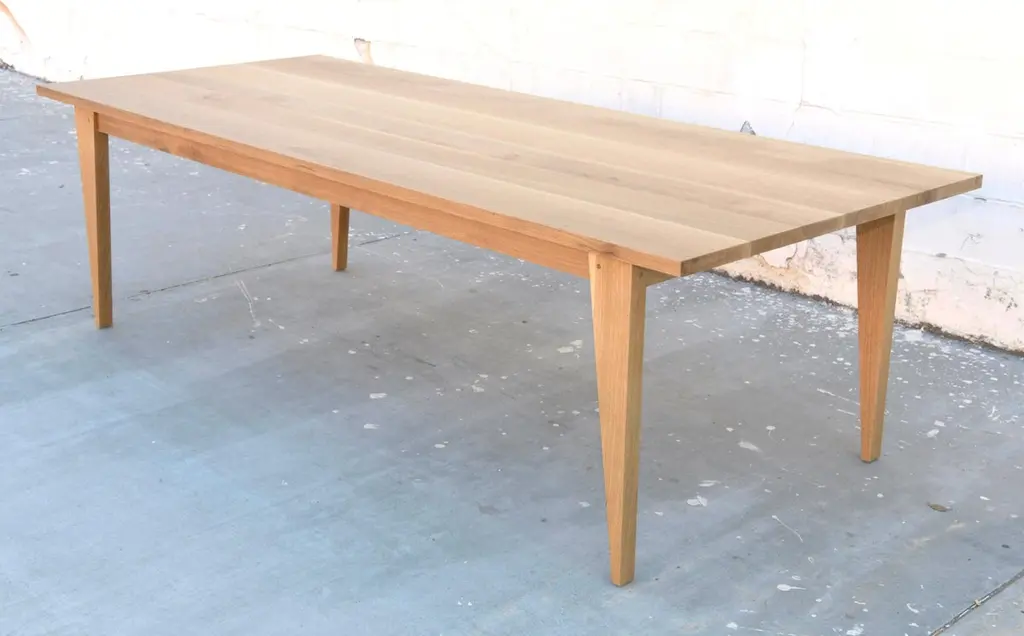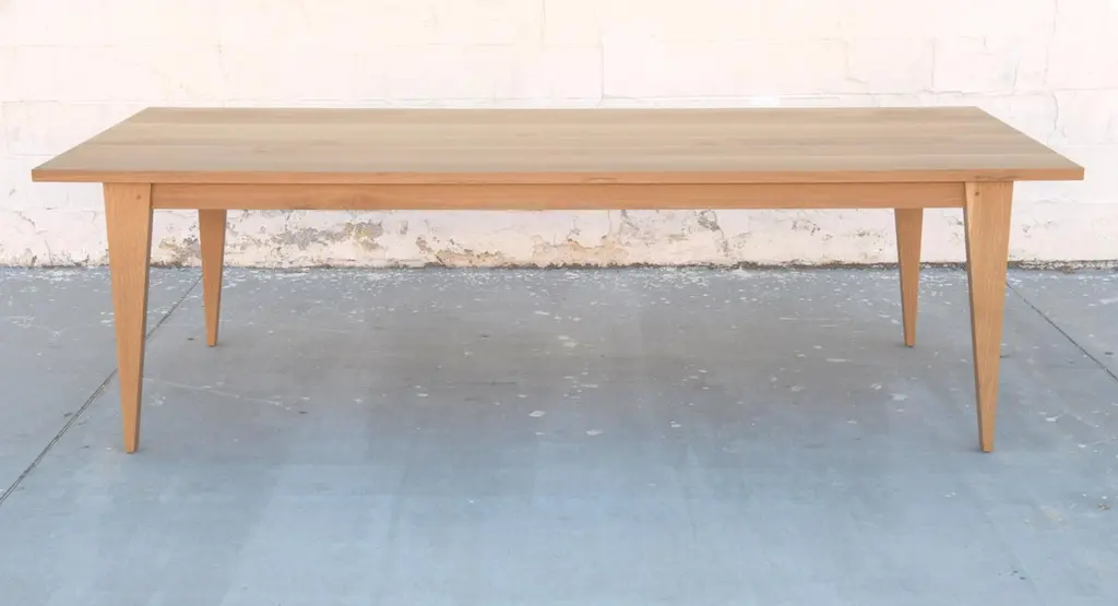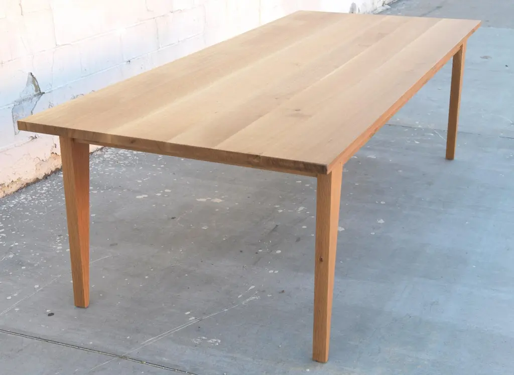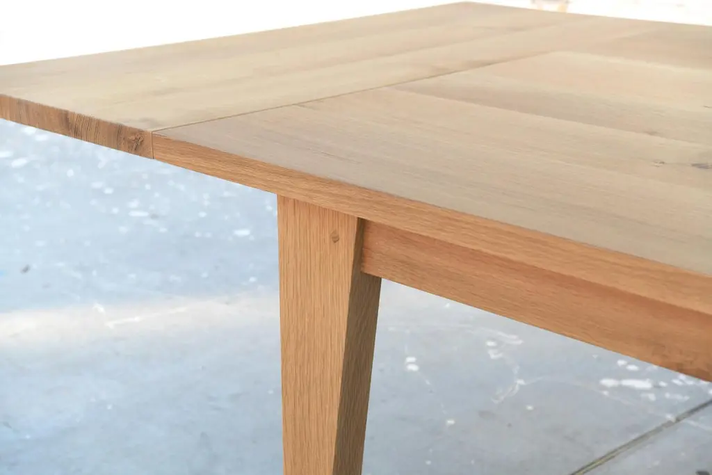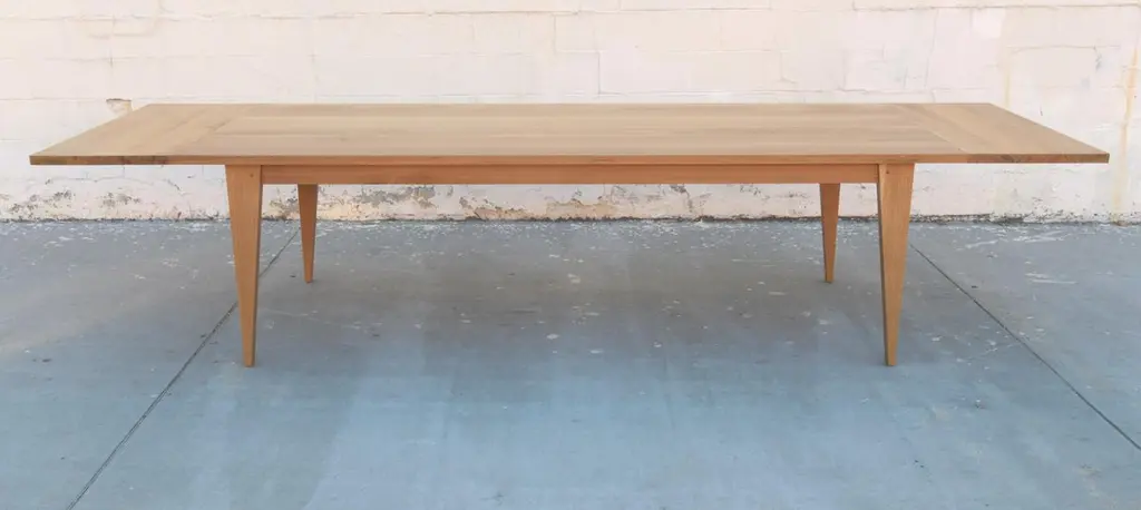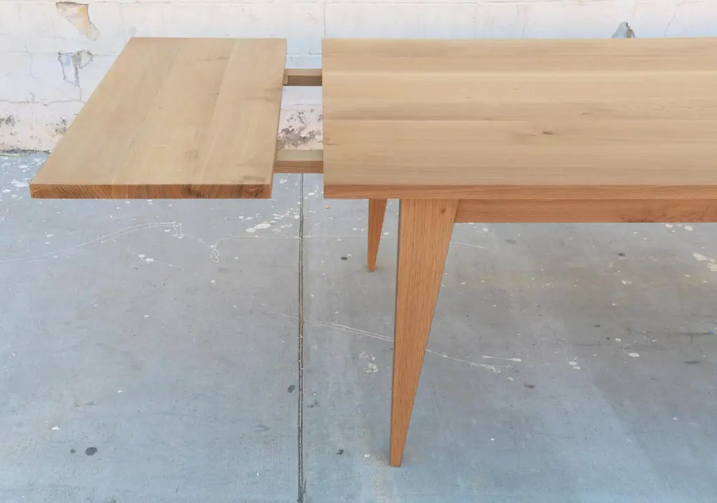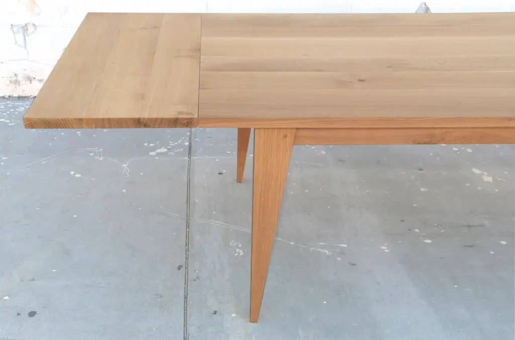 This custom dining table made from quarter sawn oak expands from 102" x 42" to 138" in length using two 18" leaves. Because each table is bench-made in our own Los Angeles workshop you can influence all aspects of design, including size, wood species and finish. We use only traditional carpentry techniques, no nails or metal fasteners of any kind, just mortise and tenon construction reinforced with handcut wooden dowels.If you require customized overhang dimensions please stipulate with order.