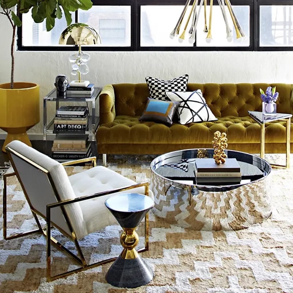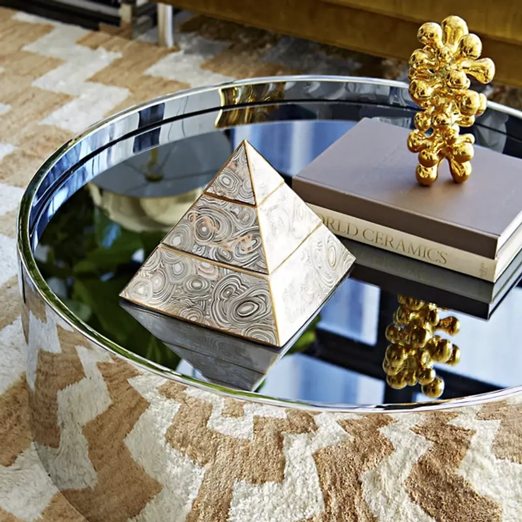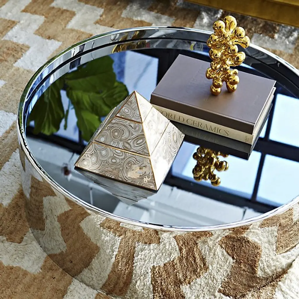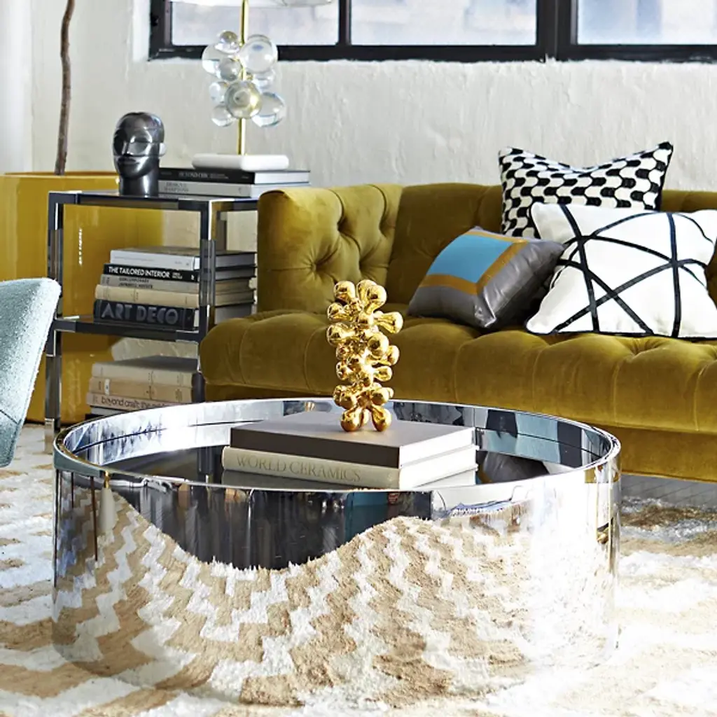 The future of modern cocktail tables. The Jonathan Adler Alphaville Cocktail Table features a sleek and minimalist design with its circular, drum shape. Choose between a solid polished stainless steel base with a smoke mirror top or solid honed brass base with a lacquer topcoat and black mirror top. Its reflective nature helps keep Alphaville the focal point in the room while remaining sophisticated and light. Ideal for any living room, dining room or bedroom depending on your personal style.