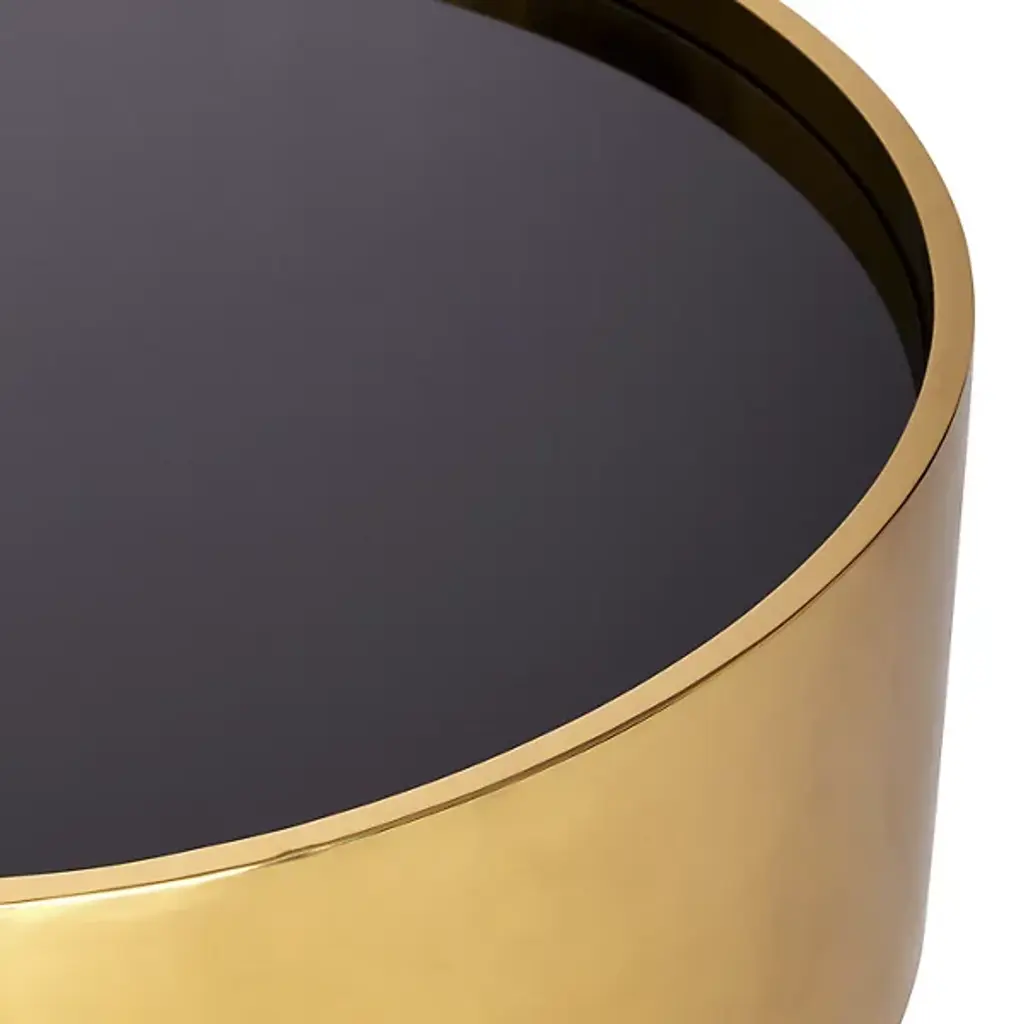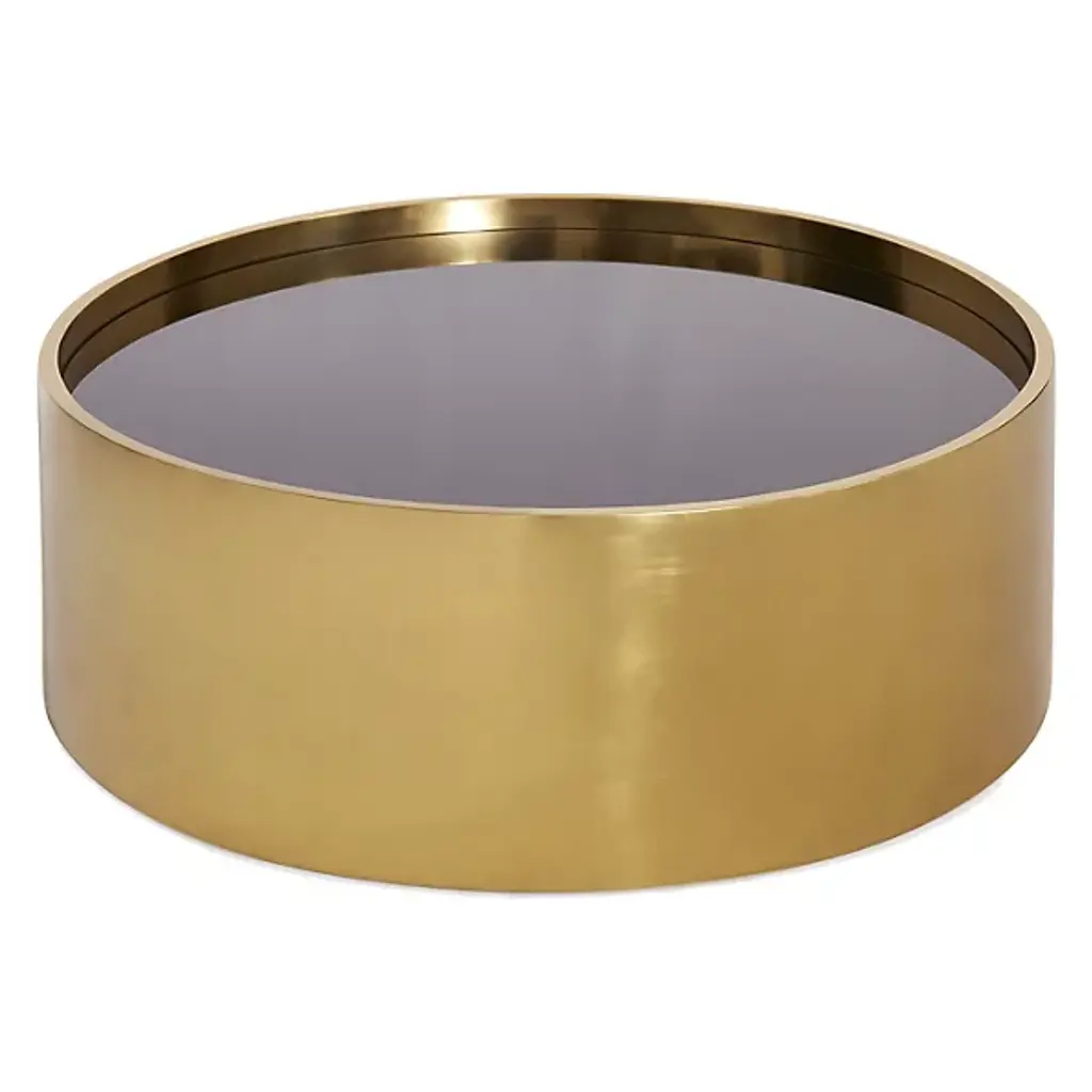 The future of modern cocktail tables. The Jonathan Adler Alphaville Cocktail Table features a sleek and minimalist design with its circular, drum shape. Choose between a solid polished stainless steel base with a smoke mirror top or solid honed brass base with a lacquer topcoat and black mirror top. Its reflective nature helps keep Alphaville the focal point in the room while remaining sophisticated and light. Ideal for any living room, dining room or bedroom depending on your personal style.
