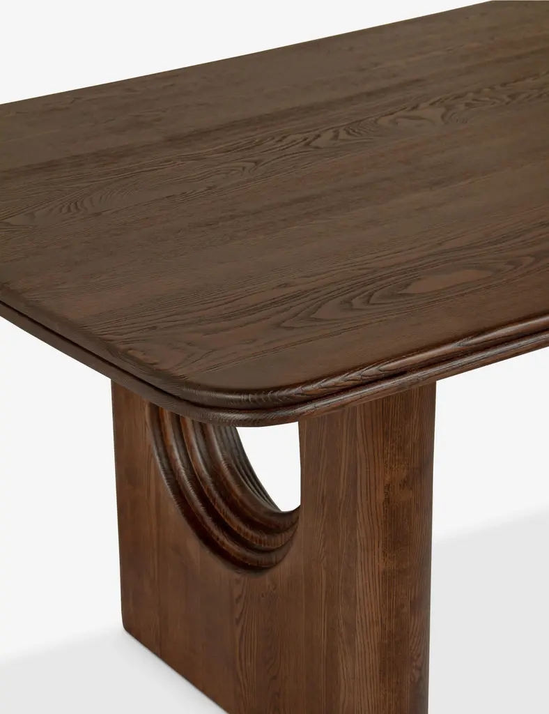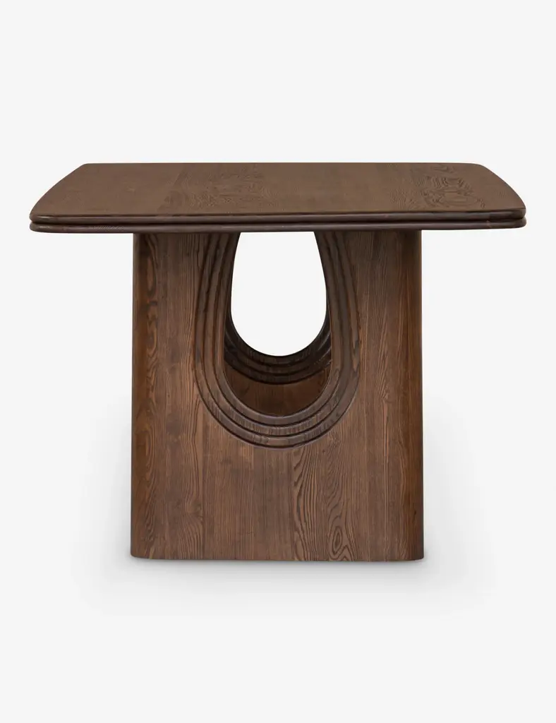 Set a new foundation for dining with the Alvaro table. Two inverted arched legs offer a sturdy bearing with a stately presence in the room. A brown oil finish highlights the grain of this ash wood dining table in a beautiful, deep tone, set for transitional appeal.