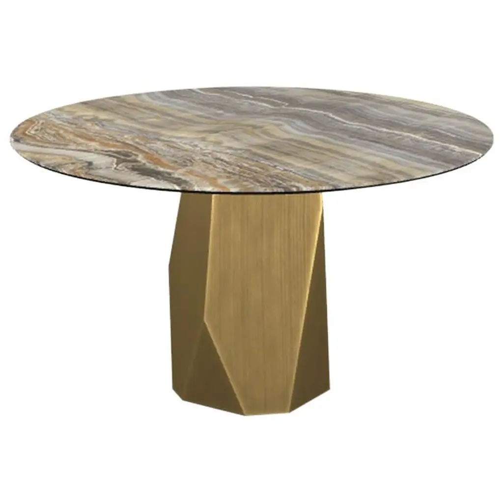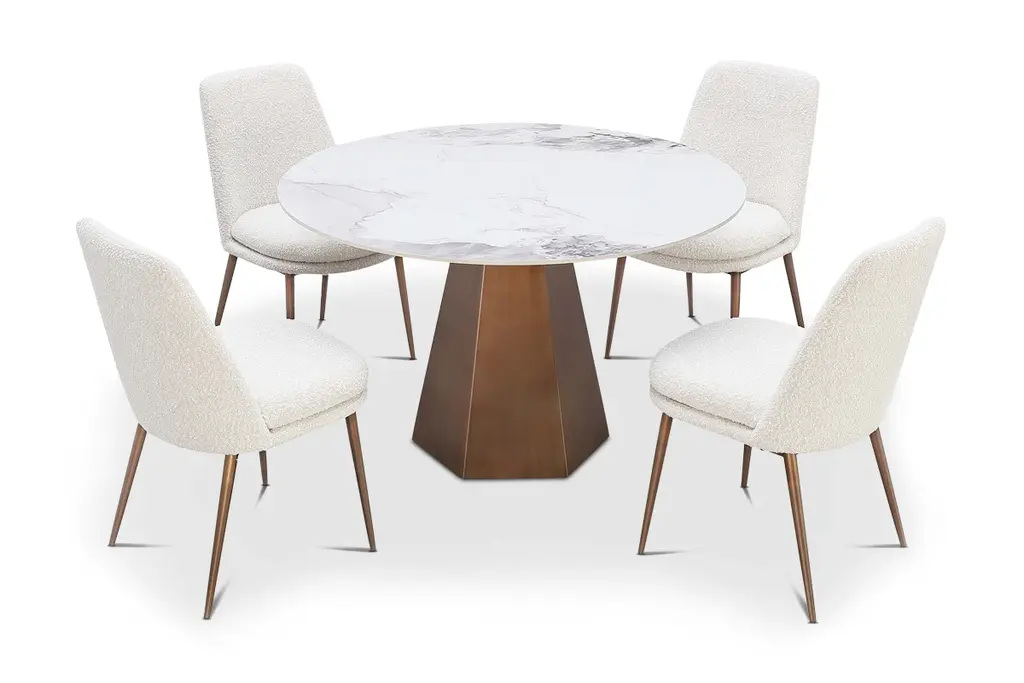 The Amalfi Round Dining Table is a masterpiece of mixing materials, contrasting a standout white stone table top with an earthy steel base for a unique, durable living room centerpiece. Its white sintered stone tabletop ensures unmatched scratch and heat resistance, while marble veining gives the pieces a luxurious, polished look. The brushed bronze hexagonal base adds visual impact, contrasting the soft curve of the circular tabletop. With the ability to comfortably seat up to 6 people and non-marking nylon levelers for stability, this table is a must-have for any dining room.