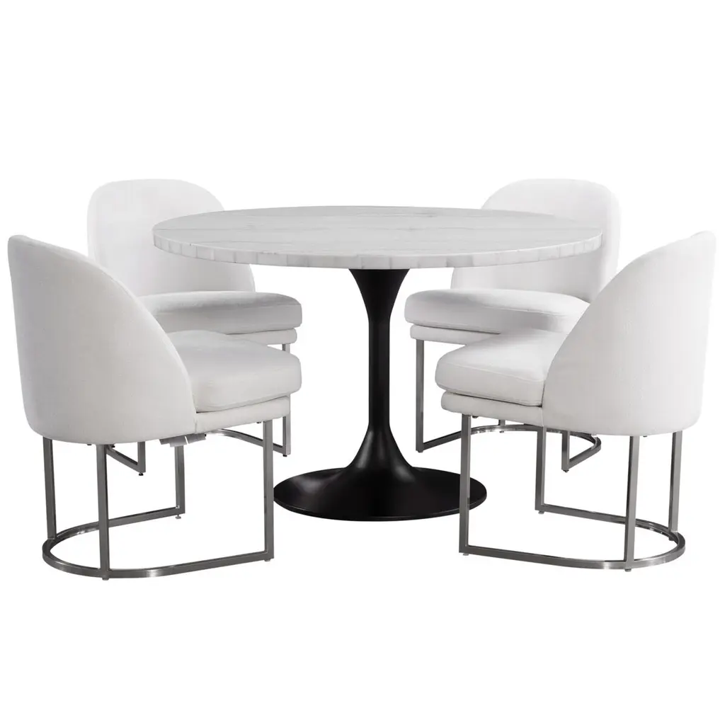 The Amanda Dining Table embodies modern sophistication with its elegant design and natural variations. This table comfortably seats four, offering a sophisticated setting for any dining occasion. It's a perfect blend of form and function, designed to complement a range of interior styles with its timeless appeal and graceful presence. The table's silhouette is defined by a tulip base, providing a contemporary twist on a classic design. Measuring 48 inches in diameter, it serves as an exquisite centerpiece for smaller dining spaces or a stylish accent in a larger room.