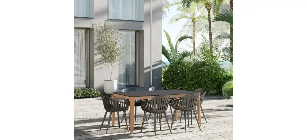 Amazonia outdoor dining focuses on contemporary and modern design, comfort, and the durability of this piece. This table is crafted to enhance your outdoor areas with modern lines and colors. Wood materials are made of 100% FSC certified eucalyptus with premium finishes and certified quality teak wood. Also includes materials that are perfect for outdoors because of their durability and weather resistance. Immerse yourself in the Amazonia outdoor dining table.