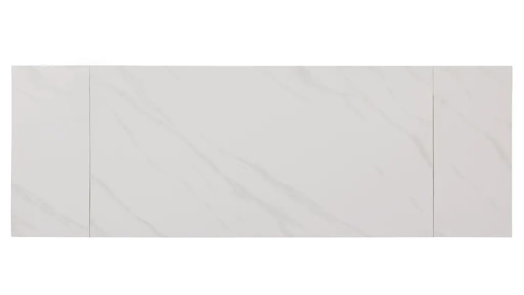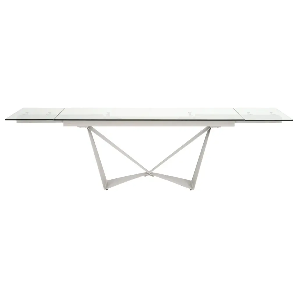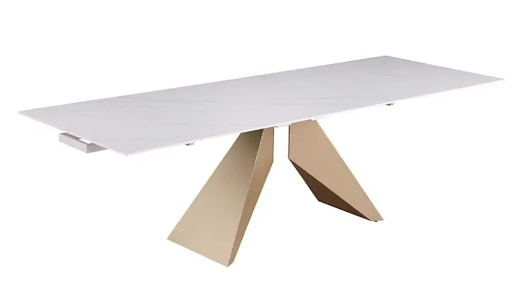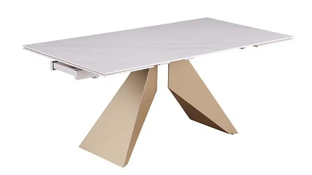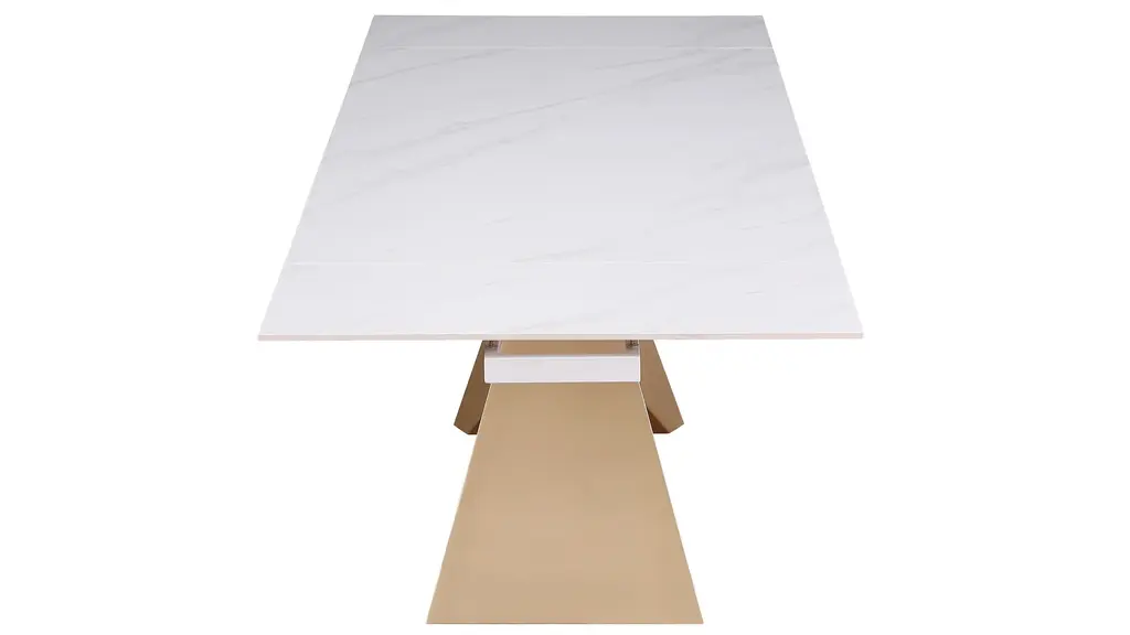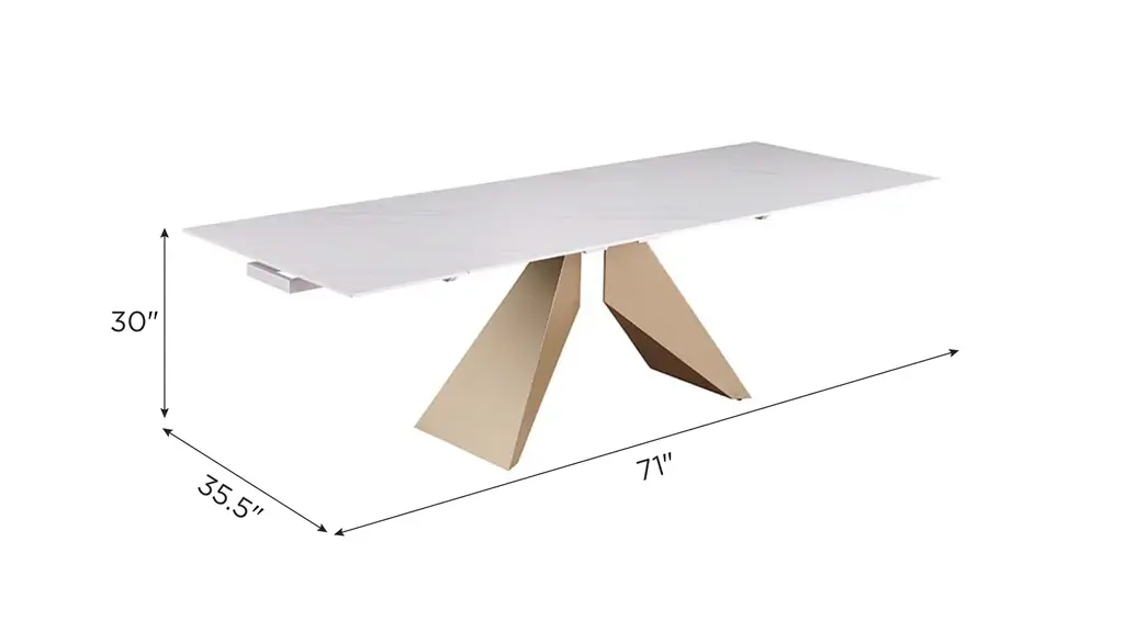 Gather around the stylish, contemporary ceramic extendable Amelia Dining Table. This table opens from 71" to 102", accommodating more guests for any gathering. The Two pull-out extensions are easy to use and make it an easy adaptation to meet the needs of any occasion. The table also features a unique open pyramidal steel base in a beautiful champagne finish. Gaze down on a beautiful matte white marbleized ceramic top, that brings classic style into any area.