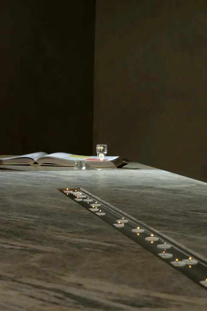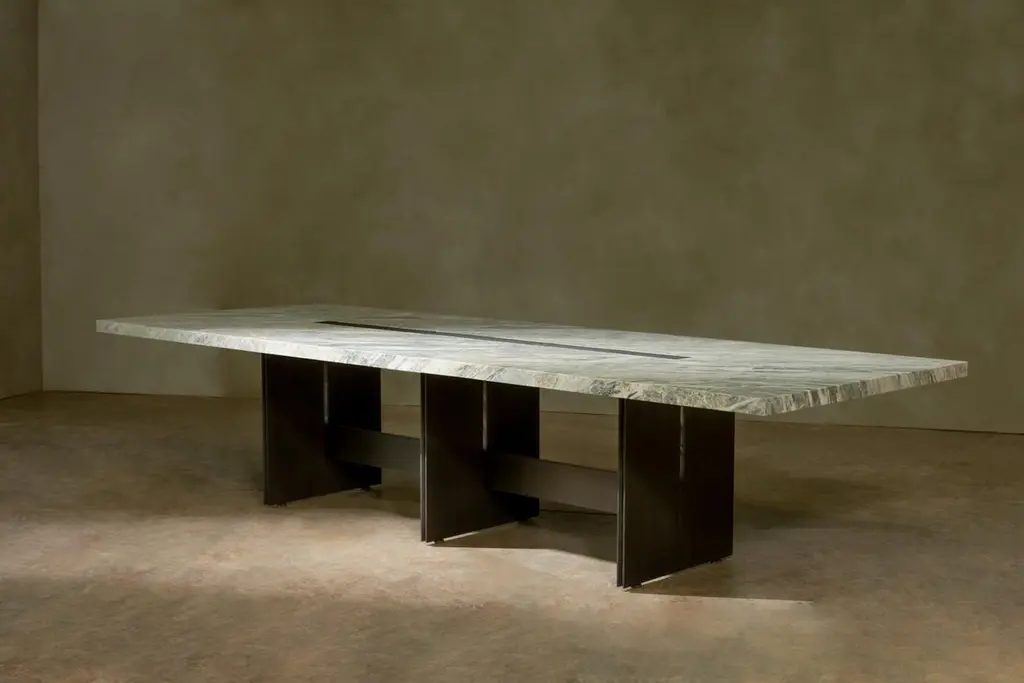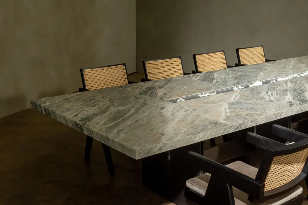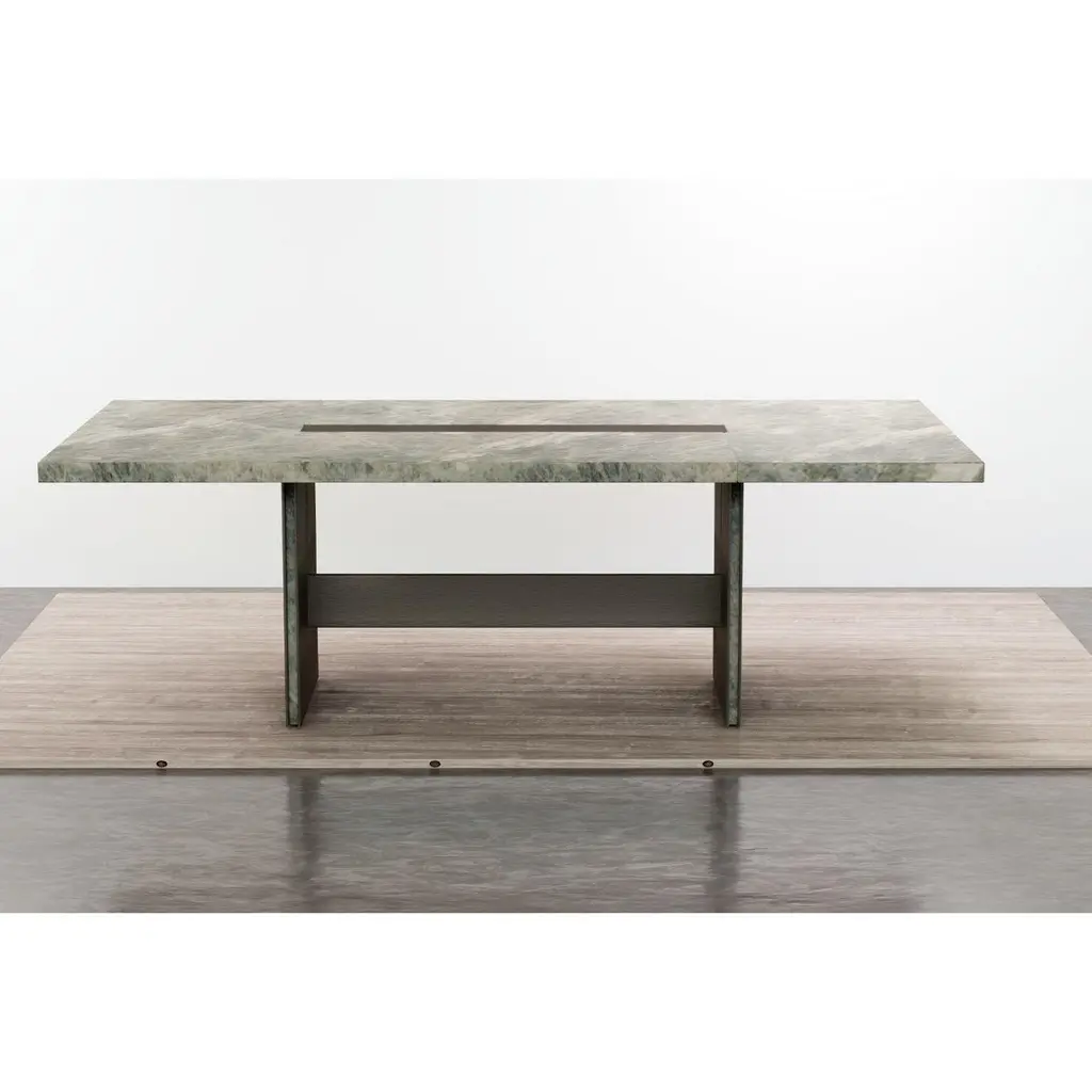 Amena dining table by Simon HamuiDimensions: D 330 x W 150 x H 73 cm Materials: stone, acrylicAlso available in different dimensions. Dining table designed to seat up to 20 people. The table top is made of stonewith a linear cutout down the center that includes an acrylic vase for flowers orfloating candles. When smaller table settings are needed, the two side elements of the table, made of wood can serve as support pieces either for serving or decorative objects.Simonhamui Collection is a line of high-end furniture created by Simon Hamui. The collection is another expansion of the brand that brings together classic pieces and represents his style and body of work throughout the years.The pieces in the collection are timeless and versatile and can work well in a variety of spaces both individually or in conjunction.