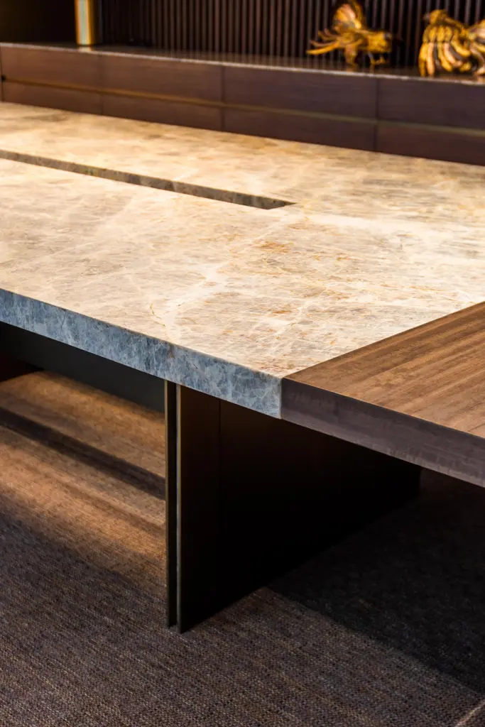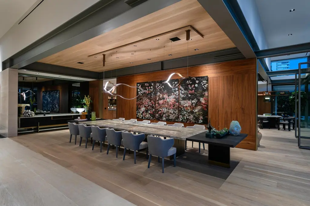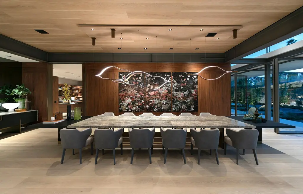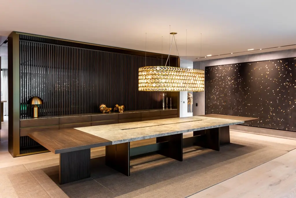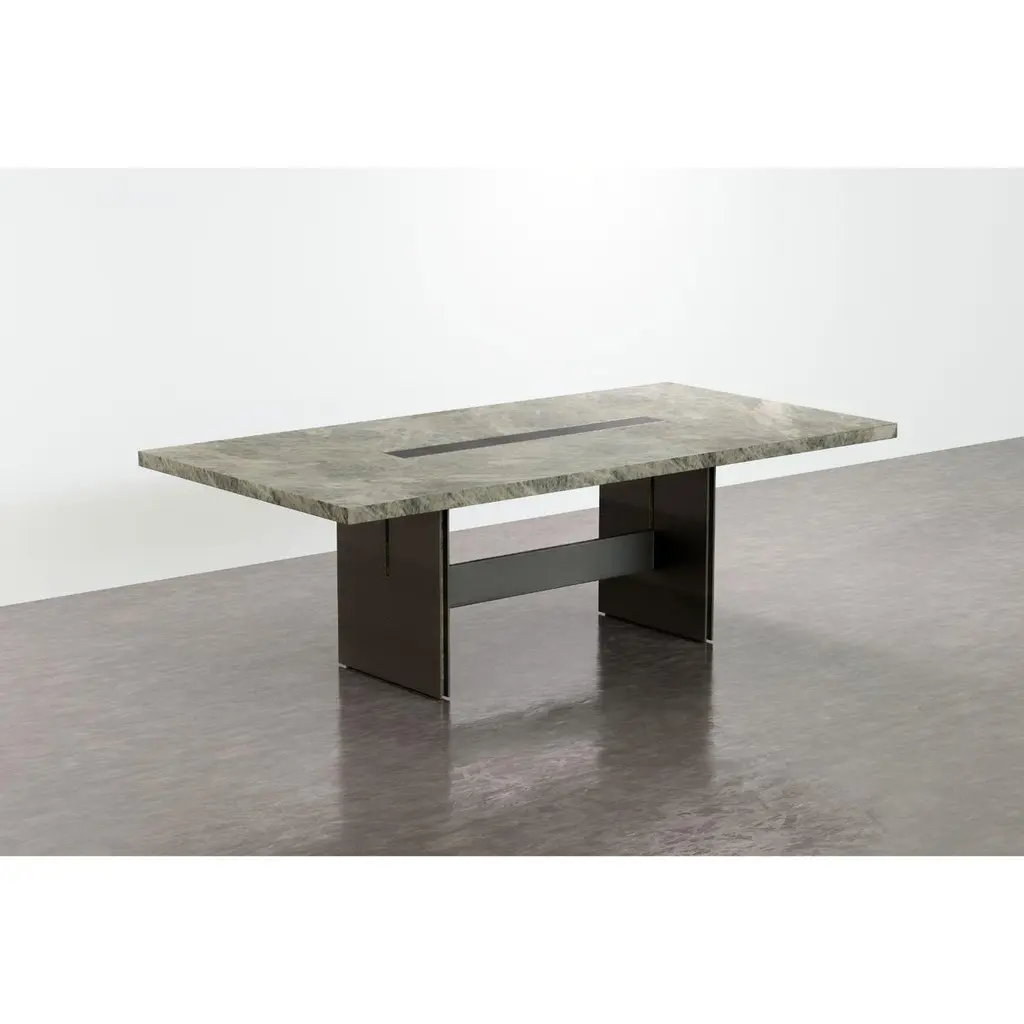 Amena dining table by Simon HamuiDimensions: D 330 x W 150 x H 73 cm Materials: stone, acrylicAlso available in different dimensions. Dining table designed to seat up to 20 people. The table top is made of stonewith a linear cutout down the center that includes an acrylic vase for flowers orfloating candles. When smaller table settings are needed, the two side elements of the table, made of wood can serve as support pieces either for serving or decorative objects.Simonhamui Collection is a line of high-end furniture created by Simon Hamui. The collection is another expansion of the brand that brings together classic pieces and represents his style and body of work throughout the years.The pieces in the collection are timeless and versatile and can work well in a variety of spaces both individually or in conjunction.
