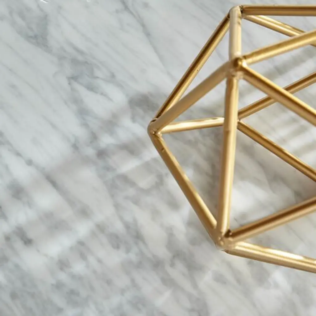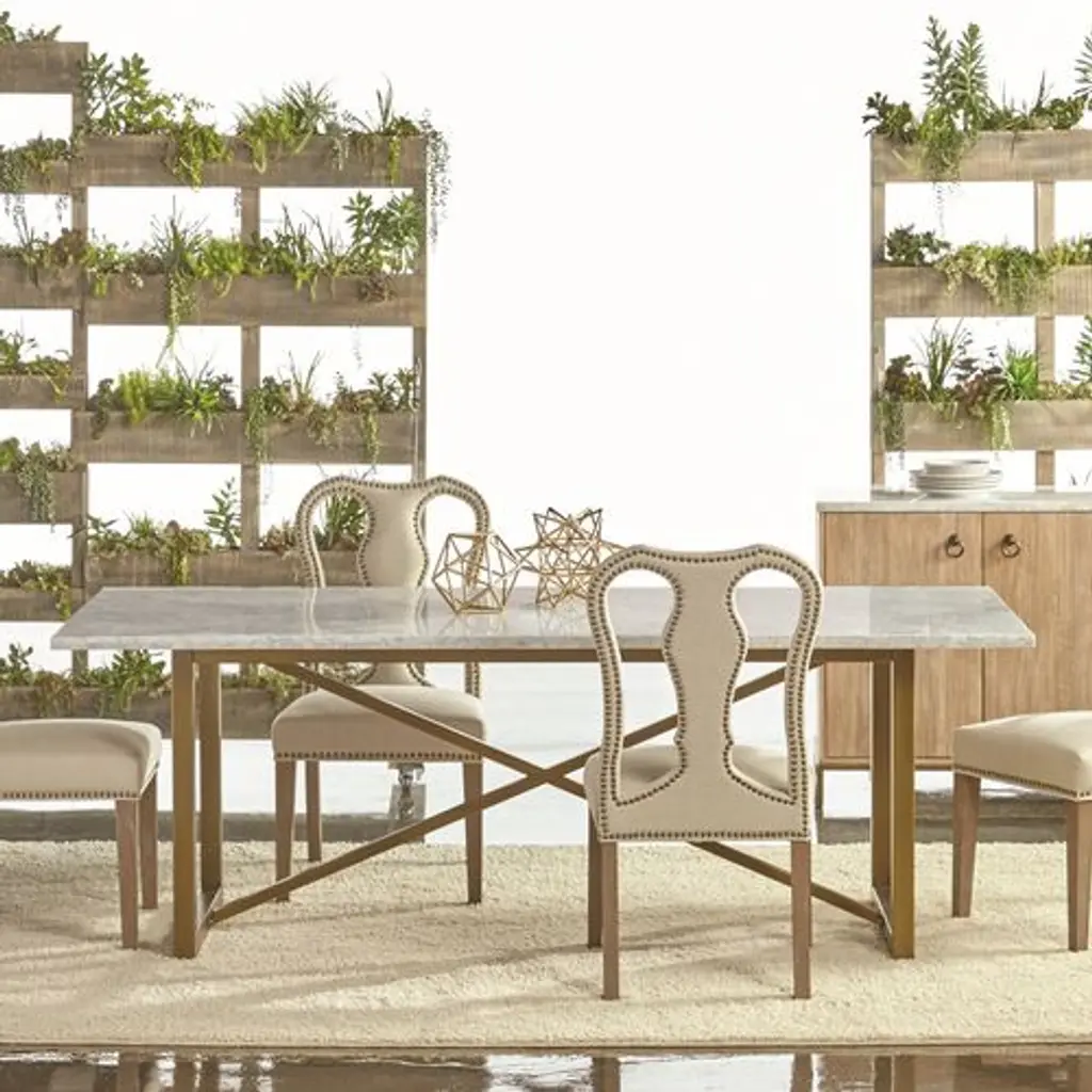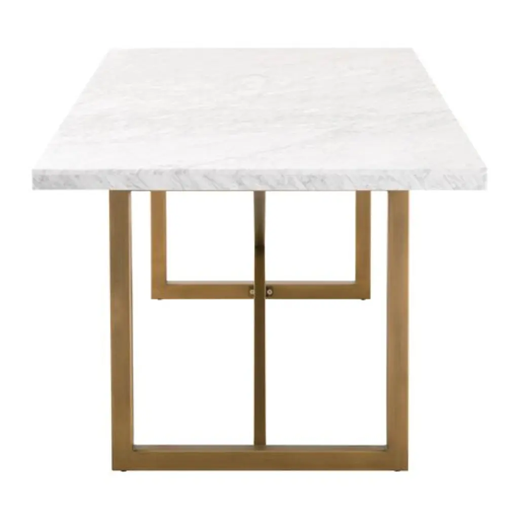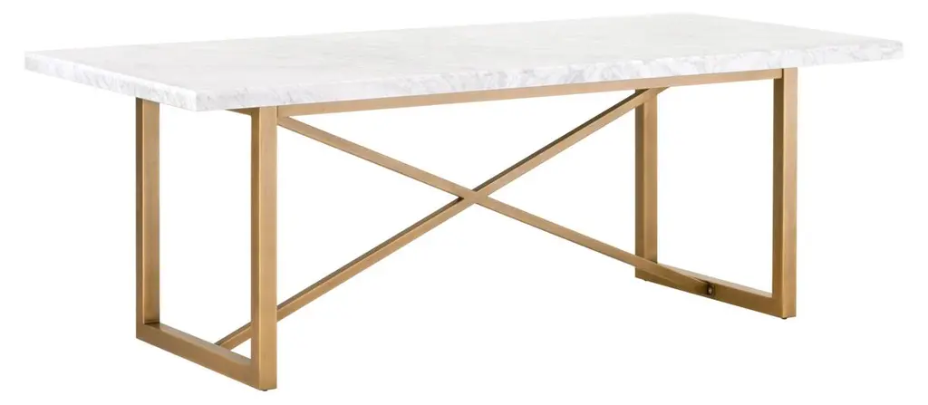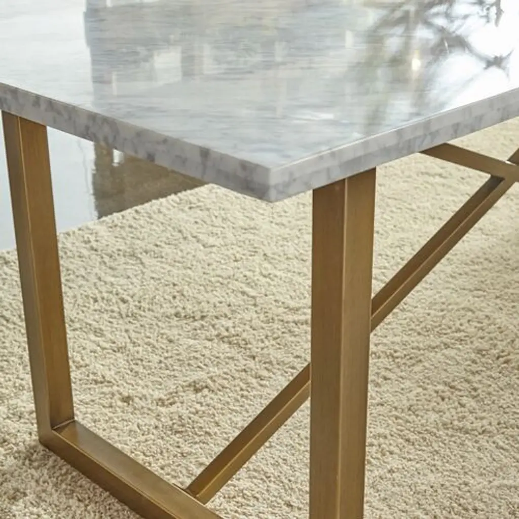A durable top made of Carrara marble veneer rests upon this dining table's open steel framework, which has been given a luxe golden finish. Seats up to eight people in style and comfort.