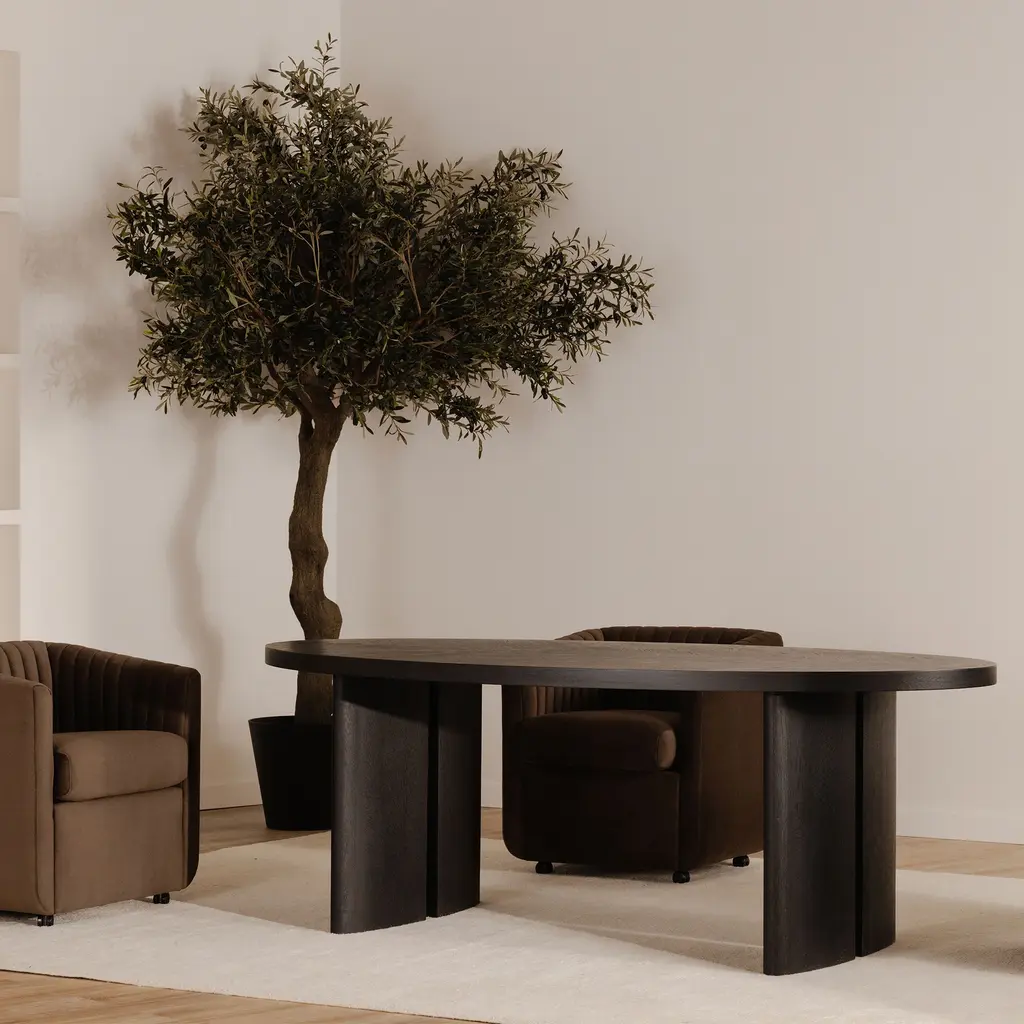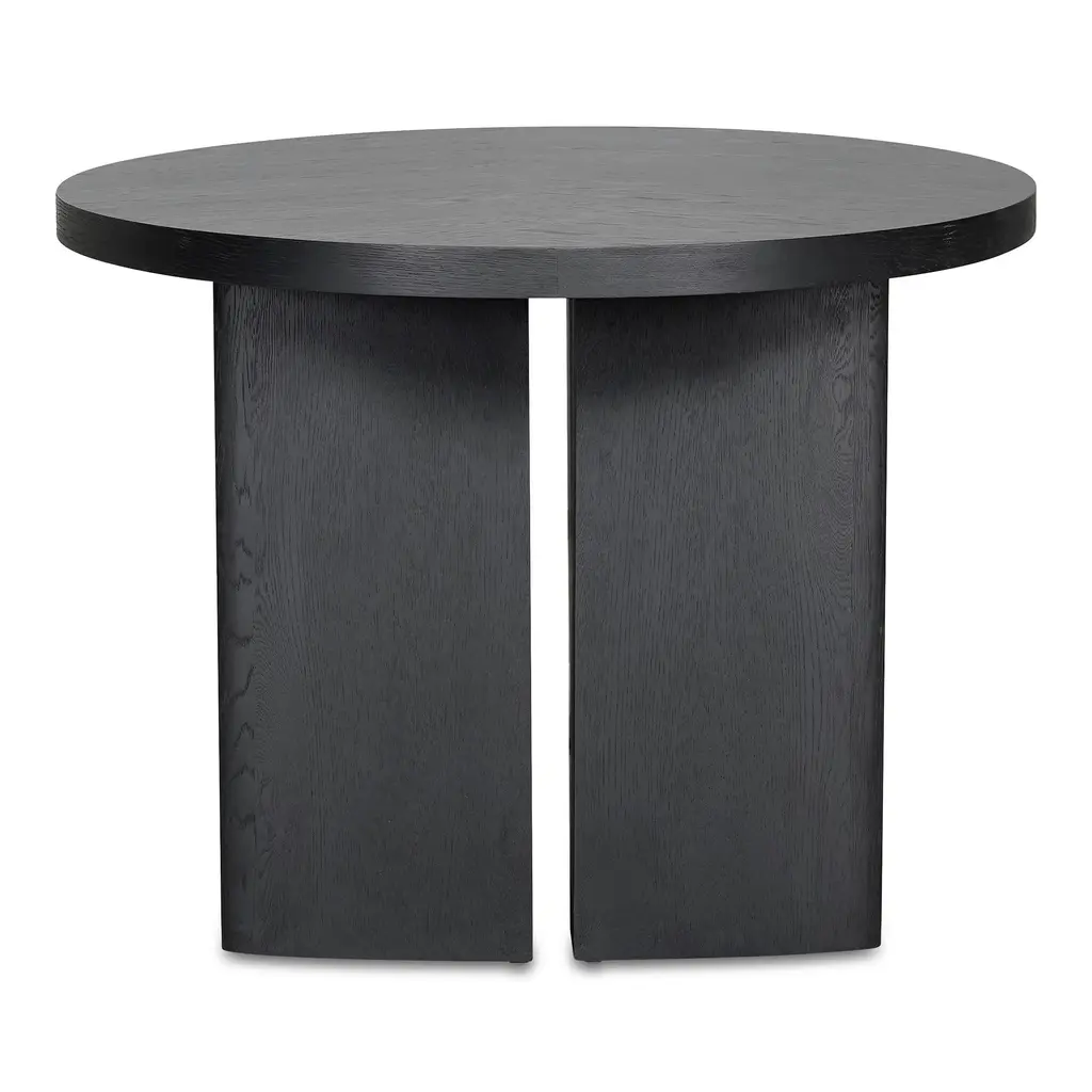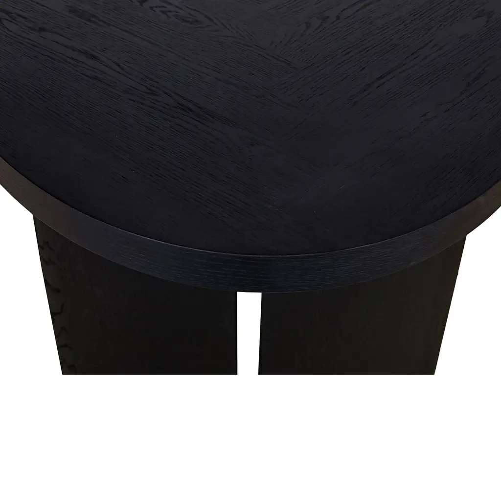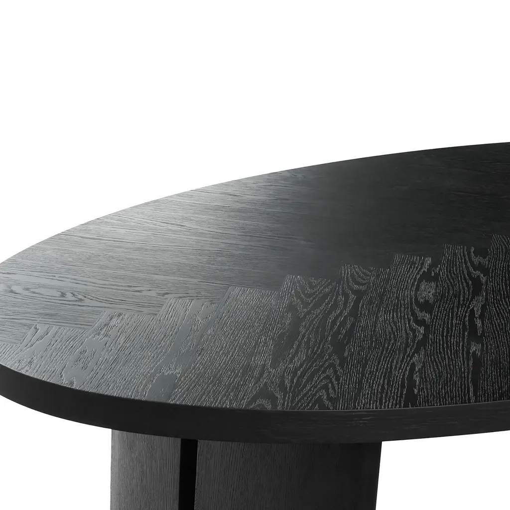 Simple silhouette with rounded-edges embodies modern sophistication. Intricately detailed herringbone pattern tabletop. Rich black stain adds a mature and luxurious feel. Suitable for parties big and small.