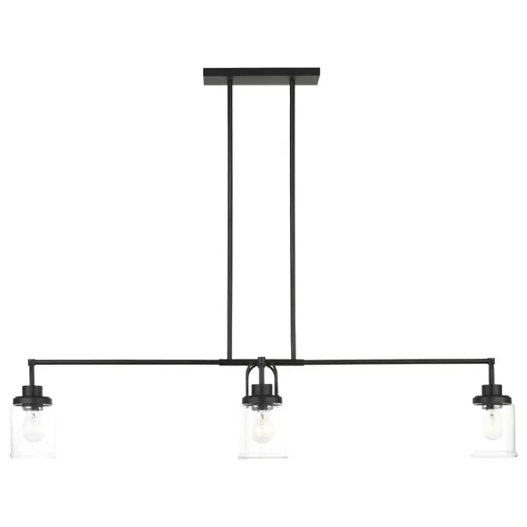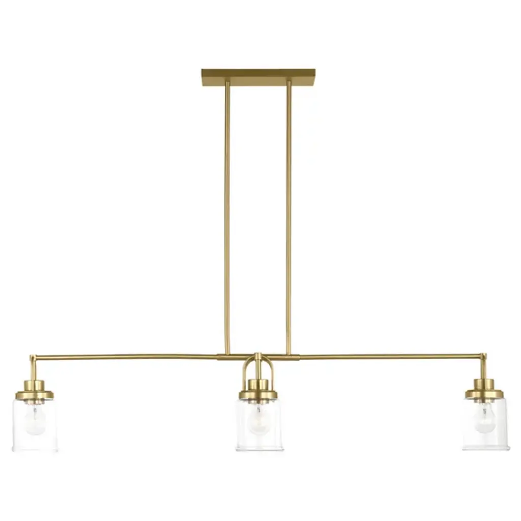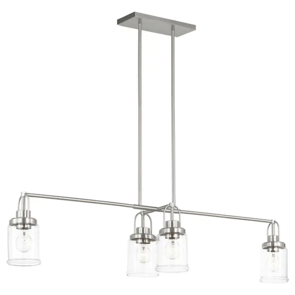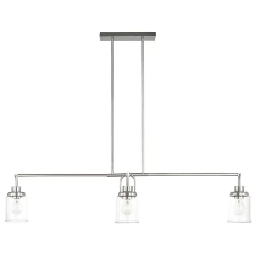 The Anders Linear Suspension from Visual Comfort Studio adapts the series' industrial-inspired aesthetic to a horizontal format ideal for longer spaces. This linear fixture features clear glass shades that maintain openness while directing light downward onto surfaces below. Its dimmable functionality offers lighting flexibility to accommodate different moods and activities. All ceiling mounting hardware comes included for straightforward installation over kitchen islands, dining tables, or in hallways where the suspension's linear presence helps define and illuminate the space. Its transitional design language works well in diverse interior styles, from contemporary to more traditional settings.