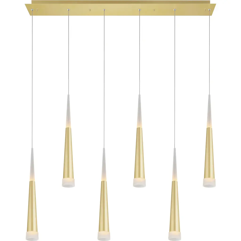 Turn up the luxe with the Andes 40" Satin Gold LED Pool Table Light. Designed with clean lines and a bold geometric profile, this oversized fixture instantly modernizes any space with its sleek silhouette and upscale satin gold finish. Perfect for a game room, kitchen island, or dining room, this 6-light integrated LED chandelier provides bright, energy-efficient illumination while making a stylish statement. Whether you're entertaining or unwinding, this light brings warmth, personality, and function to your space. Finish: Satin Gold Fixture Width: 40" Light Count: Integrated LED (6-Light) Bulb Base: N/A Integrated LED Style: Contemporary / Modern / Luxe Mount Type: Down Chandelier