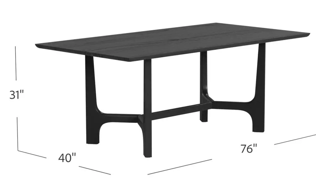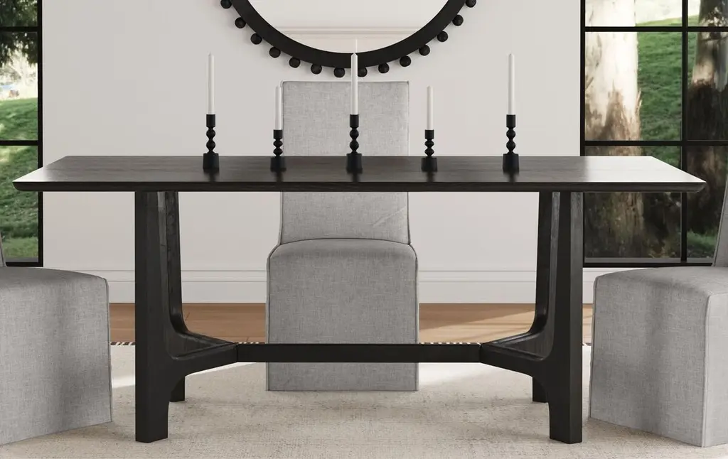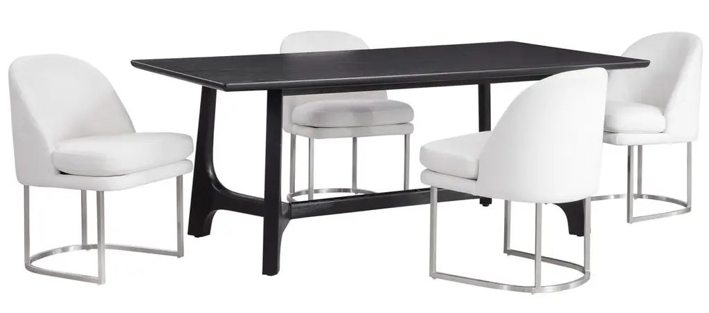 The Andrea Dining Table showcases modern styling with an organic architectural inspired design. The table's base features a unique look with curving on the inside and straight lines on the outside. It includes adjustable floor levelers for an even balance and comfortably seats 6-8 people.