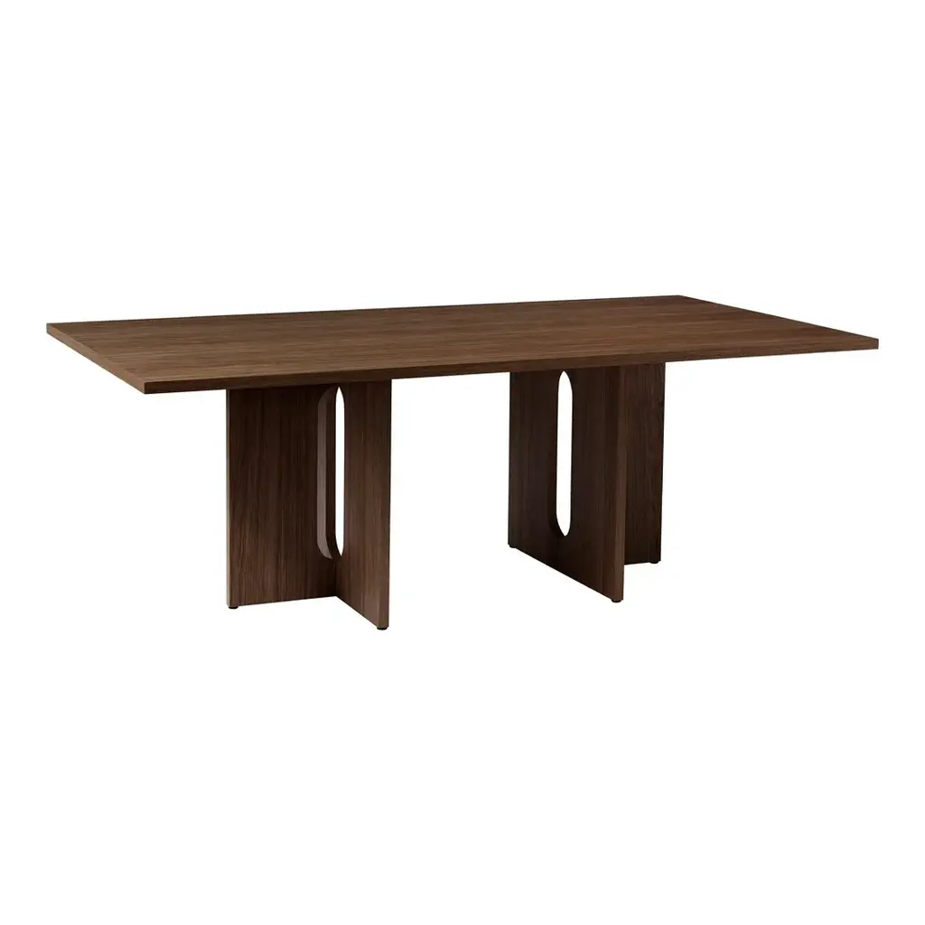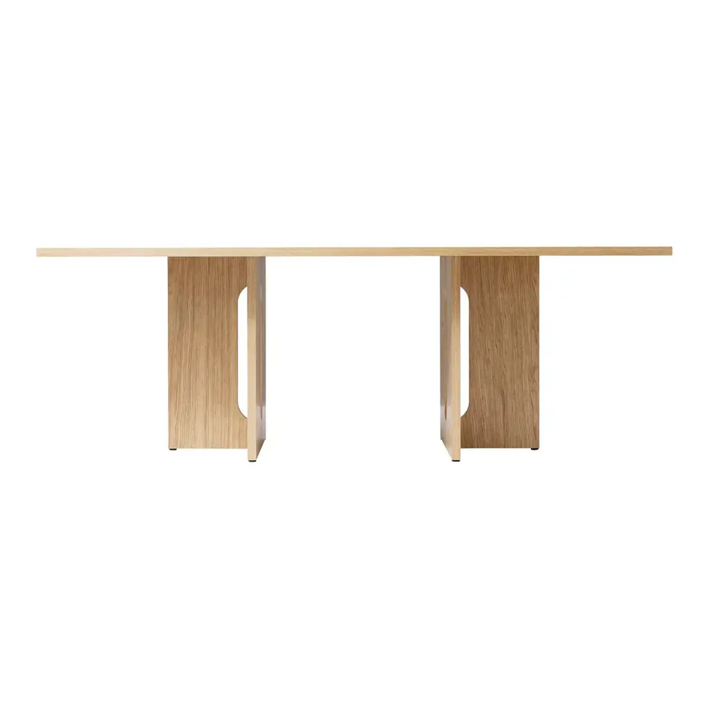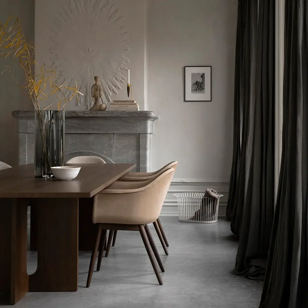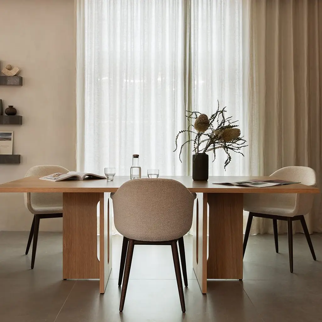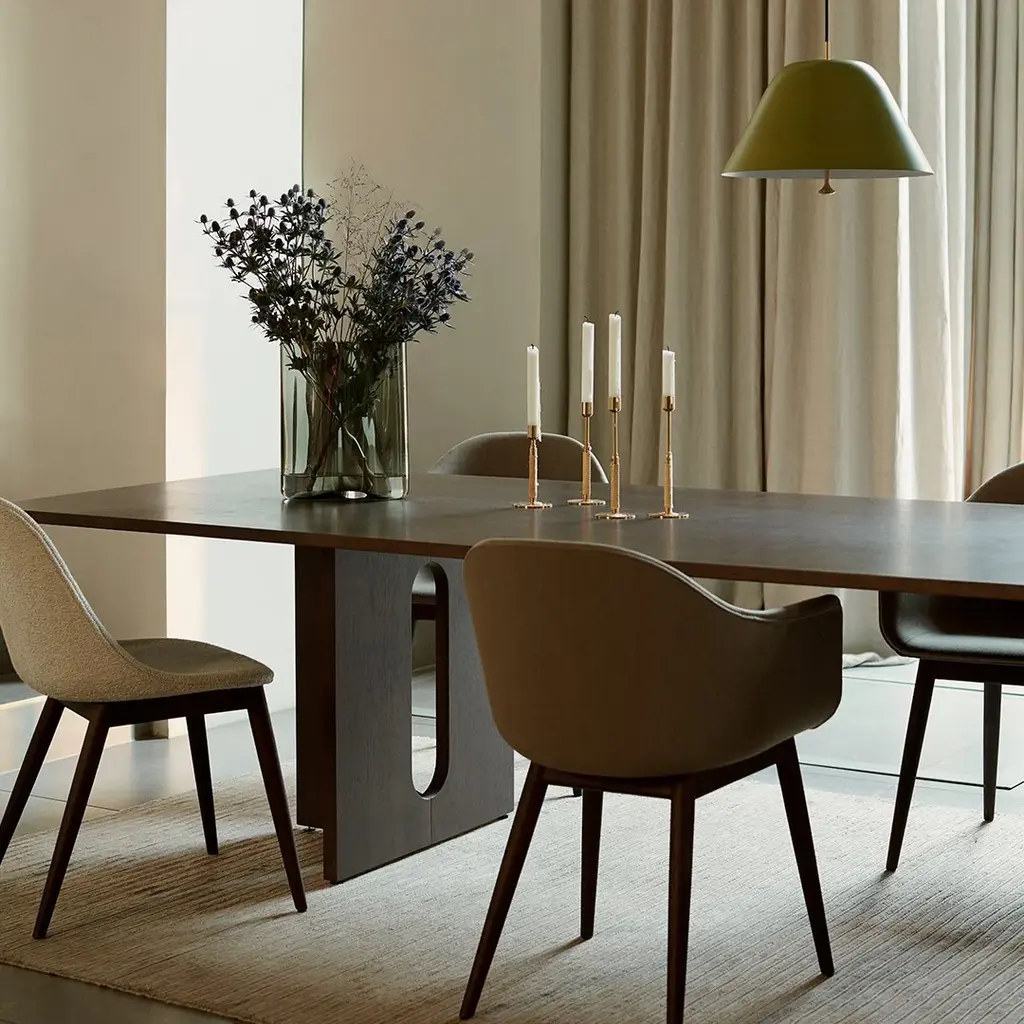 MENU’s Androgyne Collection is distinguished by its playful, yet elegant silhouette and considered combination of natural materials. The invention of the Copenhagen-based Norwegian architect and designer Danielle Siggerud, its blend of the masculine and feminine, true androgyny, is what lends the collection its name. Like a magnificent monument, the new Androgyne Dining Table pairs oak and stone to striking effect. The bold and confident take on a dining table amplifies the silhouette of the collection’s popular side table to grander proportions thanks to an elegant oak base, available in natural or dark stained, and a table top in corresponding wood or kunis breccia, an artistic blend of stones in warm tones that create subtle texture and add a new dimension to the design. A table not for the faint of heart, it makes a characterful accent in any space, from a domestic dining room to a modern restaurant or office gathering point, and serves multiple functions to bring a timeless quality to the design.