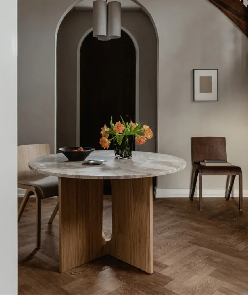 Audo Copenhagen’s Androgyne Collection is distinguished by its playful, yet elegant silhouette and considered combination of natural materials. The invention of the Copenhagen-based Norwegian architect and designer Danielle Siggerud, its blend of the masculine and feminine, true androgyny, is what lends the collection its name. Like a magnificent monument, the new Androgyne Dining Table pairs oak and stone to striking effect. The bold and confident take on a dining table amplifies the silhouette of the collection’s popular side table to grander proportions thanks to an elegant oak base, available in natural or dark stained, and a table top in corresponding wood or kunis breccia, an artistic blend of stones in warm tones that create subtle texture and add a new dimension to the design. A table not for the faint of heart, it makes a characterful accent in any space, from a domestic dining room to a modern restaurant or office gathering point, and serves multiple functions to bring a timeless quality to the design. "The Androgyne Collection has always been about honouring perfectly executed joinery and celebrating natural materials. The use of rich, warm oak makes it easy to pair the dining table with any interior style, and the wood will age gracefully over time. I envisage the table in a home space, as a natural gathering point that allows people to come together in different ways.” Danielle Siggerud