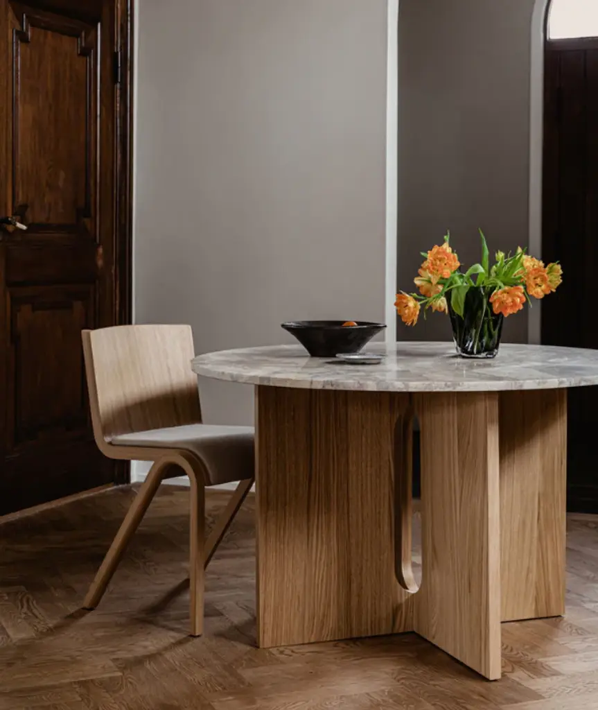 Audo Copenhagen’s Androgyne Collection is distinguished by its playful, yet elegant silhouette and considered combination of natural materials. The invention of the Copenhagen-based Norwegian architect and designer Danielle Siggerud, its blend of the masculine and feminine, true androgyny, is what lends the collection its name. Like a magnificent monument, the new Androgyne Dining Table pairs oak and stone to striking effect. The bold and confident take on a dining table amplifies the silhouette of the collection’s popular side table to grander proportions thanks to an elegant oak base, available in natural or dark stained, and a table top in corresponding wood or kunis breccia, an artistic blend of stones in warm tones that create subtle texture and add a new dimension to the design. A table not for the faint of heart, it makes a characterful accent in any space, from a domestic dining room to a modern restaurant or office gathering point, and serves multiple functions to bring a timeless quality to the design. "The Androgyne Collection has always been about honouring perfectly executed joinery and celebrating natural materials. The use of rich, warm oak makes it easy to pair the dining table with any interior style, and the wood will age gracefully over time. I envisage the table in a home space, as a natural gathering point that allows people to come together in different ways.” Danielle Siggerud