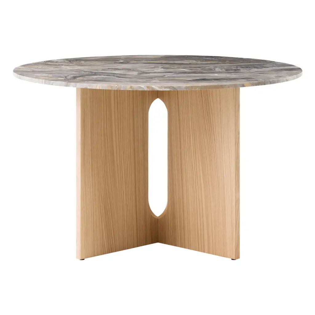 Audo Copenhagen’s Androgyne dining table is a charming combination of contrasting features. Crafted from natural oak and unique Gray Galaxy marble, the table plays with feminine and masculine elements, soft cuts and sharp edges, as well as simple and bold silhouettes. Designed by Danielle Siggerud, the harmonious, stable look of the Androgyne table is a focal point of the dining area, equally pleasing to use and to gaze upon.