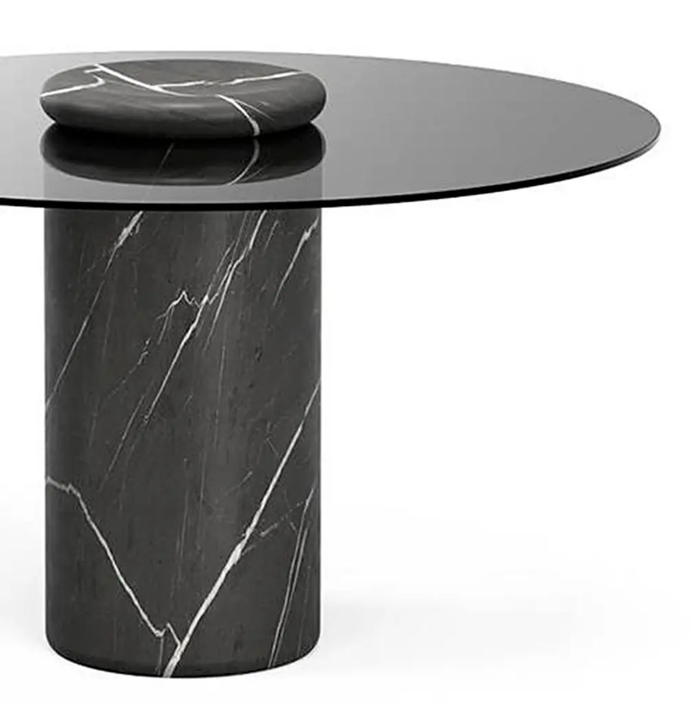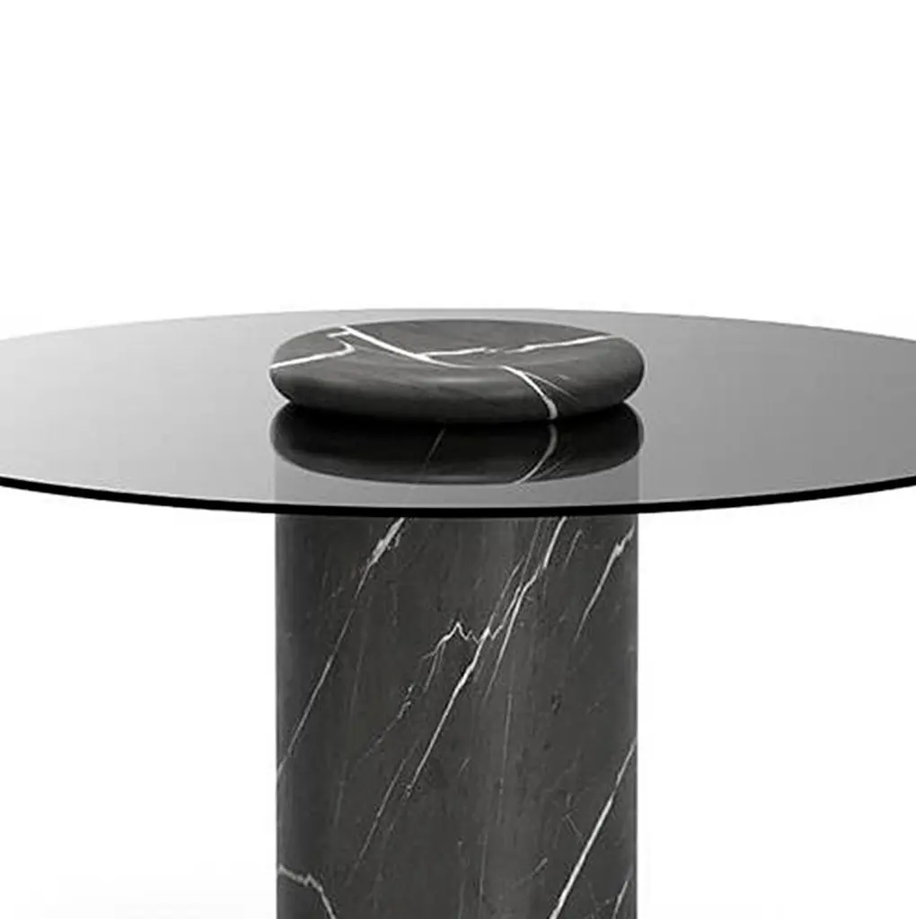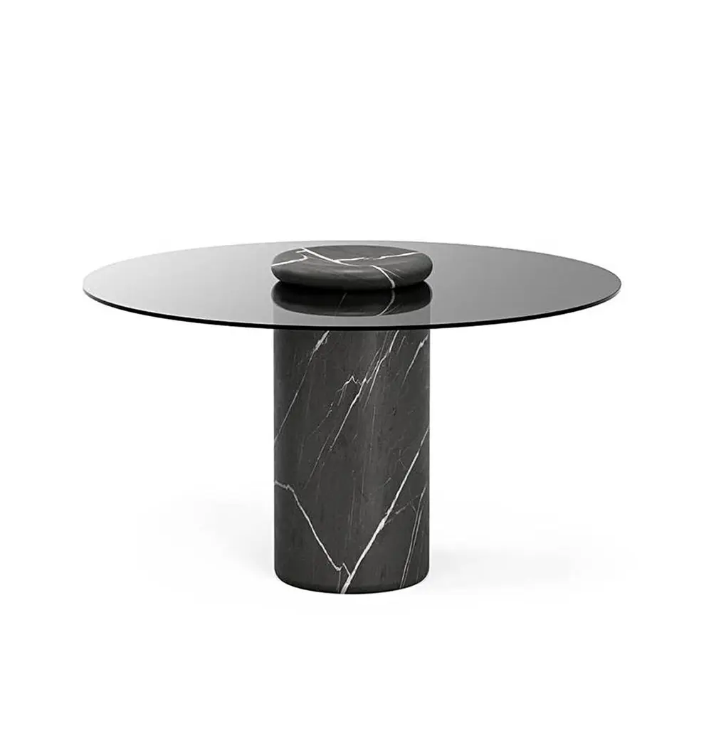 Table designed by Angelo Mangiarotti.Castore is a glass and marble table by Italian architect, sculptor and designer Angelo Mangiarotti. Designed in 1975 for Sorgente dei Mobili, the distinct design is now presented by Karakter, available as a 130cm dining table.The round glass top rests on a heavy marble pillar, and visually, Mangiarotti would have it seem that only a small marble bowl on top of the glass plate is holding it in place. The rounded corners on both the pillar and the bowl ads a sense of softness to the otherwise heavy aesthetics of the marble.The marble bowl can be removed and used as an individual element. However, keeping it as an integral part of the design, you can enjoy additional rounded corners, as the bowl reflects in the glass table top.Important information regarding images of products:Please note that some of the images show other colors and variations of the model, these images are only to present interior design proposals. The item that is selling is on the first image. Important information regarding color(s) of products:Actual colors may vary. This is due to the fact that every computer monitor, laptop, tablet and phone screen has a different capability to display colors and that everyone sees these colors differently. We try to edit our photos to show all of our products as life-like as possible, but please understand the actual color may vary slightly from your monitorAbout the designer:Italian architect, sculptor and designer Angelo Mangiarotti was born in Milan in 1921. Mangiarotti is quoted to have said, ”Happiness comes from honesty”. A quote that hints to his overall design approach rooted in the firm belief that architecture was a practical discipline and that industrial design was an expression of fine craftsmanship. He wanted each individual material to be respected and to be used in an appropriate and honest way. Beyond his many architectural feats, Mangiarotti’s body of work boasts a wide array of creative projects from sculpture, to products and lighting. Over the course of his career, he held lecturing positions at a number of distinguished design and architecture schools in Italy and abroad, he won numerous awards in both design and architecture, and his work has been included in exhibitions and collections at some of the world’s leading art and design institutions such as Centre Pompidou in Paris, Triennale Design Museum in Milan and Gallery MA in Tokyo.About the manufacturer:Karakter is a Danish design company founded on a spirit of exploration, courage and an uncompromising attitude to quality. Rooted in the Scandinavian design tradition with an international outlook, Karakter presents a portfolio of furniture, lighting and objects that is relevant, honest, expressive and sometimes playful. Aspiring to build an enduring legacy, they work with contemporary designers such as Aldo Bakker and PlueerSmitt and present works by the masters Bodil Kjær, Achille and Pier Giacomo Castiglioni, Paul McCobb, Joe Colombo and Angelo Mangiarotti. Each piece has a clear, undeniable expression, ensuring it pride of place in private homes and public spaces worldwide.