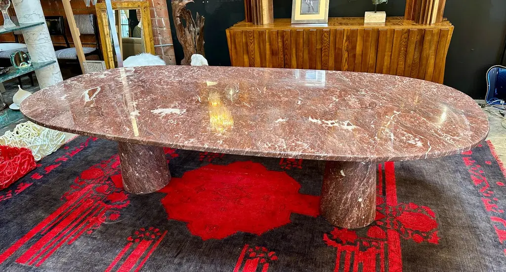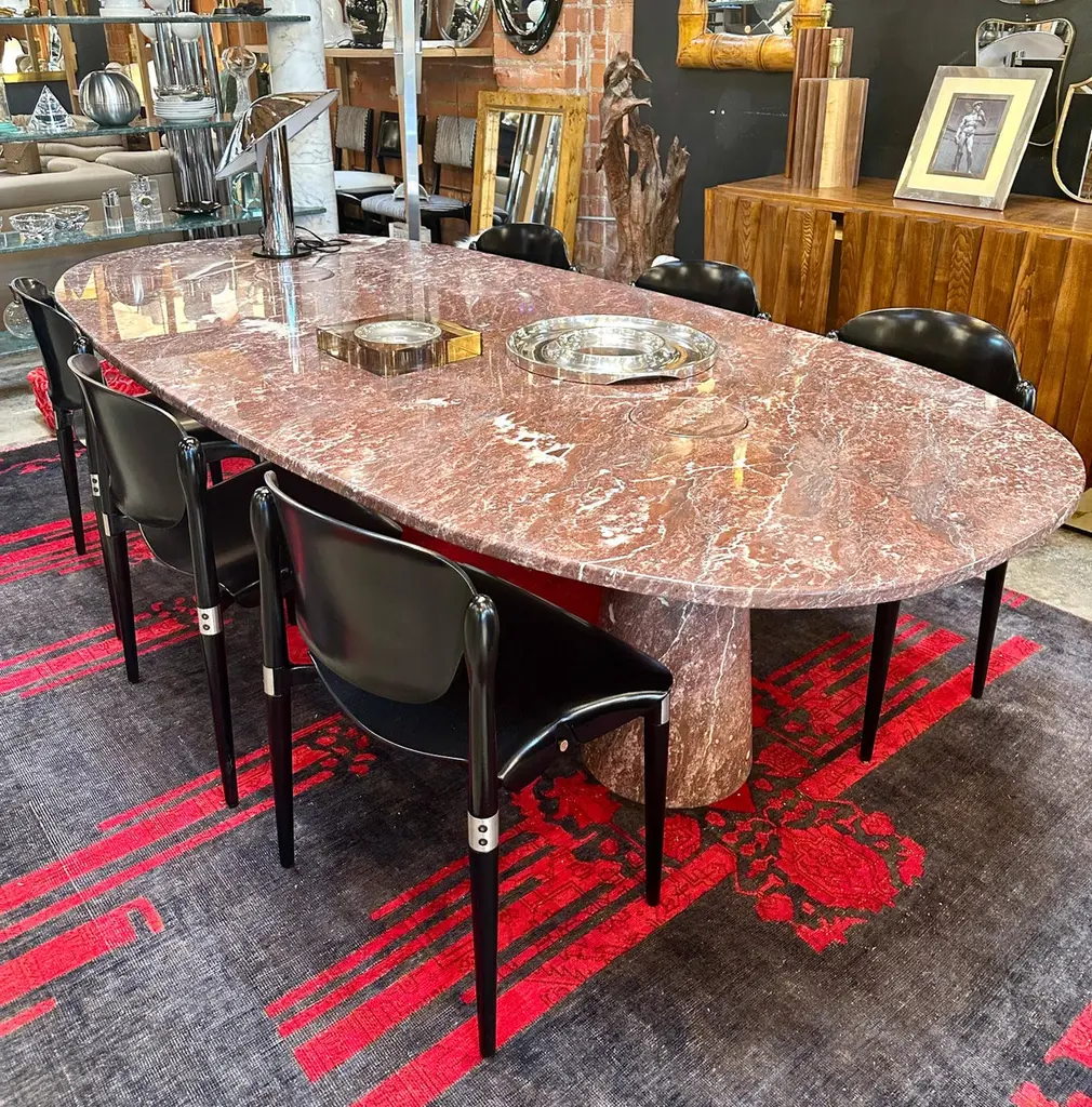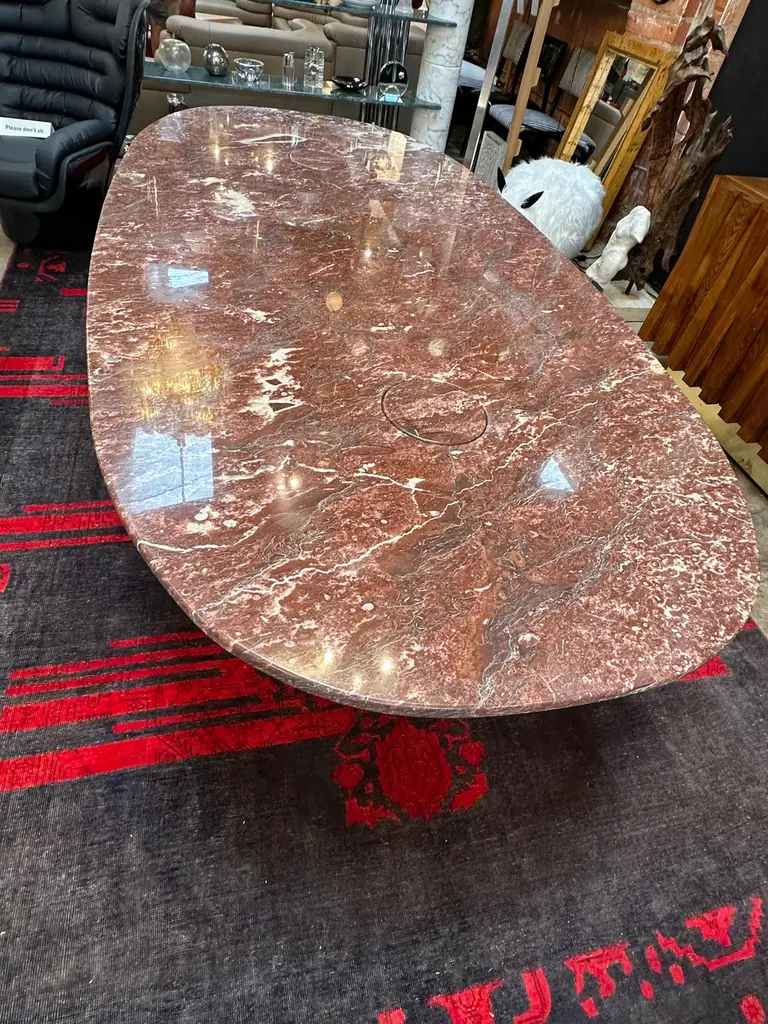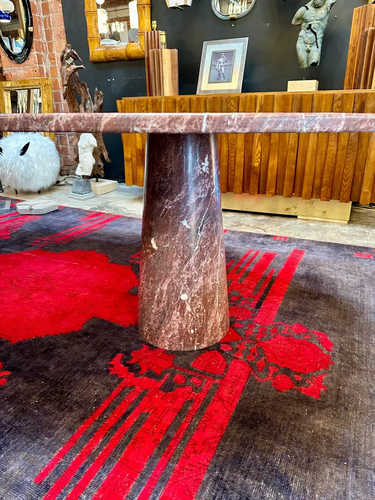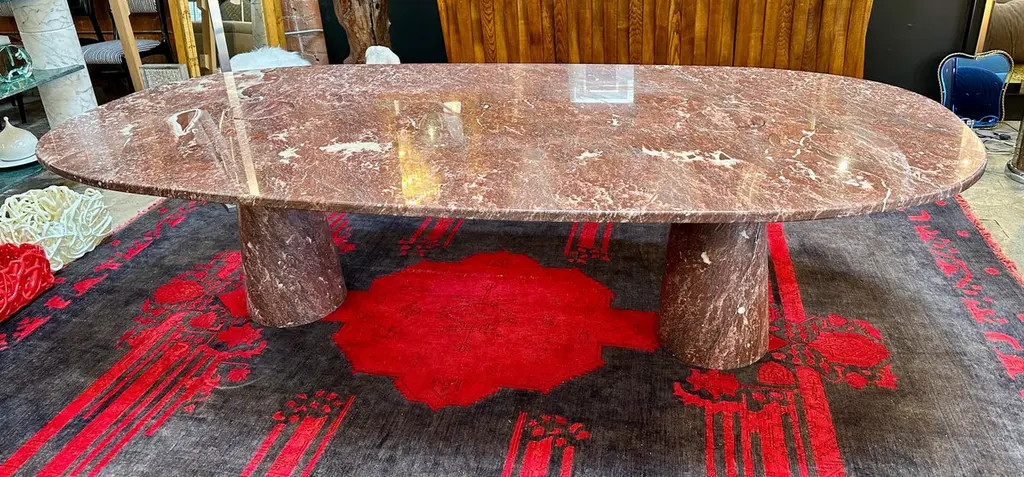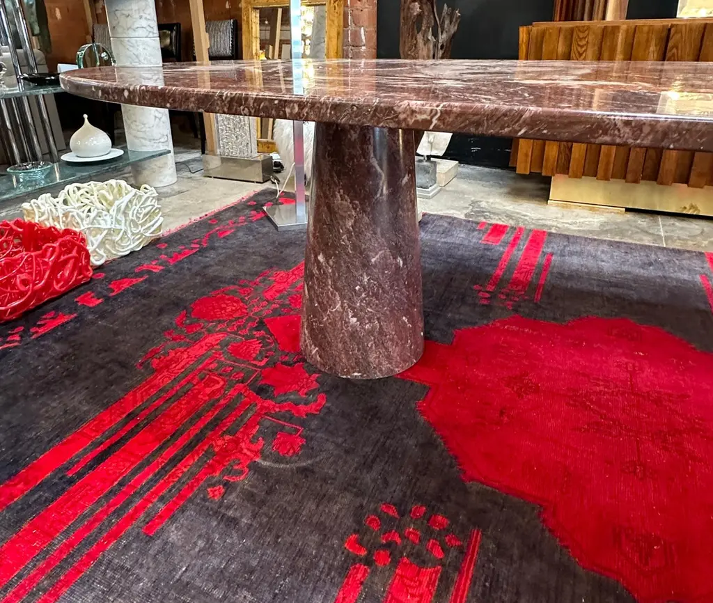 This is a striking oval-shaped marble dining table by Angelo Mangiarotti that showcases a richly colored red-brown marble top with natural white veining, adding elegance and visual interest. The table sits on two cylindrical marble bases, giving it a balanced, sculptural quality and adding to its solid, sturdy appearance. The polished surface of the marble enhances the natural patterns of the stone and reflects the light, adding a touch of sophistication. This table would make a bold centerpiece in any room, blending seamlessly into both modern and traditional interiors. The deep hues and organic patterns of the marble make it a statement piece for luxurious or artistic spaces.
