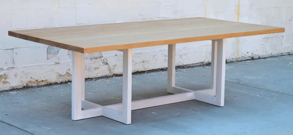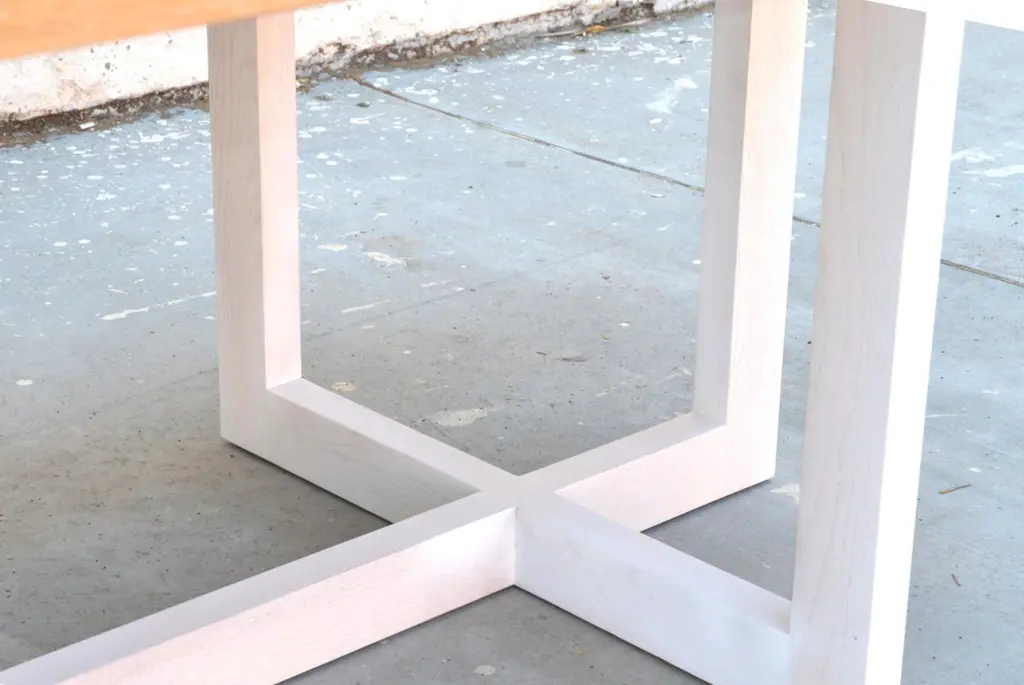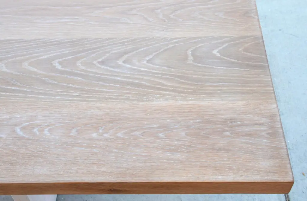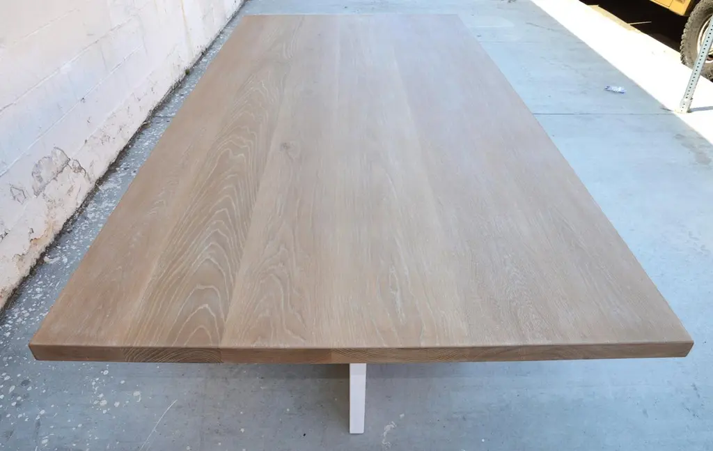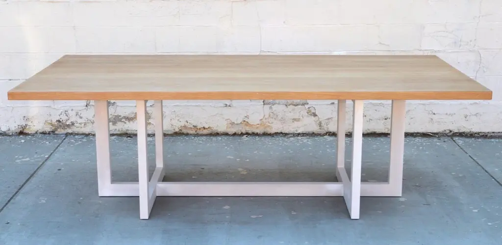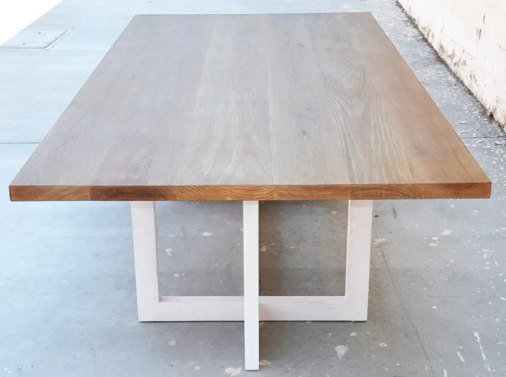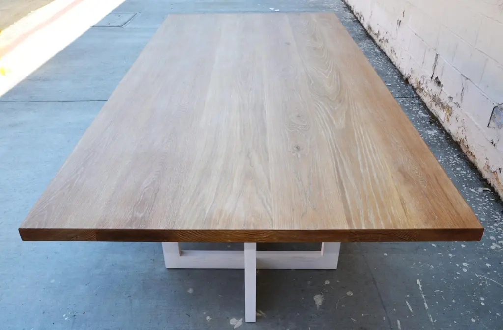 This custom dining table is made from solid, rift-sawn white oak with a "cerused" finish and a painted base. Shown here in 84" x 42" x 30", however this table can be built in any size.Because each table is bench-made in our own Los Angeles workshop you can influence all aspects of design, including size, wood species and finish. We use only traditional carpentry techniques, no nails or metal fasteners of any kind. Just mortise and tenon construction reinforced with handcut wooden dowels.If you require customized overhang dimensions please stipulate with order.